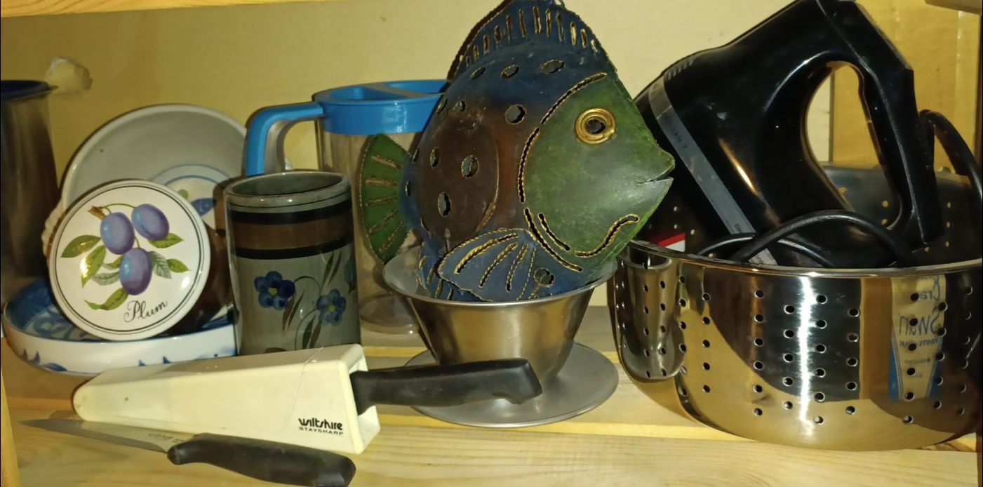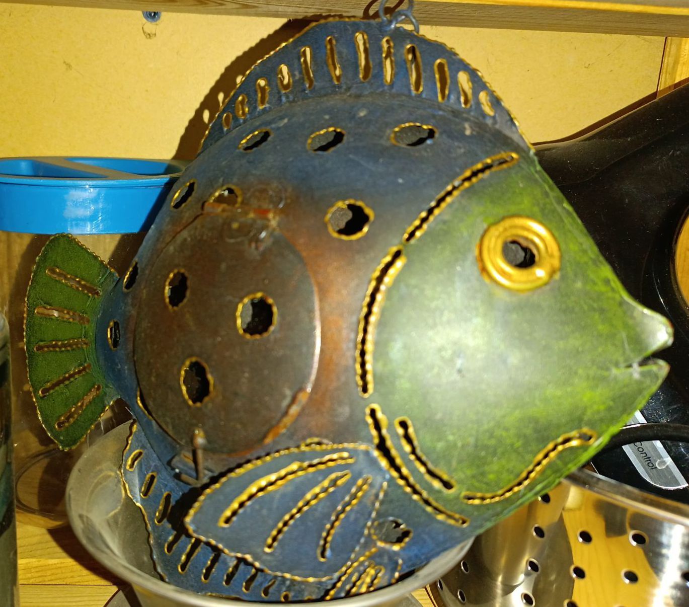 Assortment of Kitchen Items & Decorations Strainer, Mixer, Cannister, Fish Decoration w/Jug & Cup