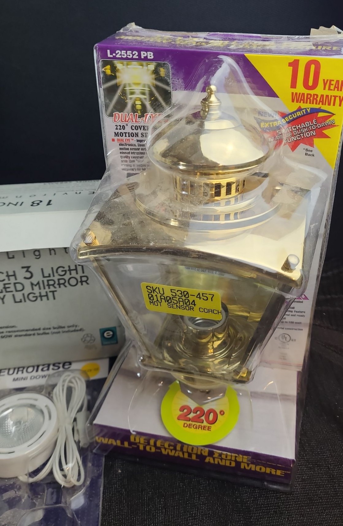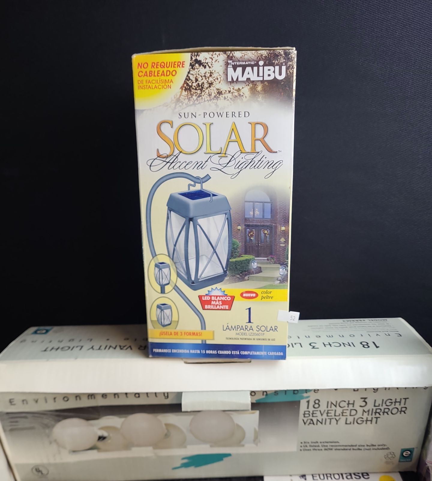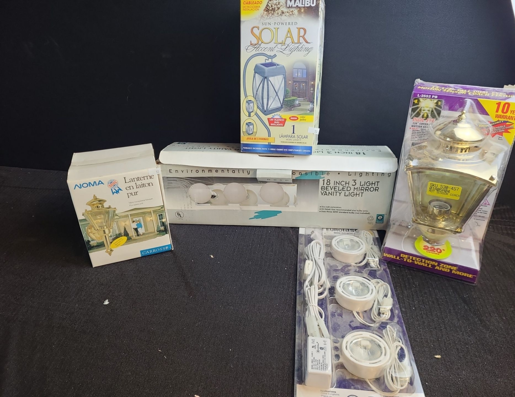 Assortment of Lights: Brass Outdoor Light, Accent Solar Light, Mirrored Vanity Light and More!