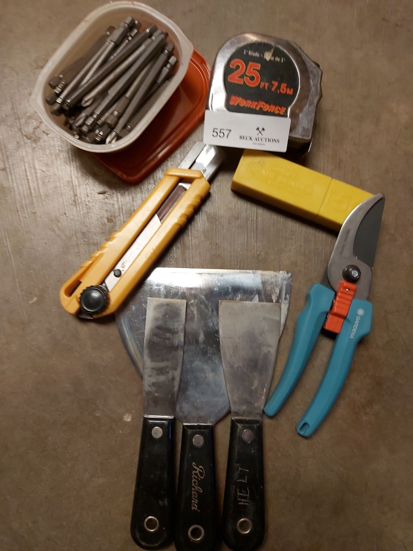 Assortment of Screwdriver bits, Tape Measure, Gardena Pruners, Scrapers, Olfa Knife & more