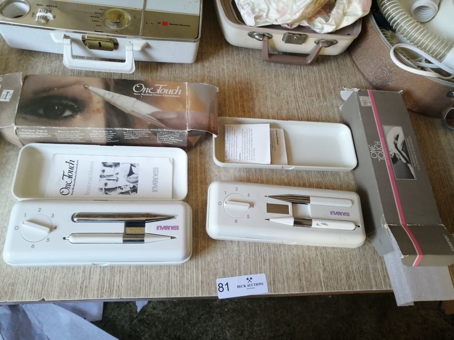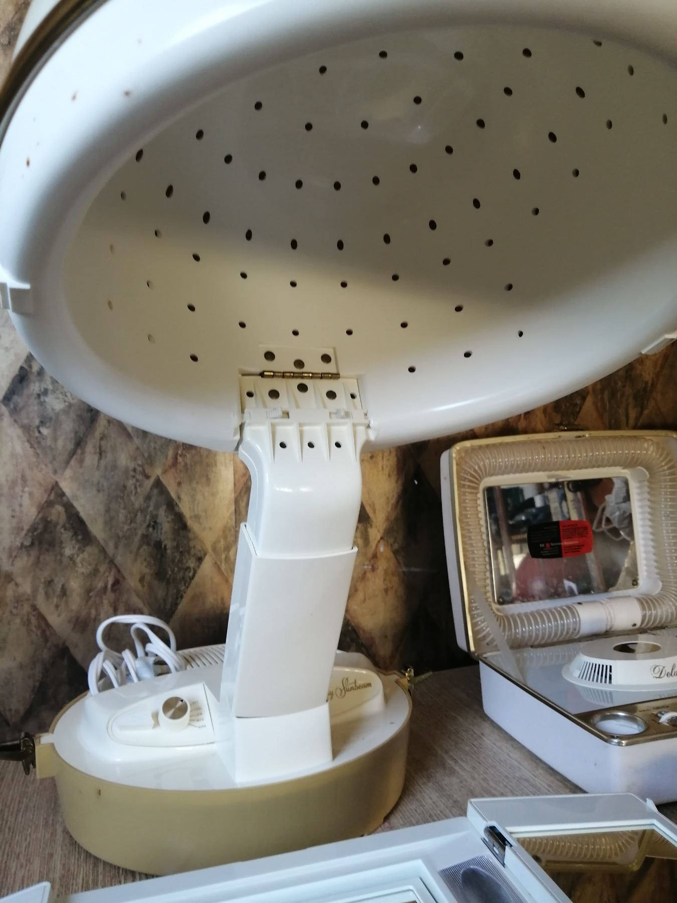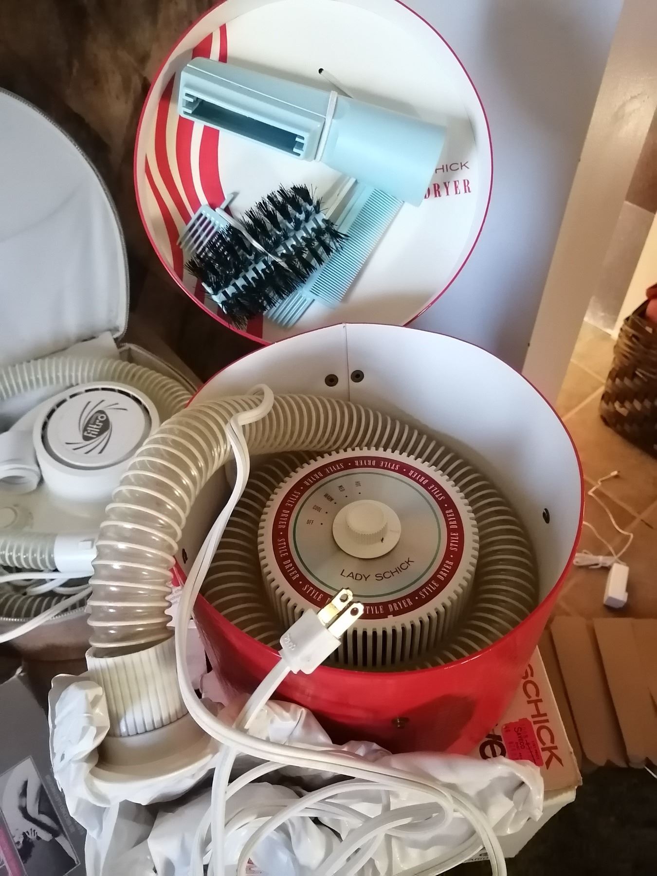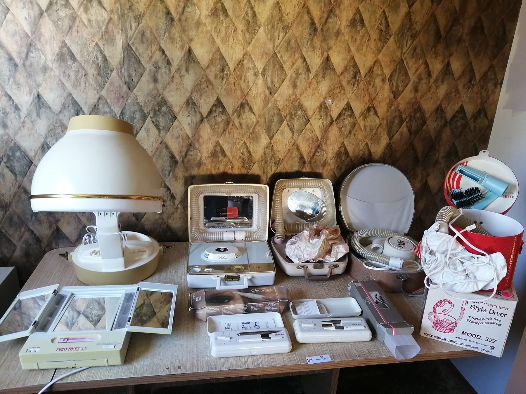 Includes: Many Faces light up mirror, Lady Sunbeam hooded hair dryer, SD Hair/Nail Dryer, 2 x Inverness One Touch Electrolysis hair removal pens, Westinghouse hair/nail dryer (mirror mount broken), Filtro Hair Dryer, and Lady Schick hair dryer/hair styler Model 327