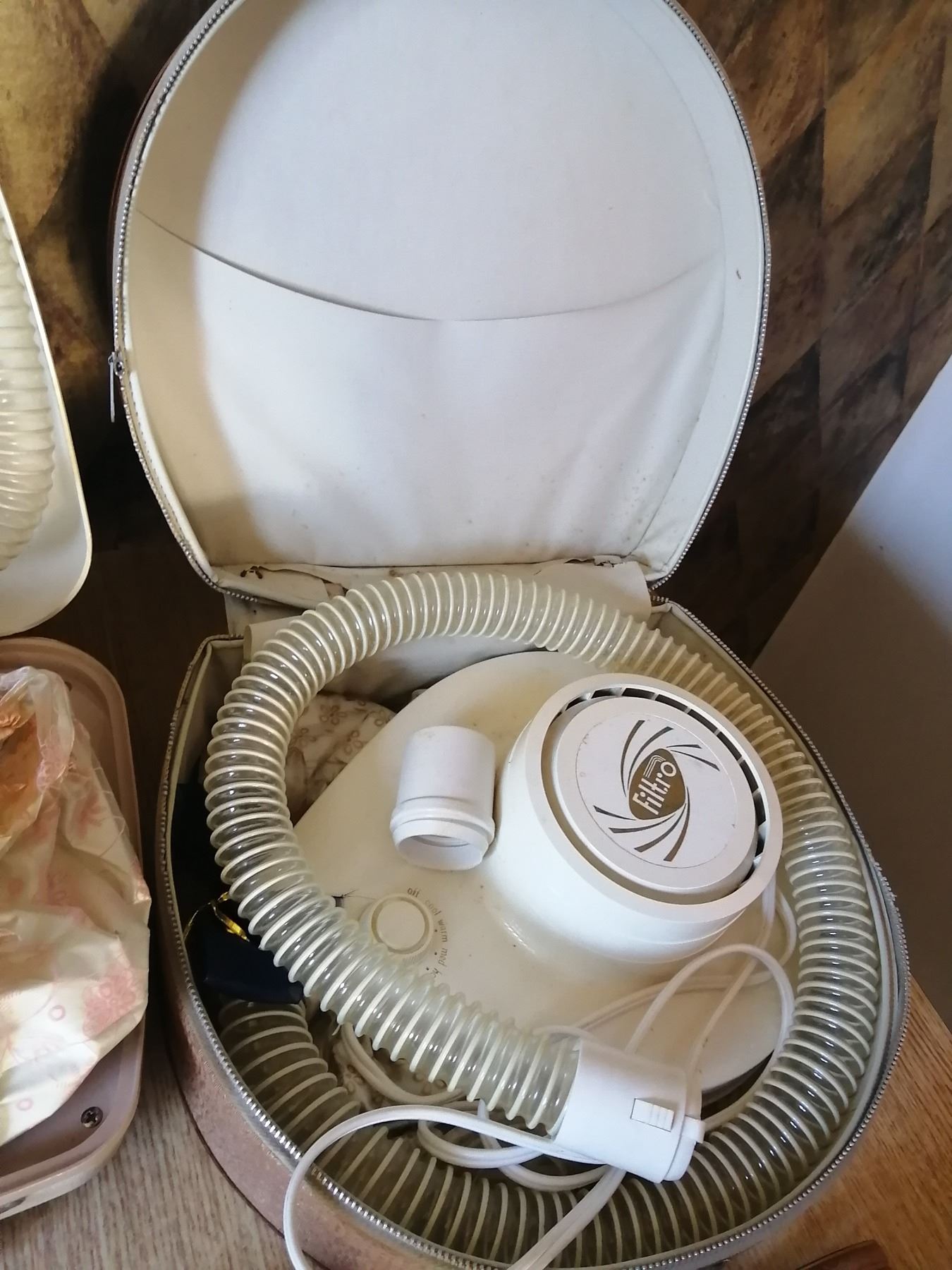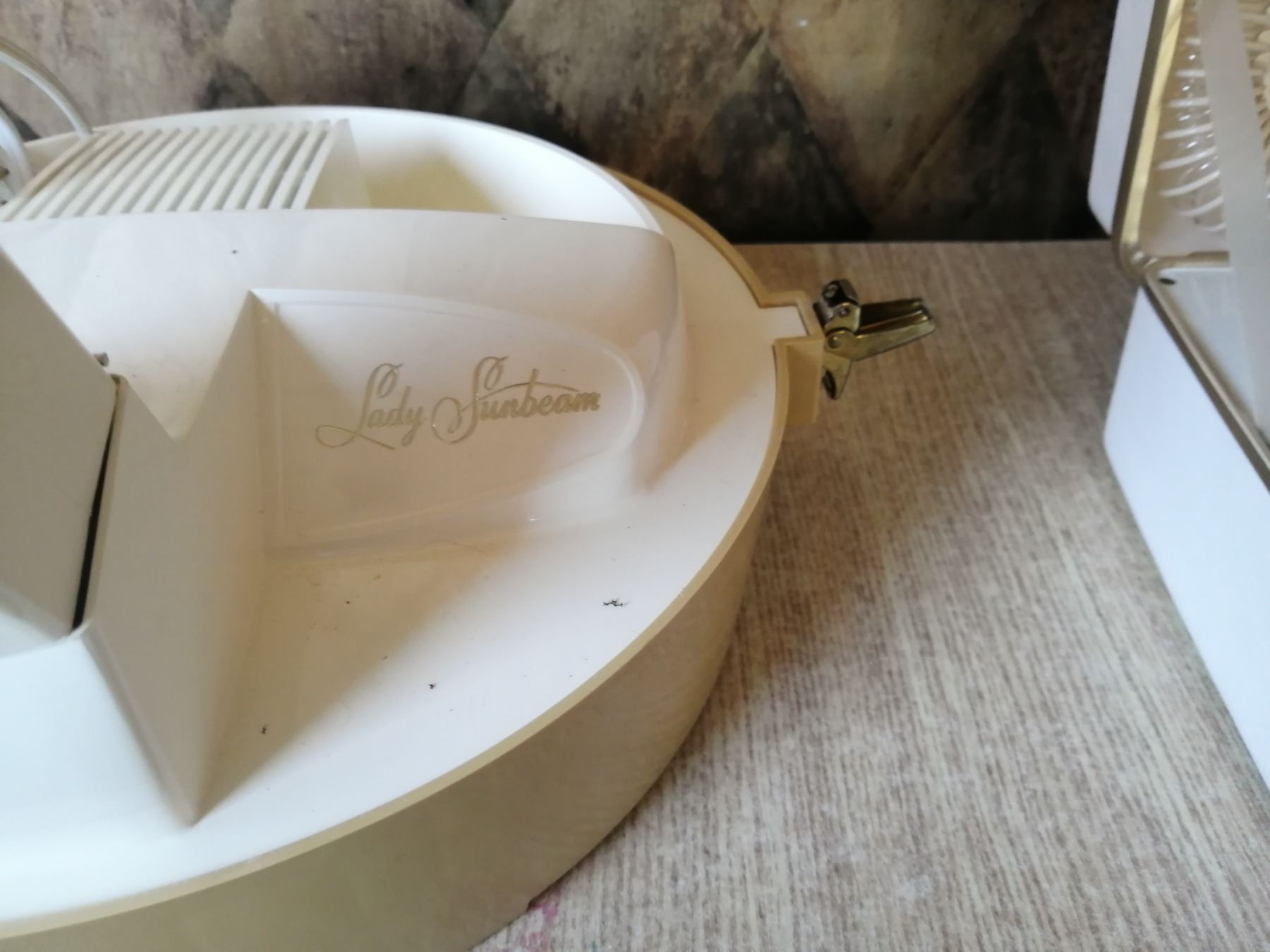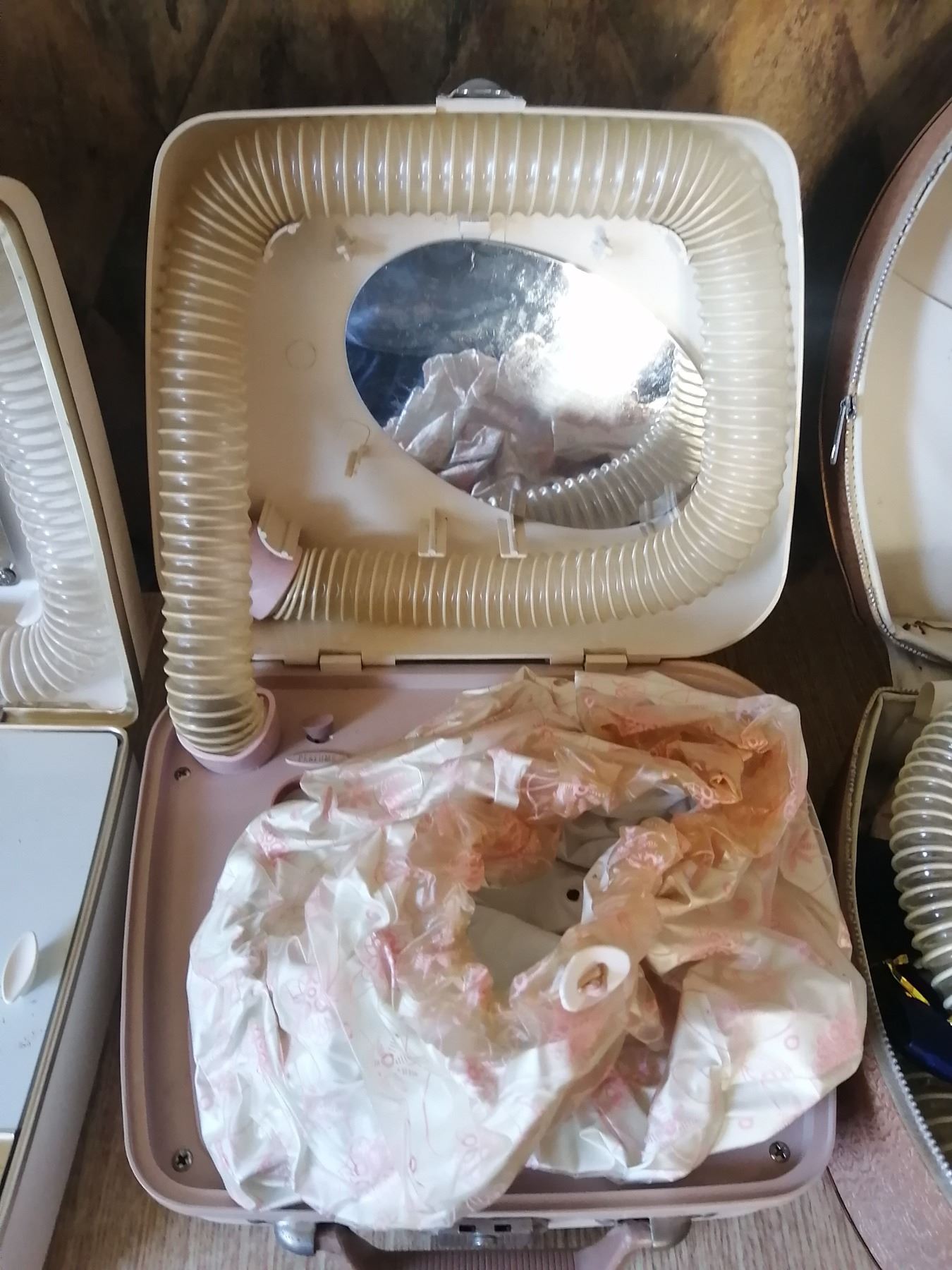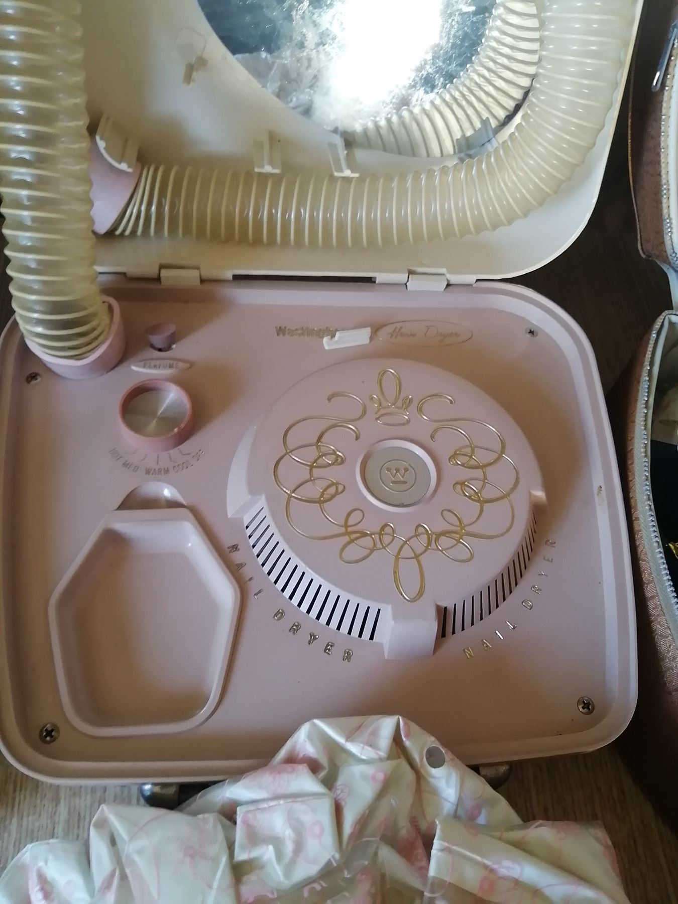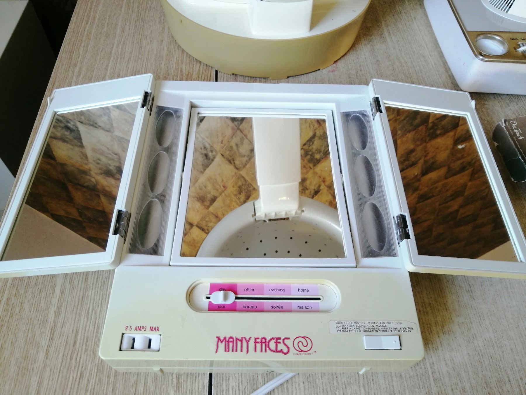 Includes: Many Faces light up mirror, Lady Sunbeam hooded hair dryer, SD Hair/Nail Dryer, 2 x Inverness One Touch Electrolysis hair removal pens, Westinghouse hair/nail dryer (mirror mount broken), Filtro Hair Dryer, and Lady Schick hair dryer/hair styler Model 327