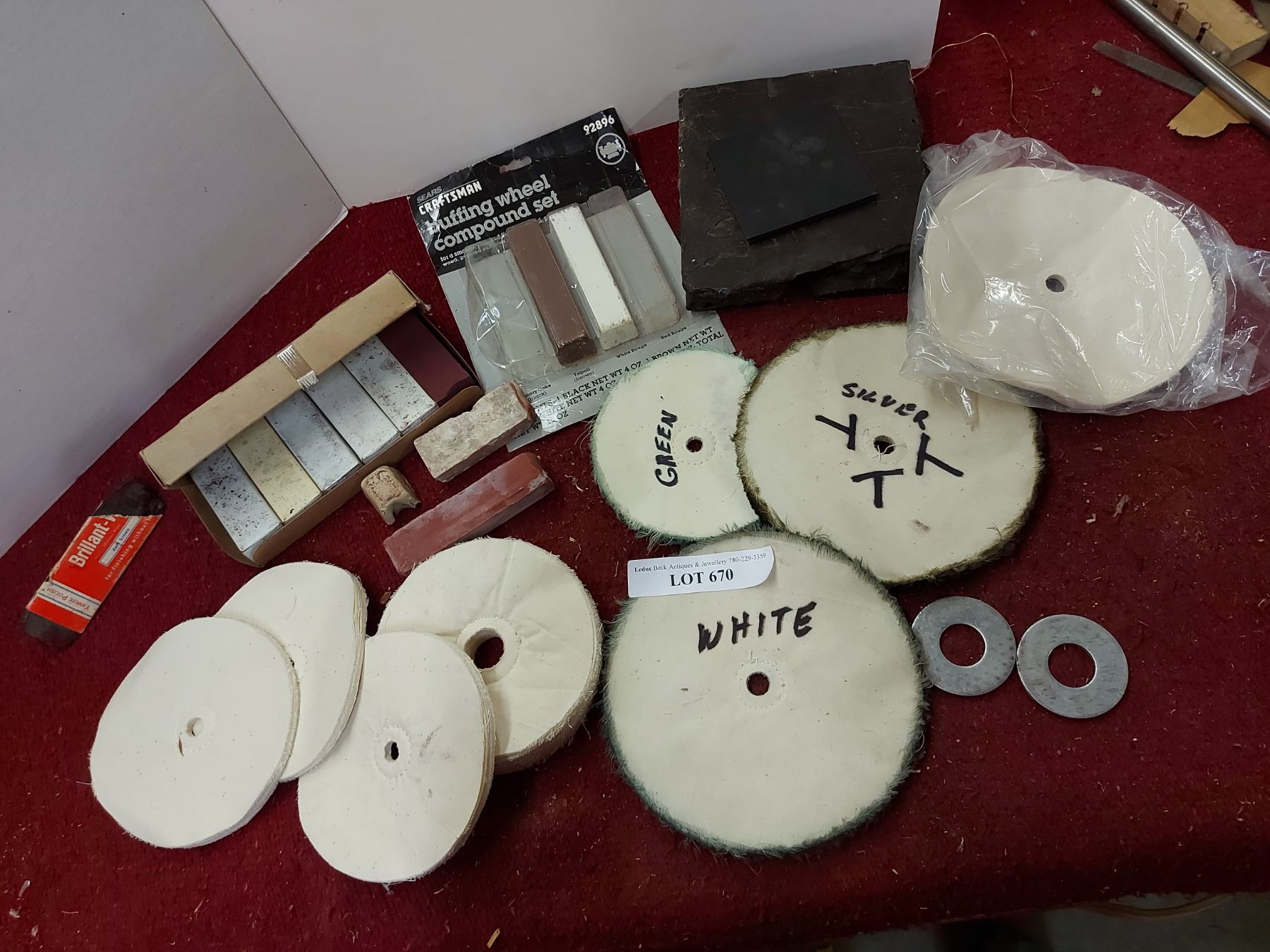 Asst buffing materials incl buffing wheel compound set pcs, asst buffing/polishing pads, colour wax