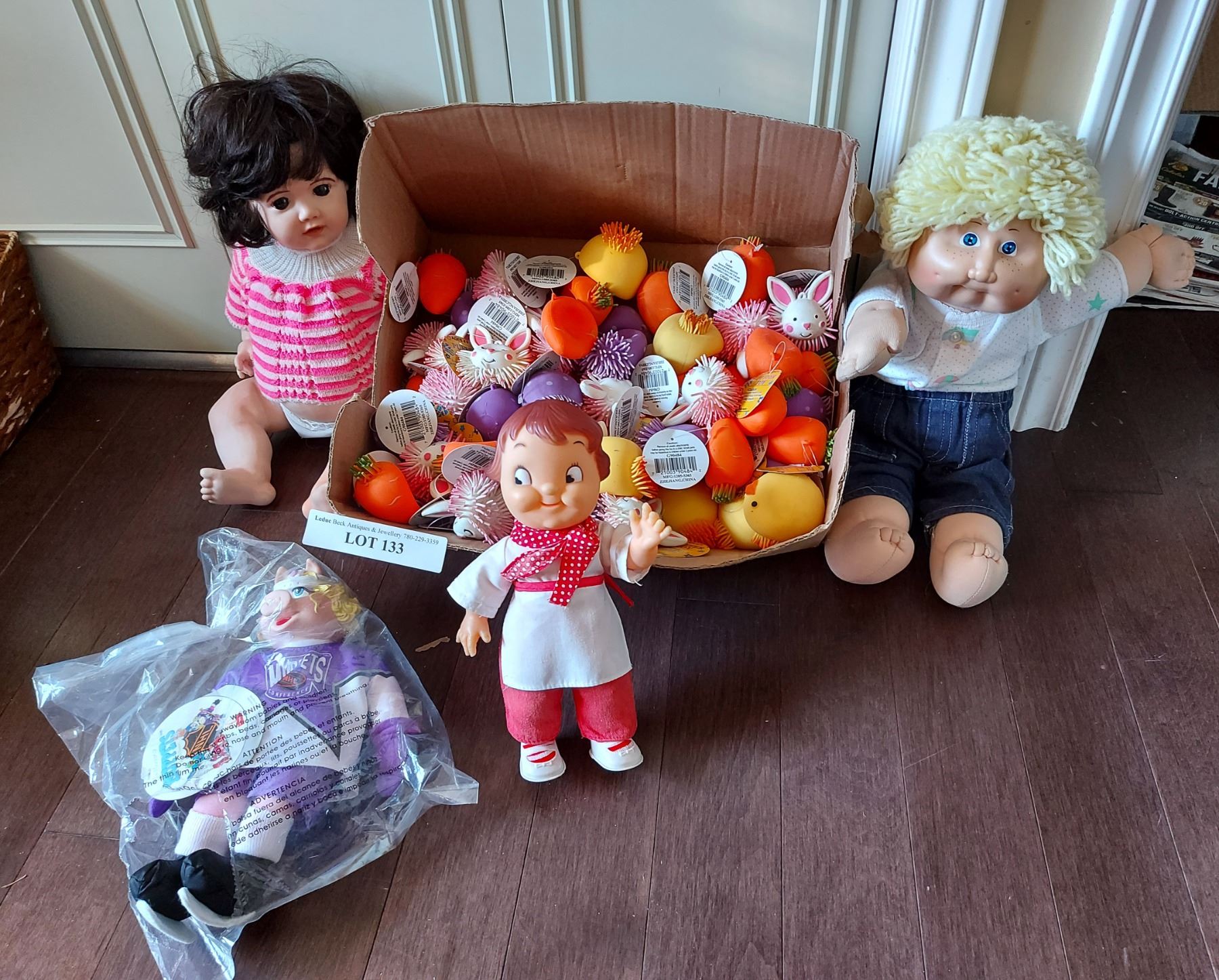 Asst dolls - Cabbage Patch, Campbell Soup, Miss Piggy, porcelain doll with joints. Stress balls.