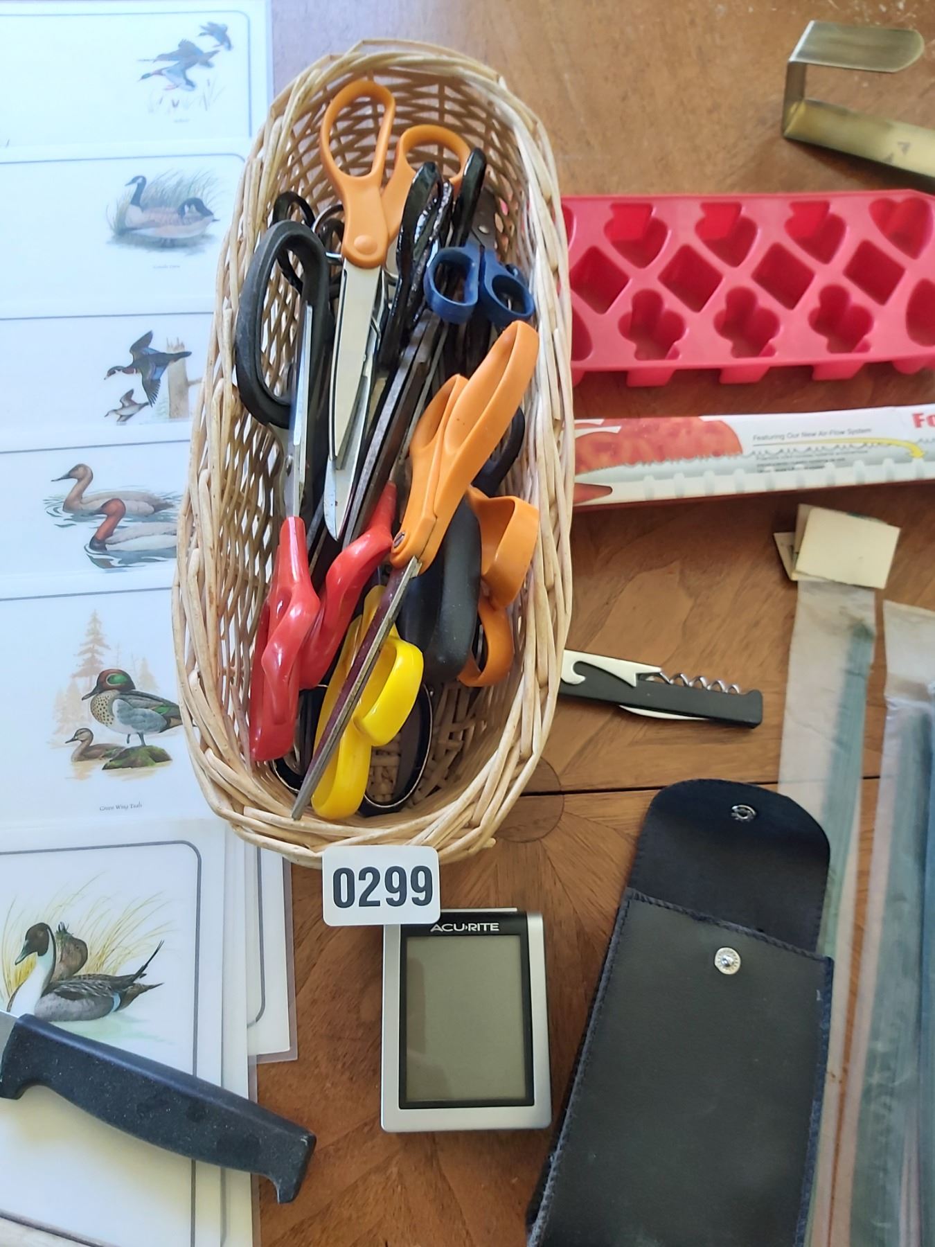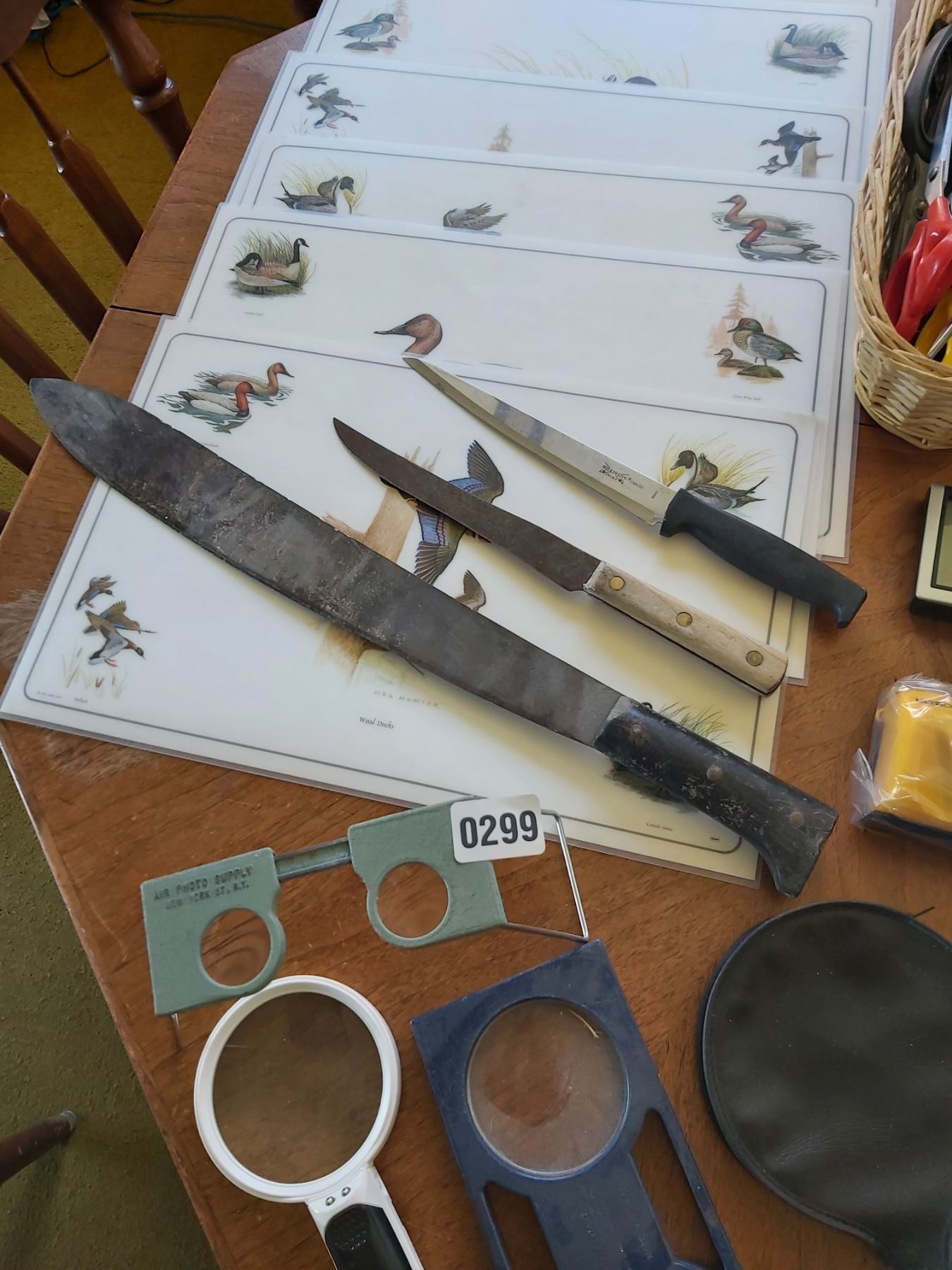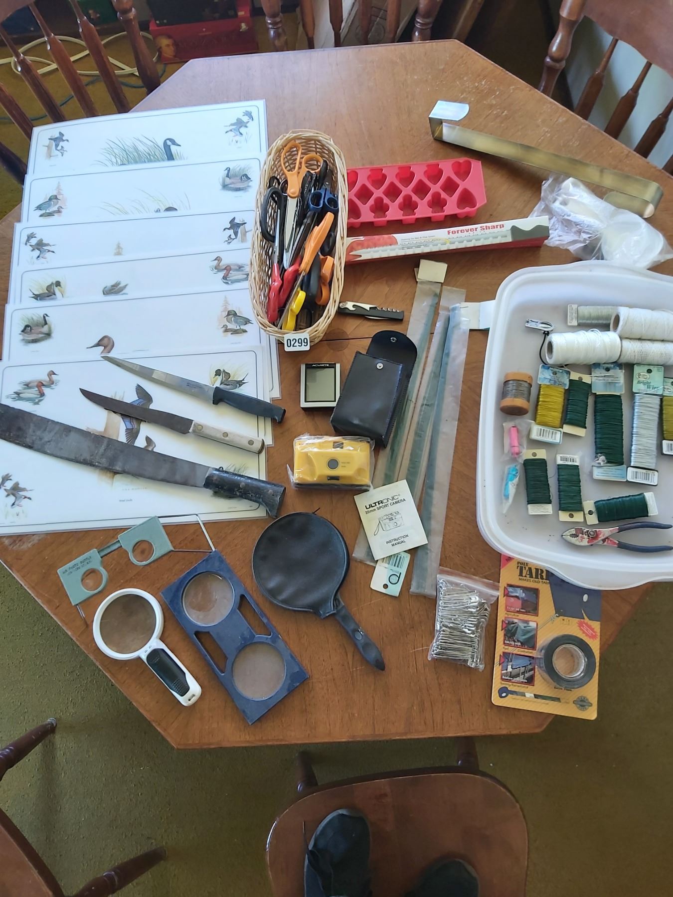 Asst floral wire, 5 placemats, machete and knives, magnifiers, Ultronic 35 mm sports camera