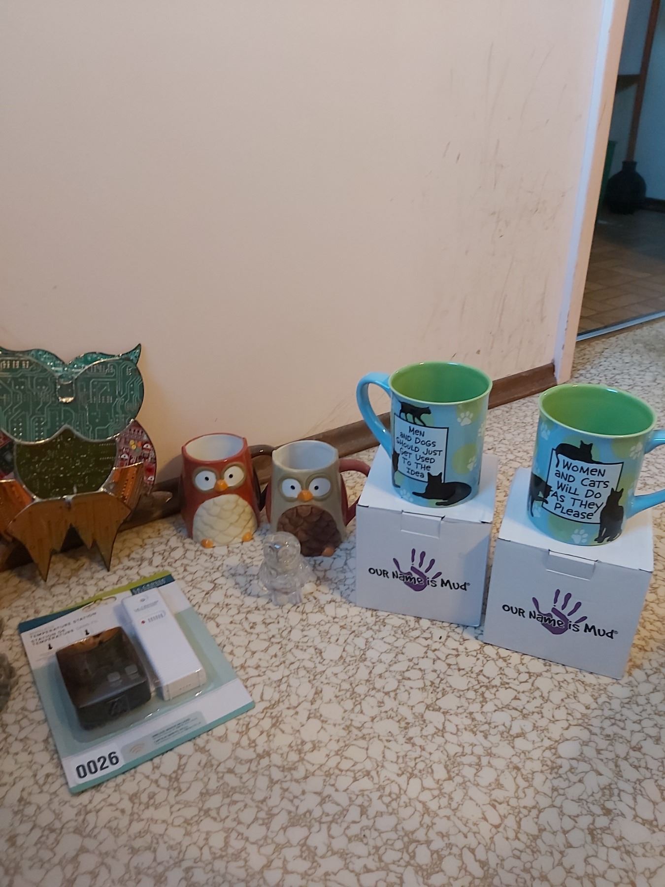 Asst home mdecor, various owls, La Crosse temperature station, coffee mugs