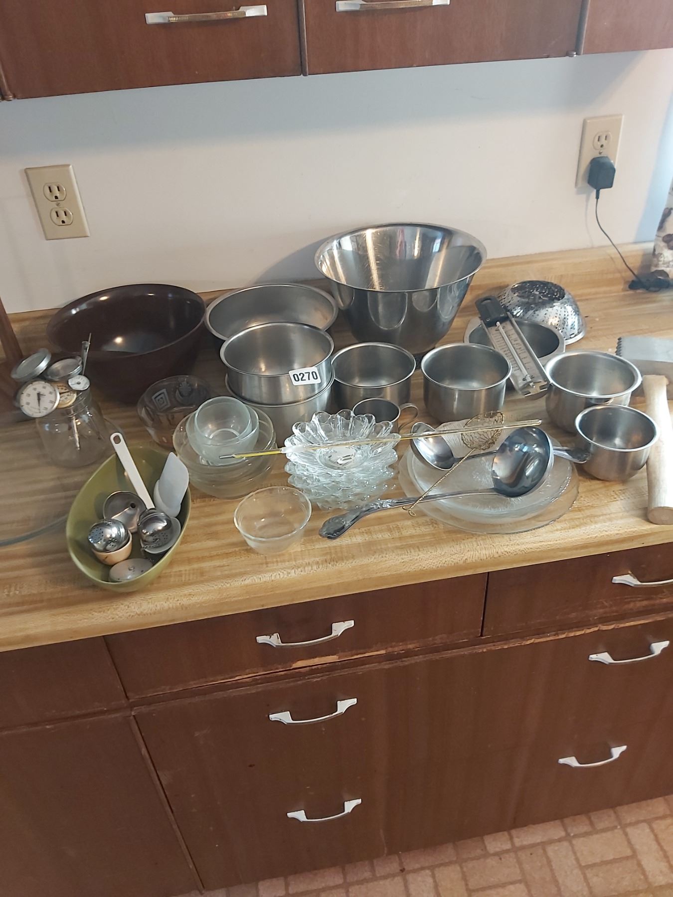 Asst stainless bowls, thermometers, dishes, paper towel holder, meat tenderizer, large pot
