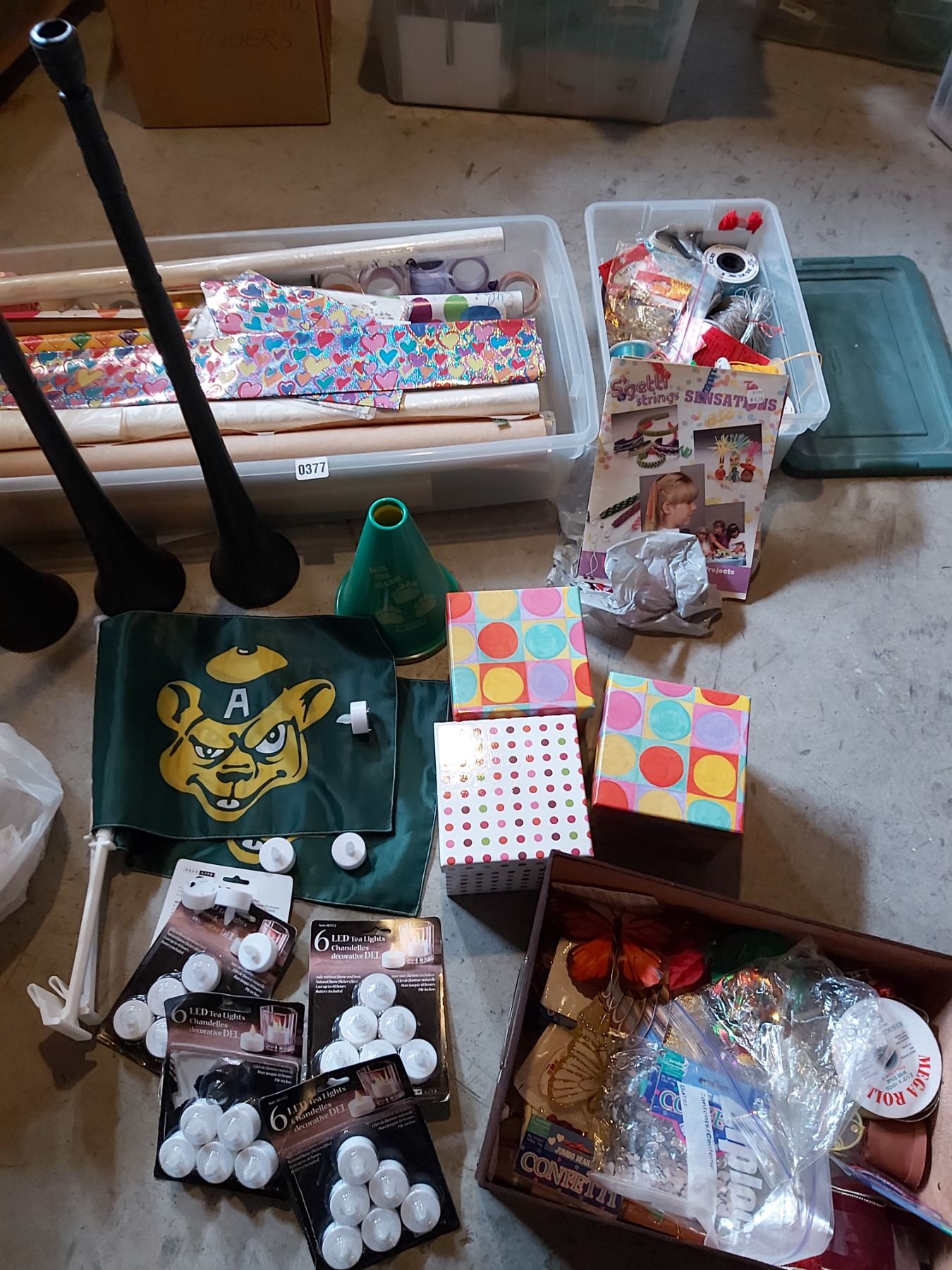Asst wrapping suppoies, arts and crafts materials, LED tealights, sports cheering equipment
