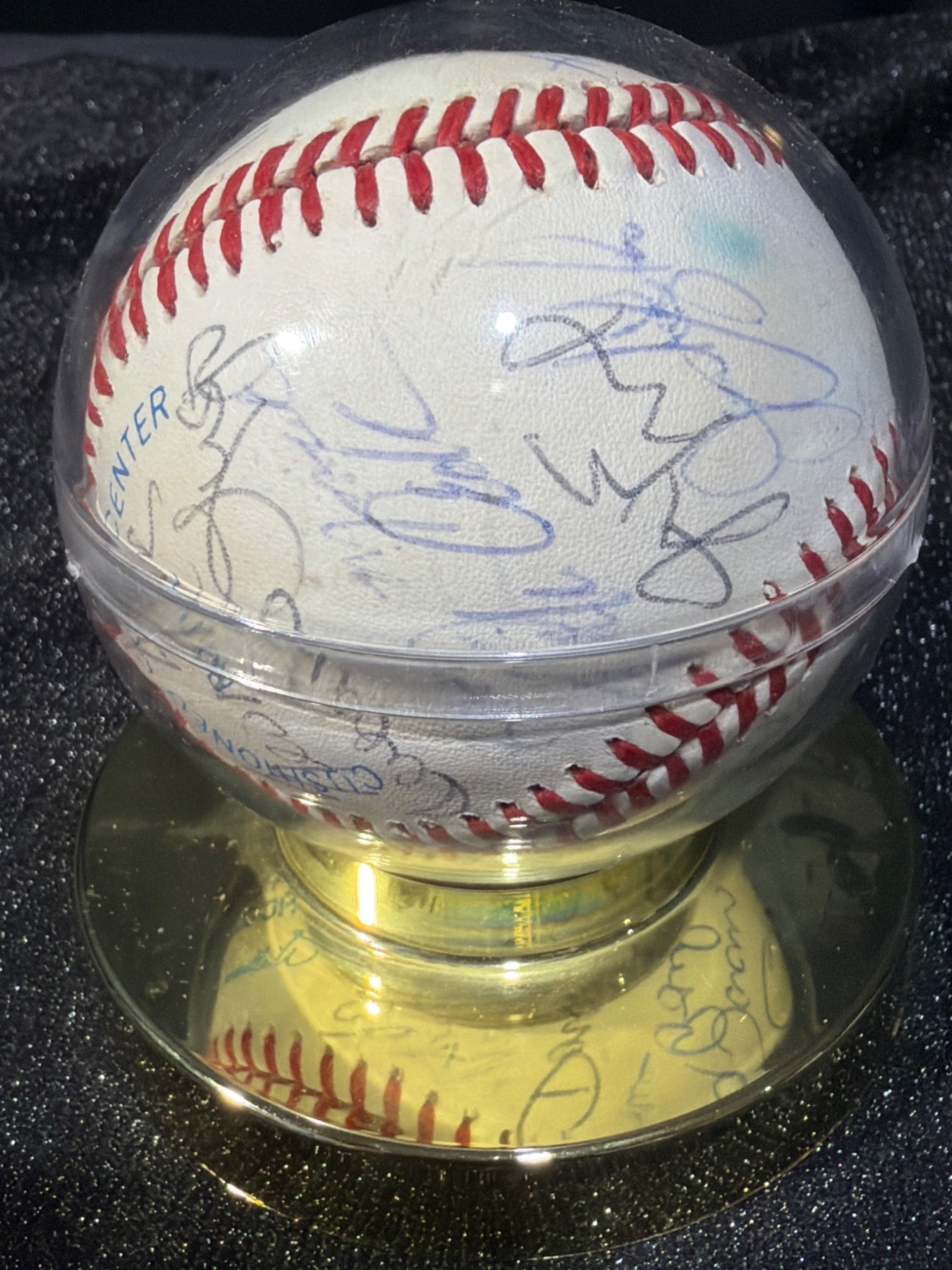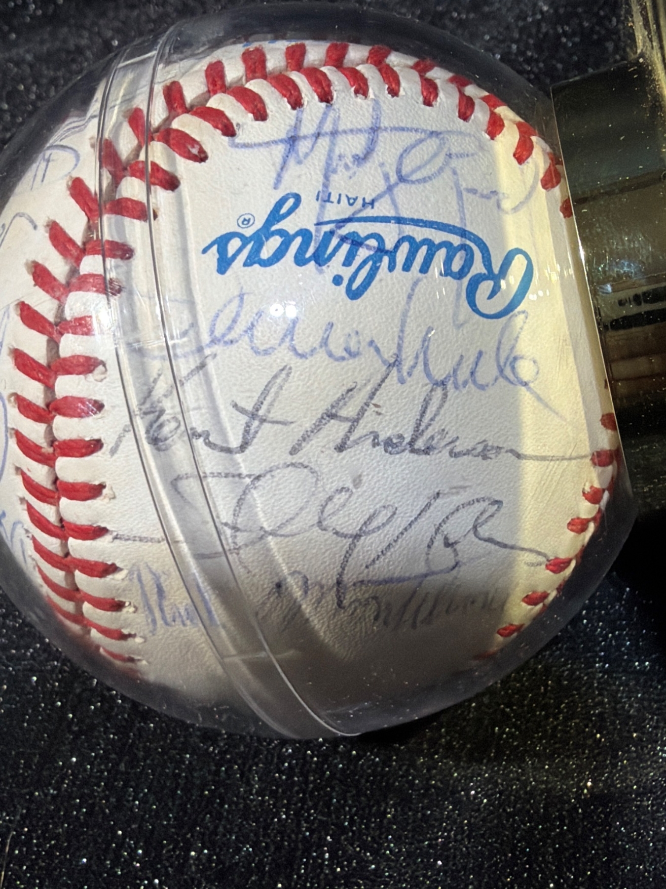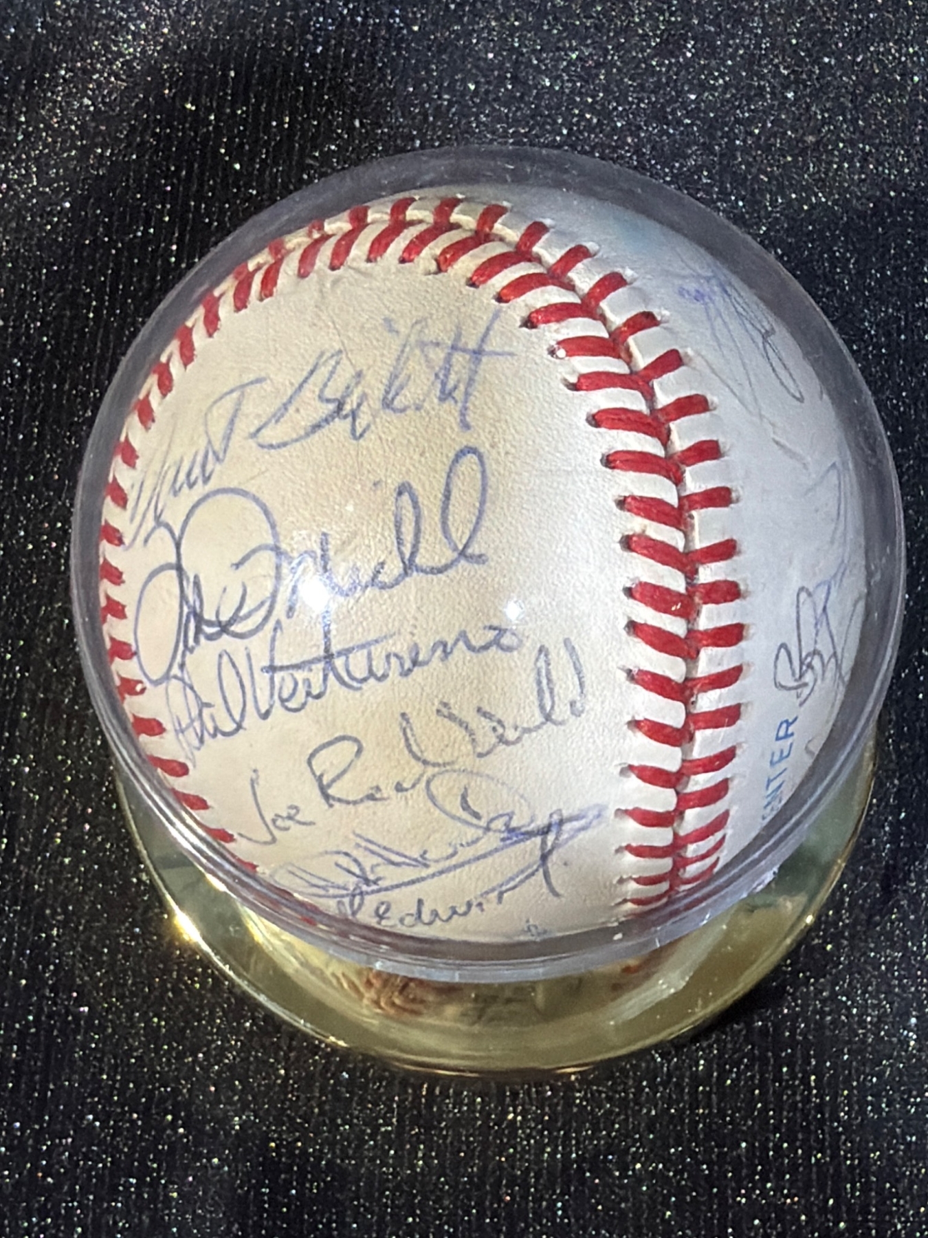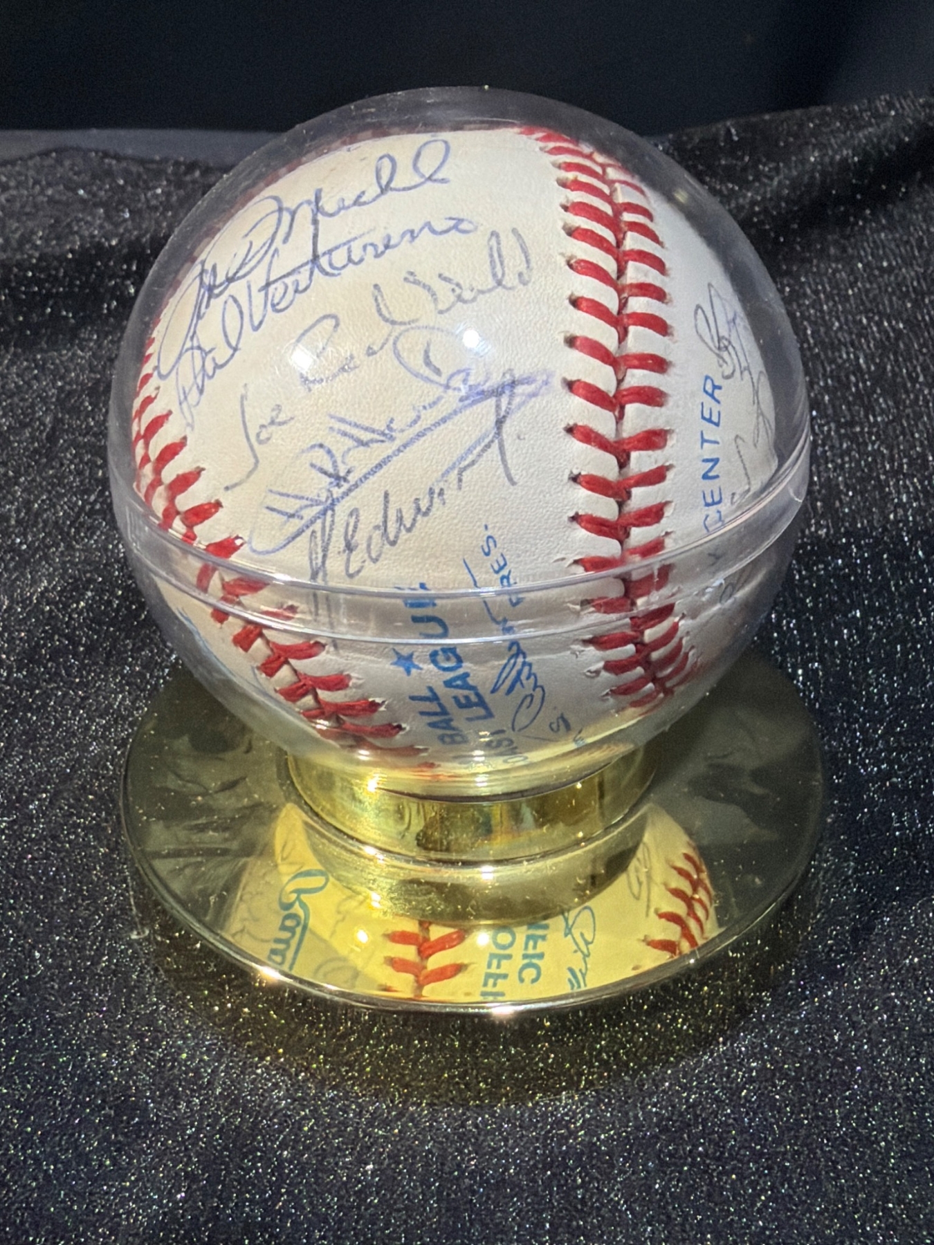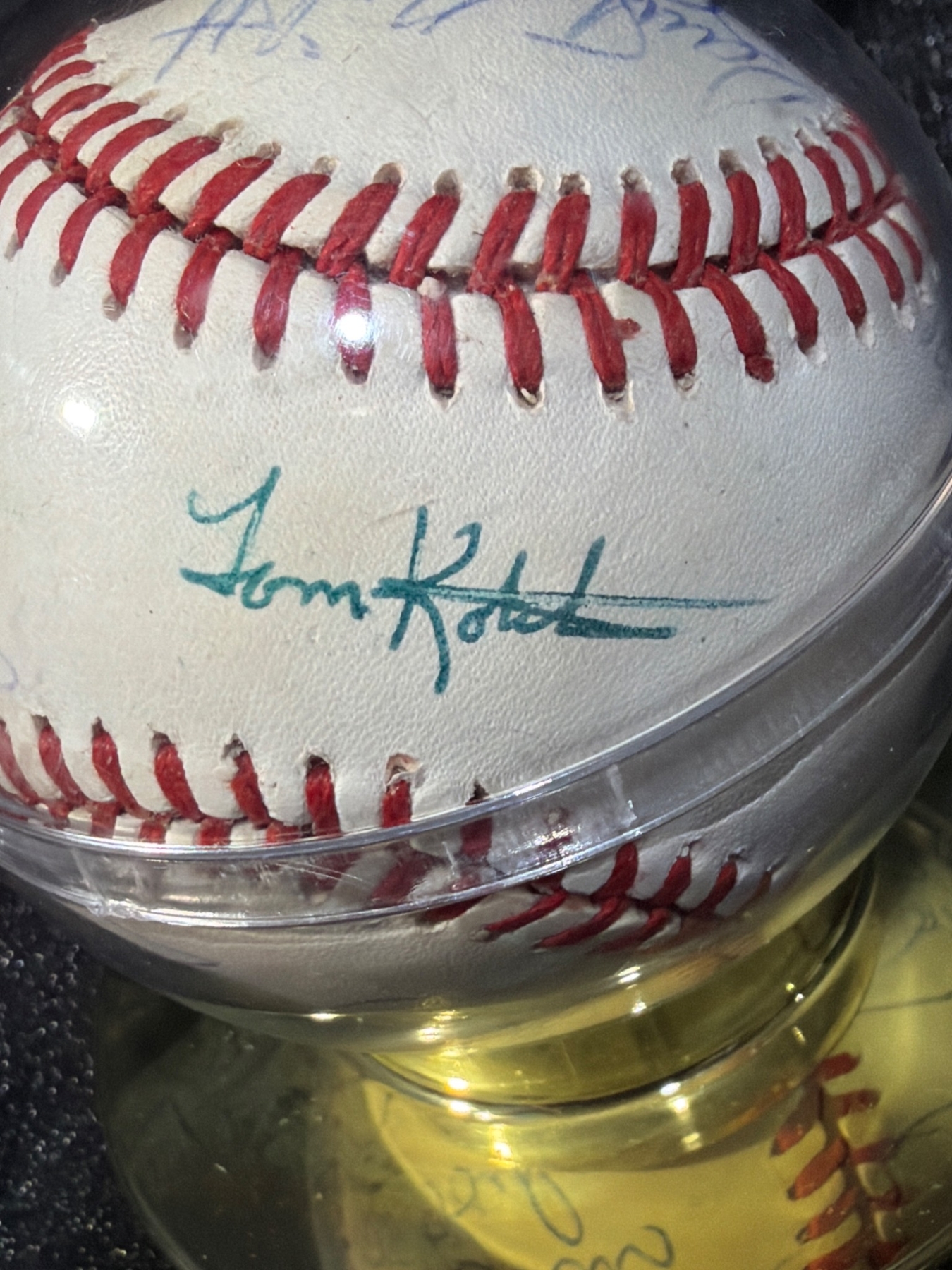 Official Rawlings baseball featuring multiple signatures, including names like Tom Kotch, among others. The ball comes securely encased in a clear protective display dome mounted on a gold-toned base for presentation. Dimensions of the case are approximately 4 inches in diameter and 4 inches in height. An interesting collectible for sports enthusiasts or autograph collectors.