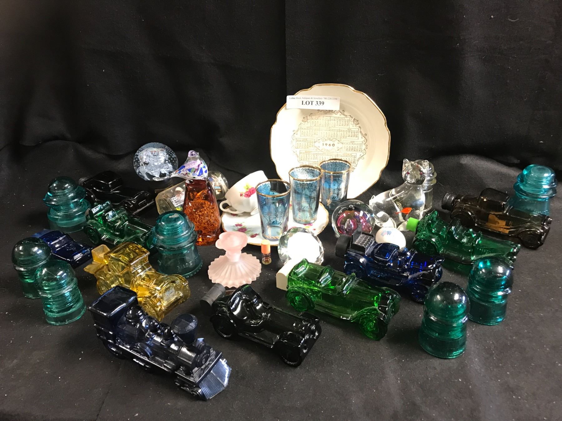Avon Parfume Bottles, Glass Insulators, Asst Glass Paperweights, Teacup from Westville from Japan, P