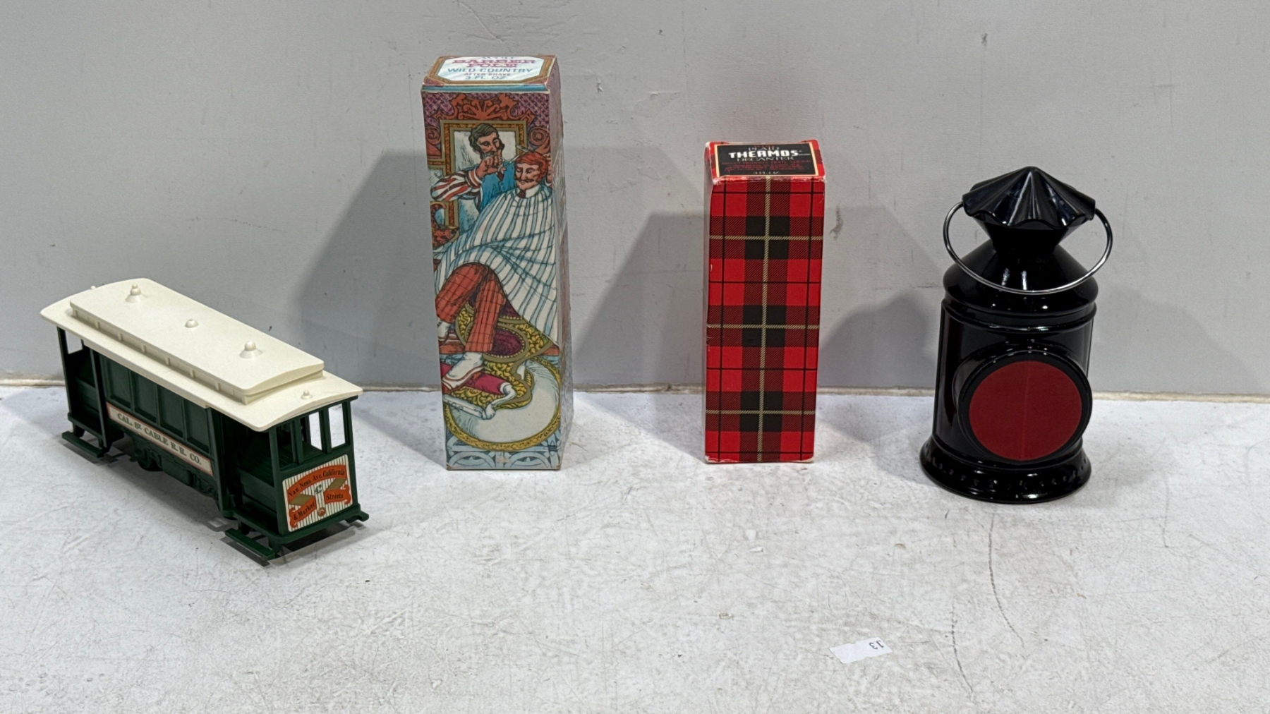 Avon Train Car, Lantern, Thermos, Barber Pole Shaped Bottles