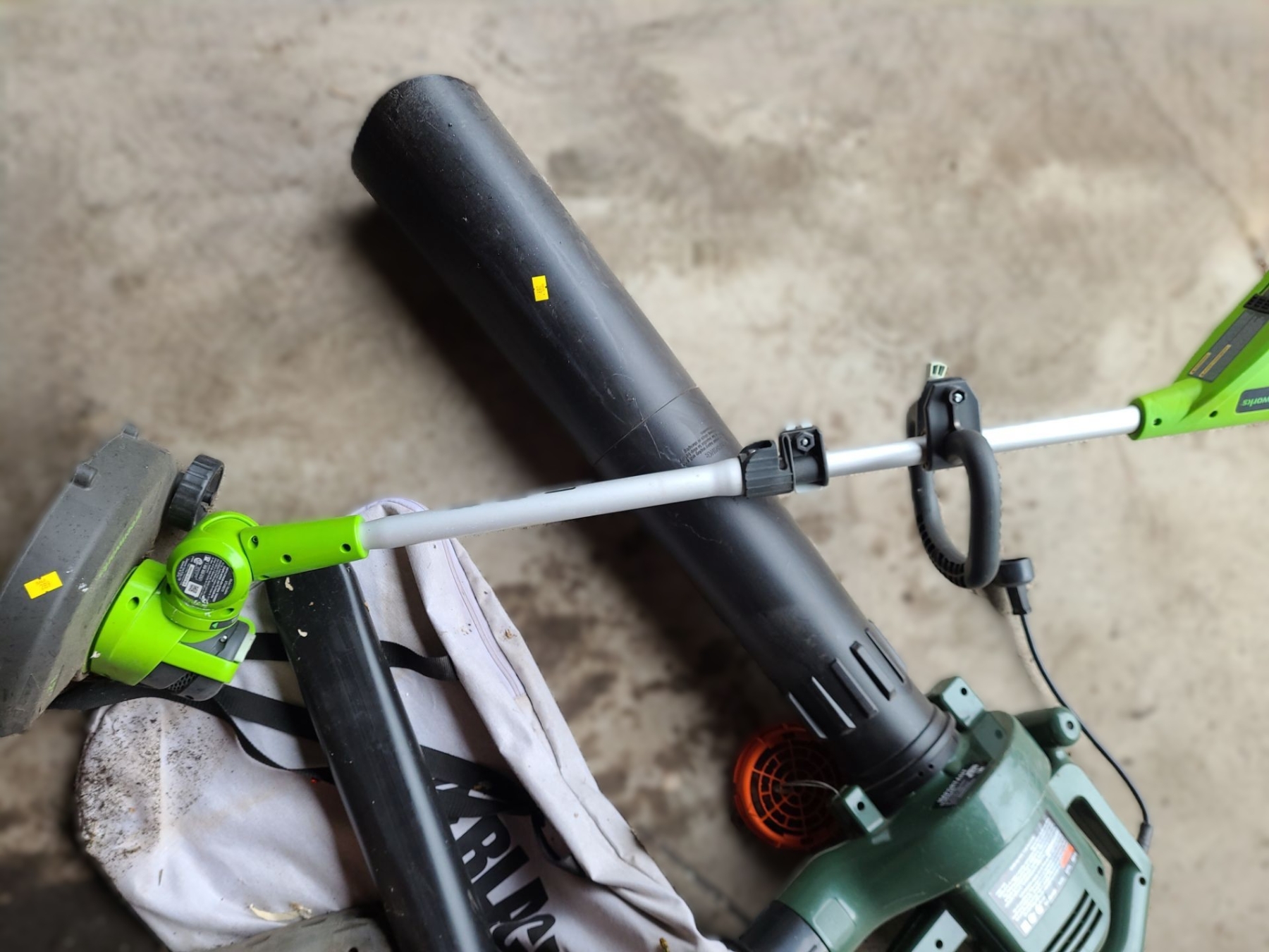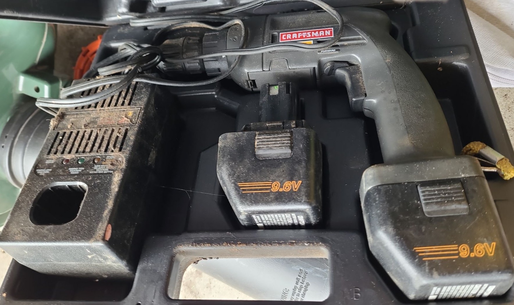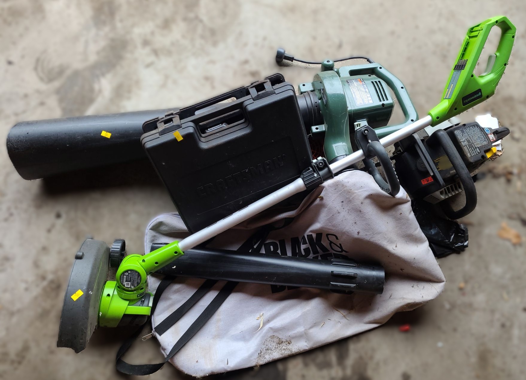 B&D Electric Leaf Blower, Chainsaw Model 54-5720-8, Craftsman Cordless Drill w/ Battery and Charger, Greenworks Trimmer (No Battery)