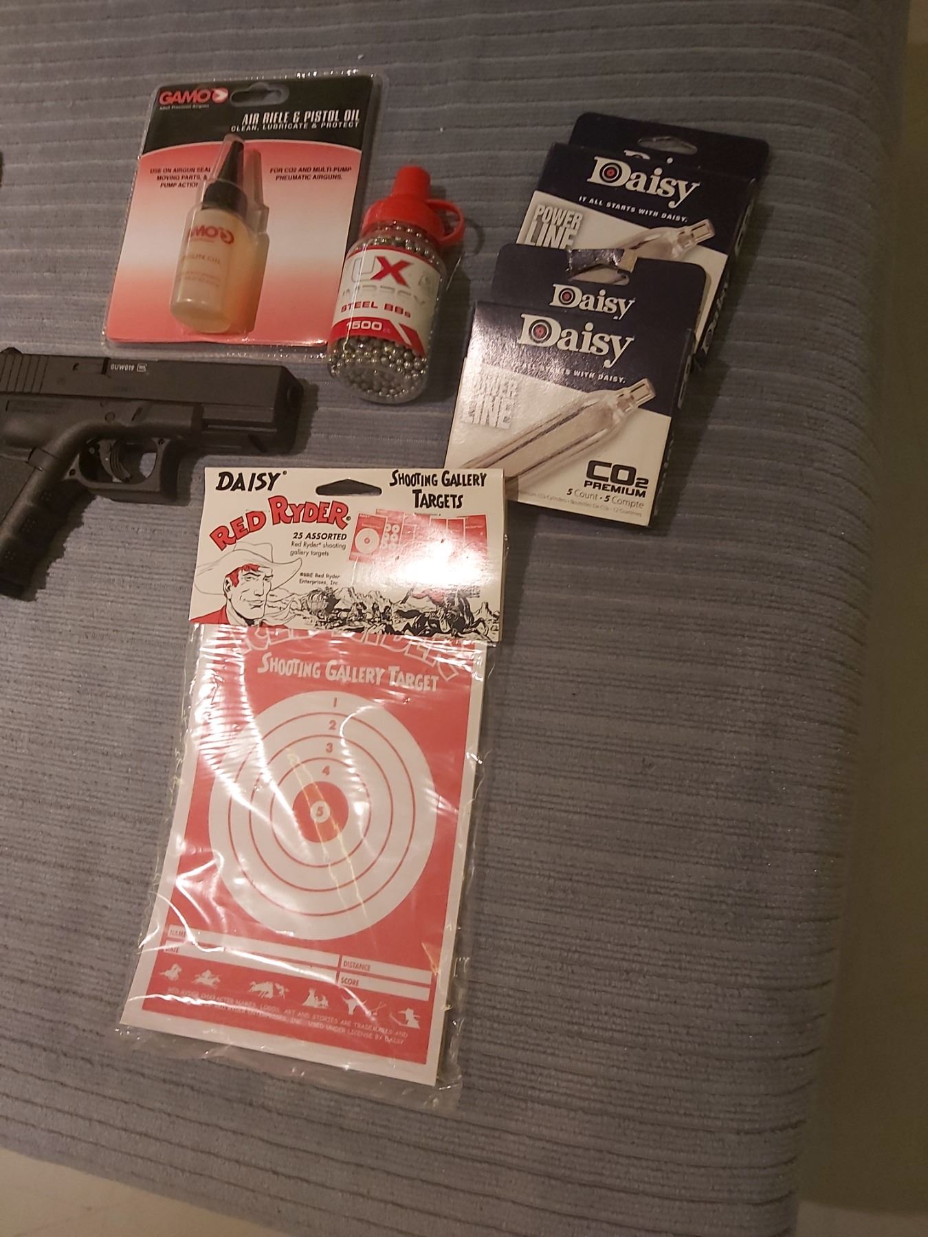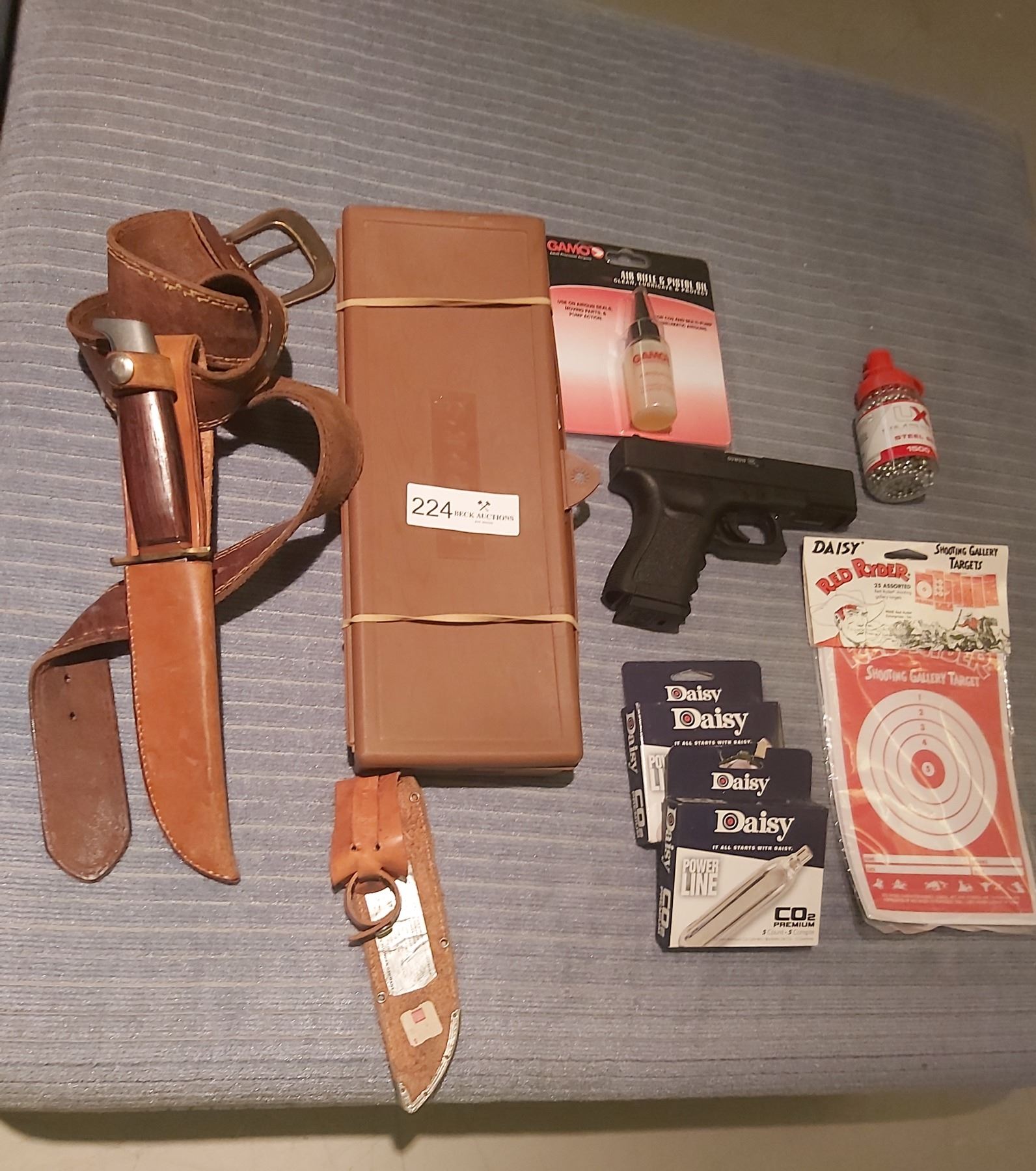 BB gun GUW019 Glock, 4,5 mm (.177) must be 18 to purchase, Hoppe's gun cleaning kit, knife comes with belt and holder. Also included is BBs, CO2 Cartridges, And target.
