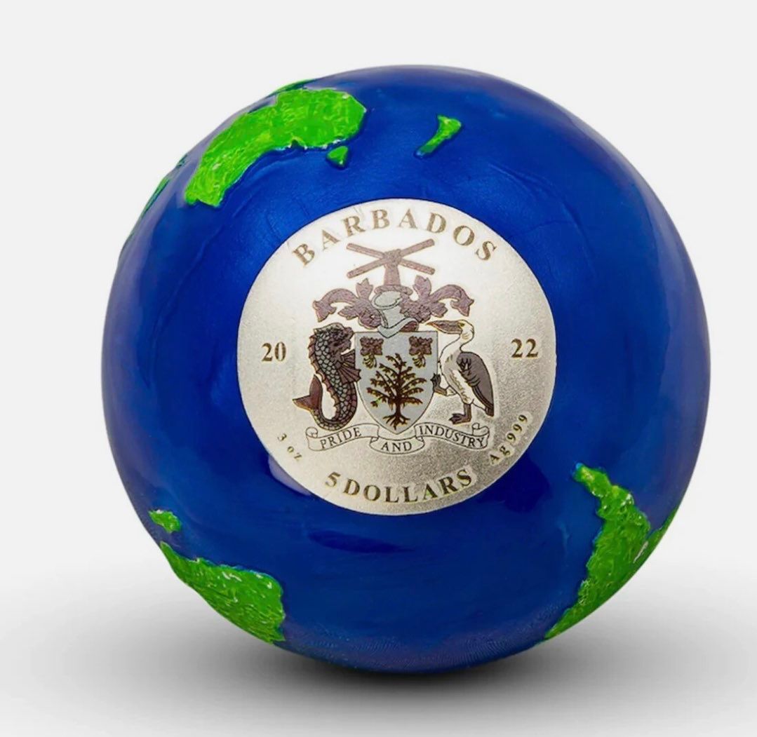BLUE MARBLE GREEN PLANET EARTH 2022 $5 3 oz Pure Silver Spherical Coin – Barbados