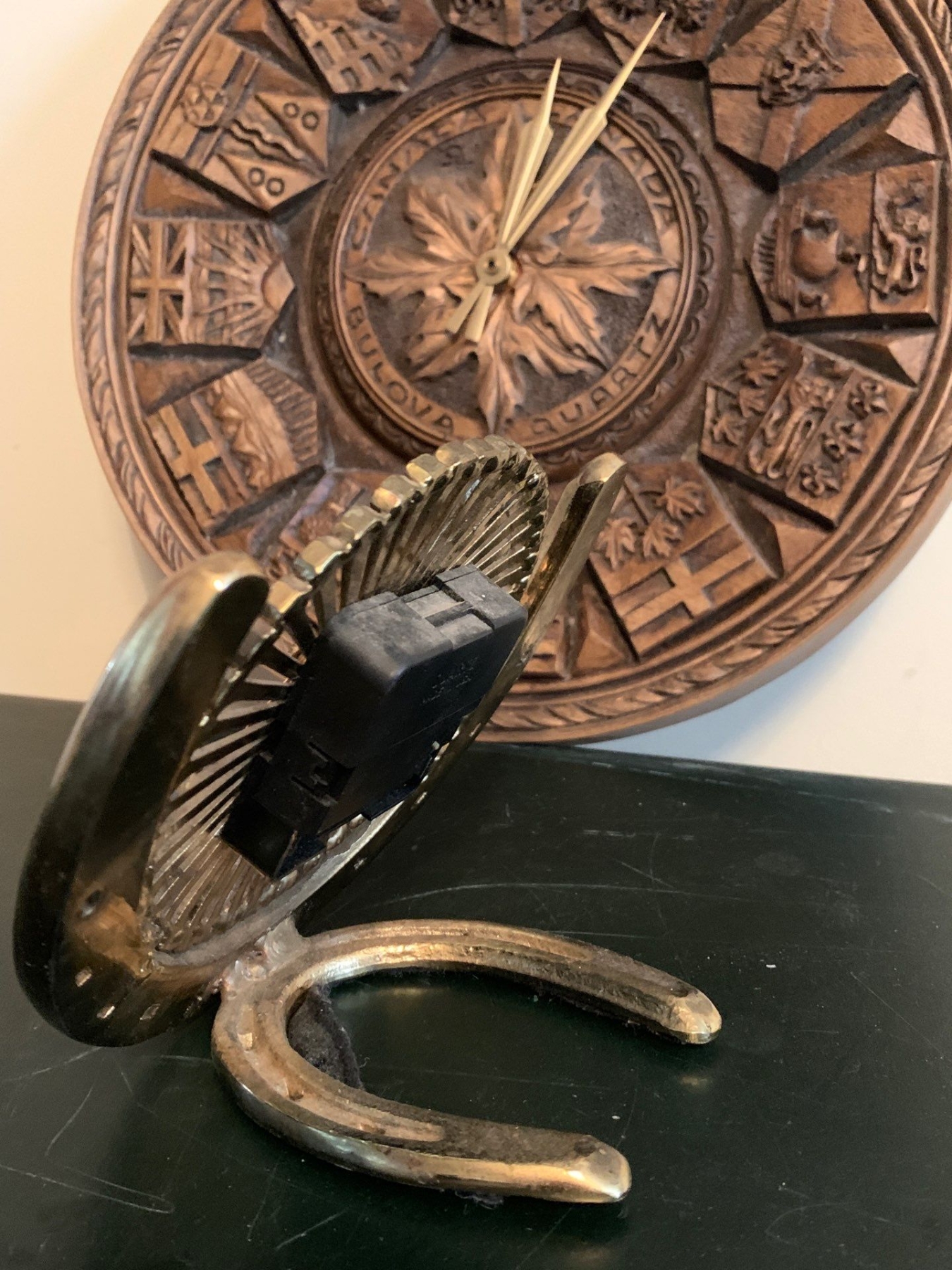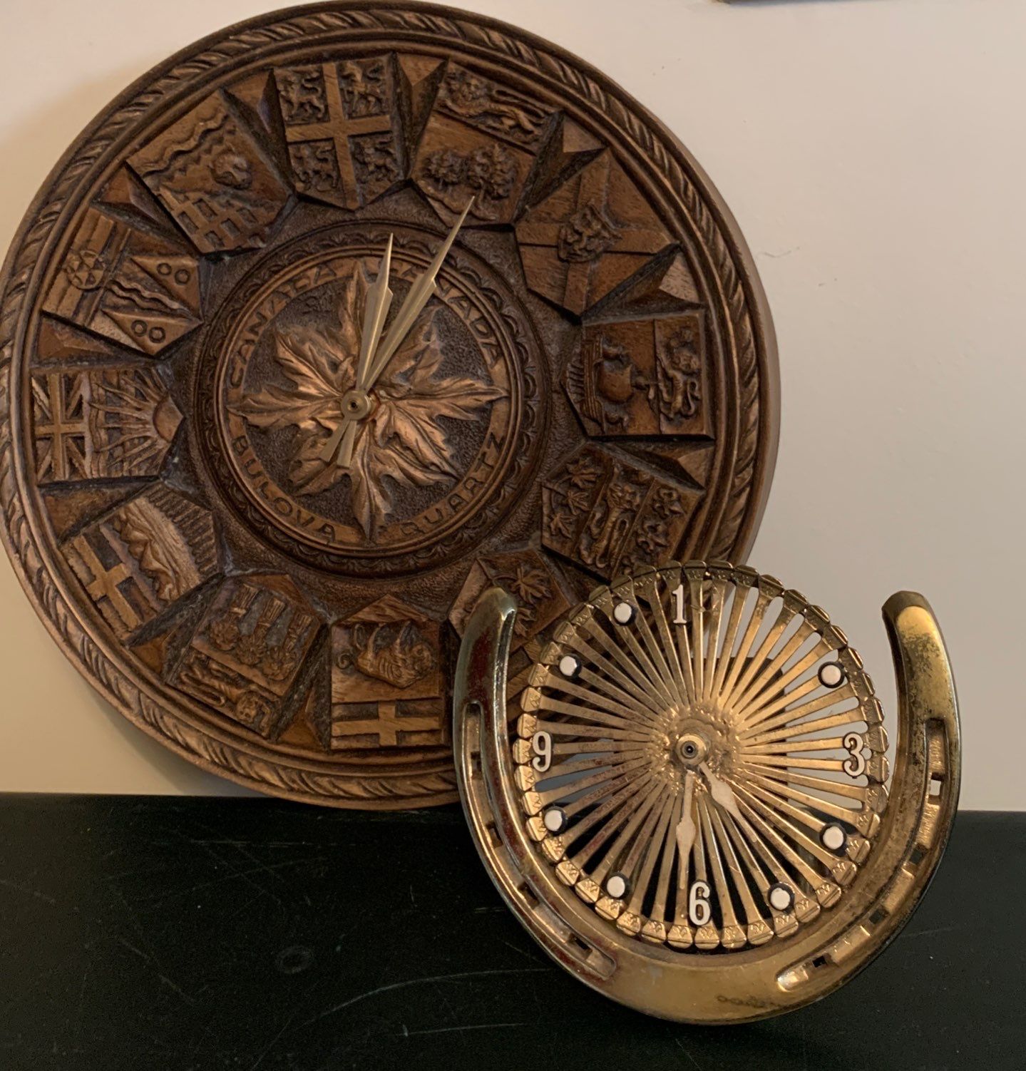 BULOVA Hand Carved Canadian Clock 13W w/ Brass Horse Shoe Clock