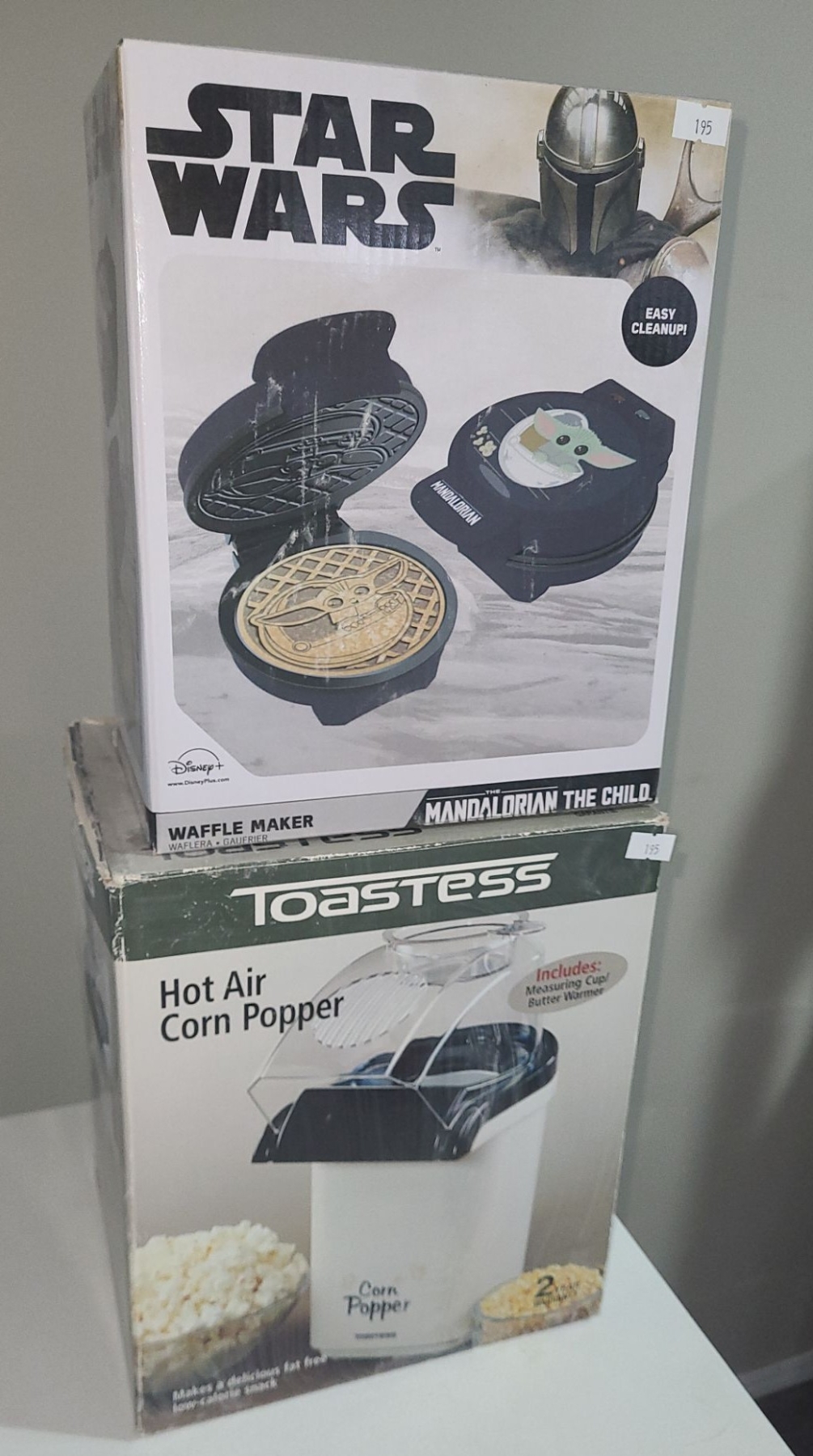 Baby Yoda Waffle Maker and Toastess Hot Air Corn Popper