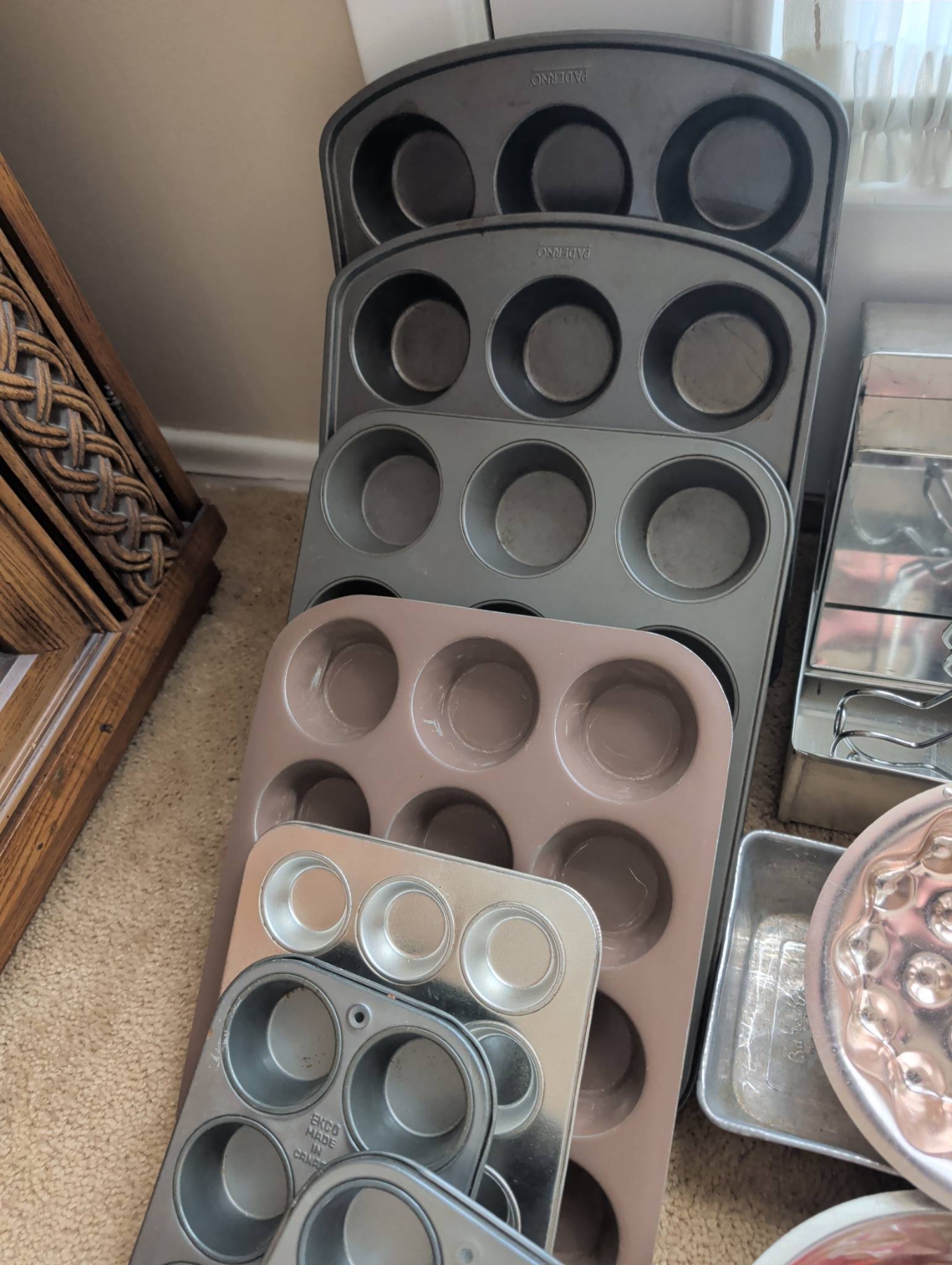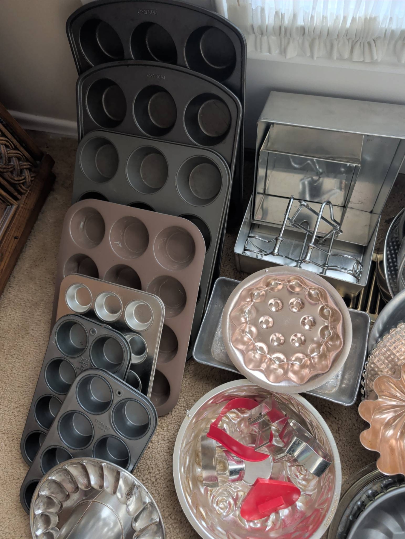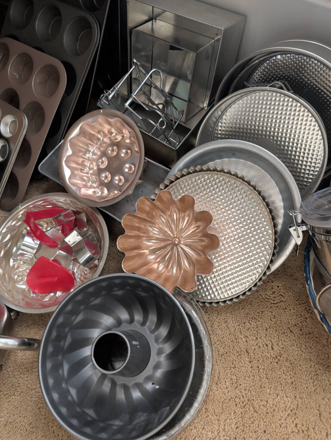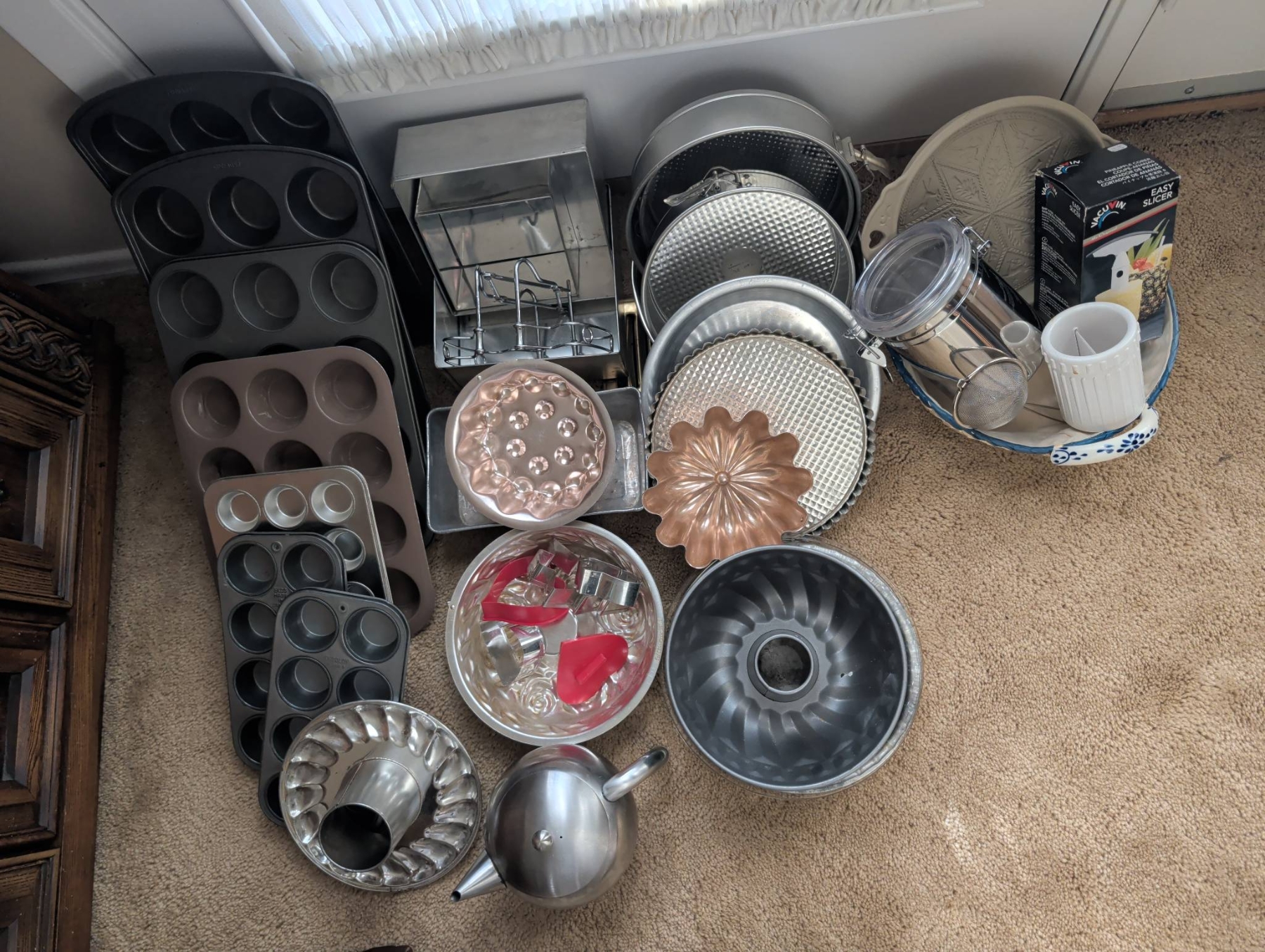 A versatile lot featuring an assortment of baking items, kitchen accessories, and a teapot. Includes multiple muffin pans of varying sizes, springform pans, decorative baking molds (copper floral and bundt styles), cookie cutters, and other tools. Also comes with a stainless steel kitchen cannister, pineapple slicer, flour sifter, and a charming stainless steel teapot. Perfect for baking enthusiasts.