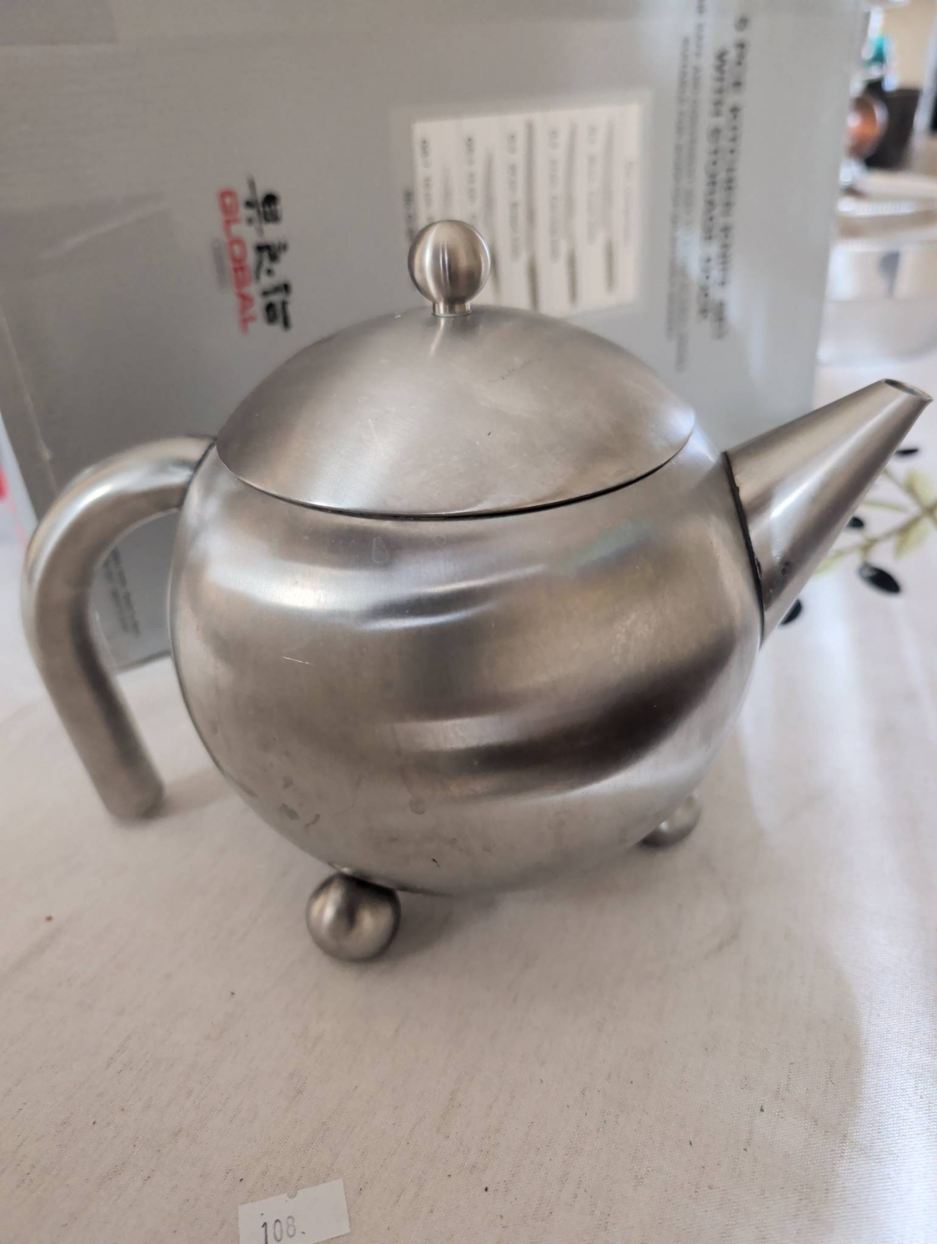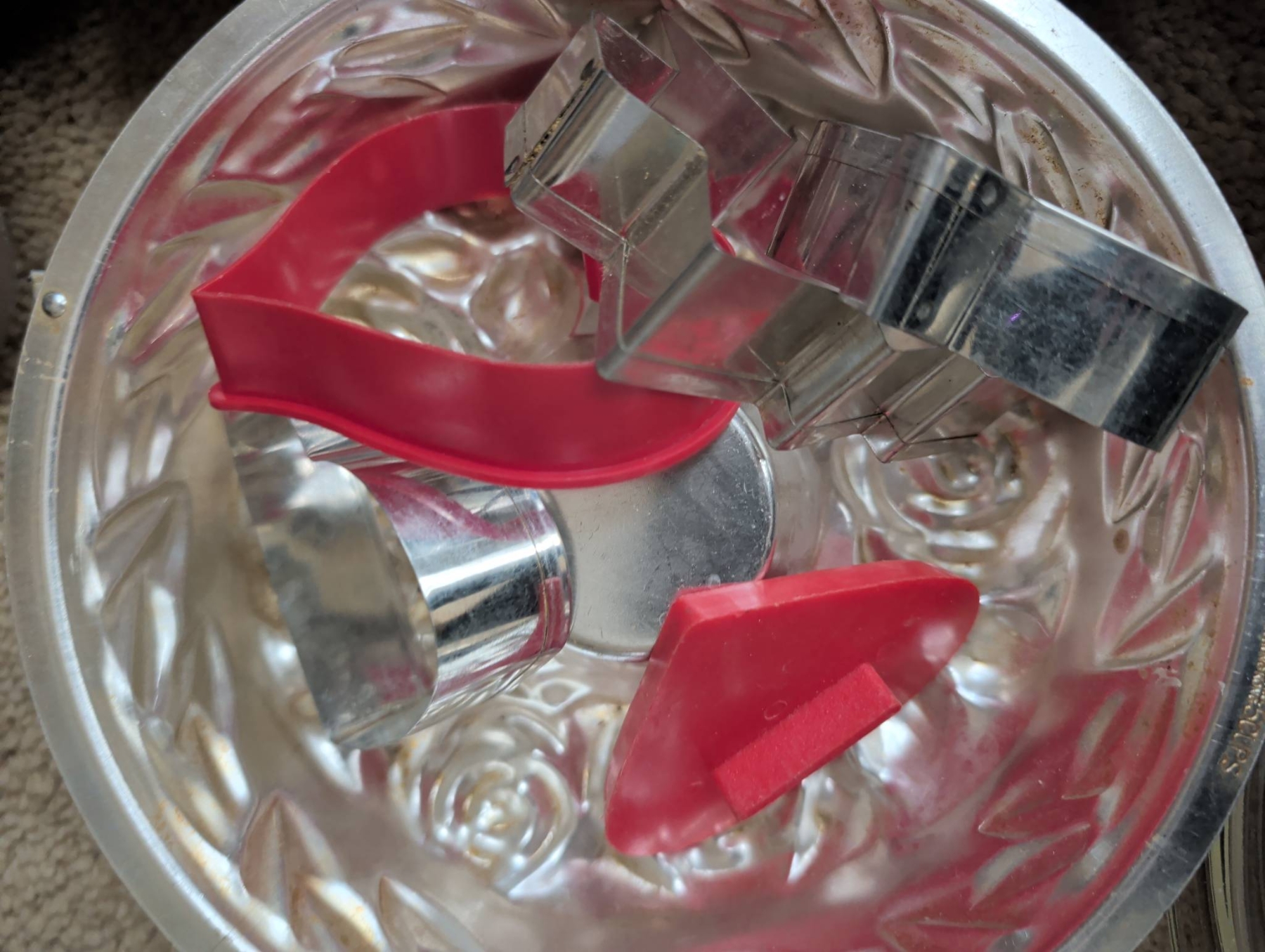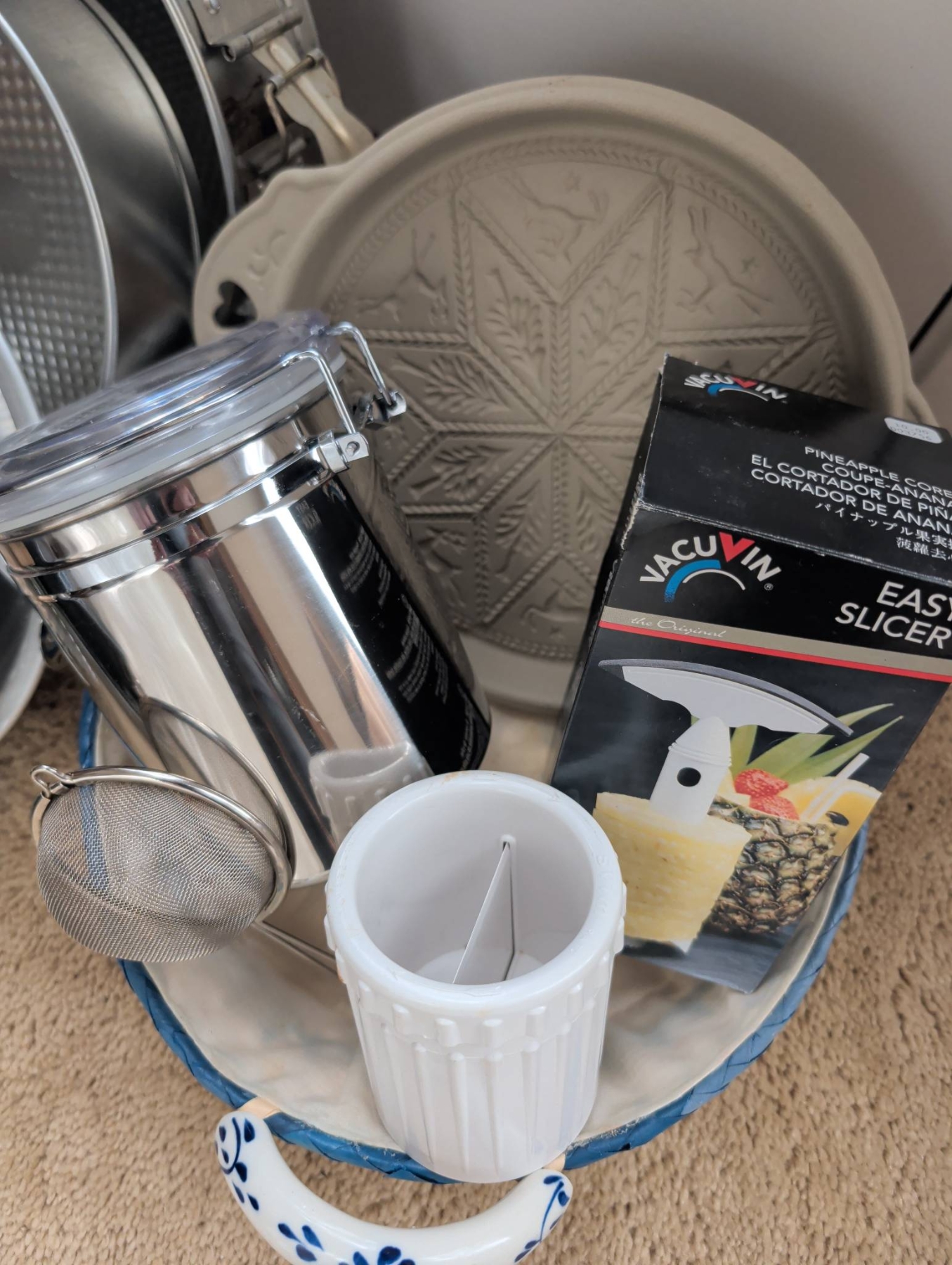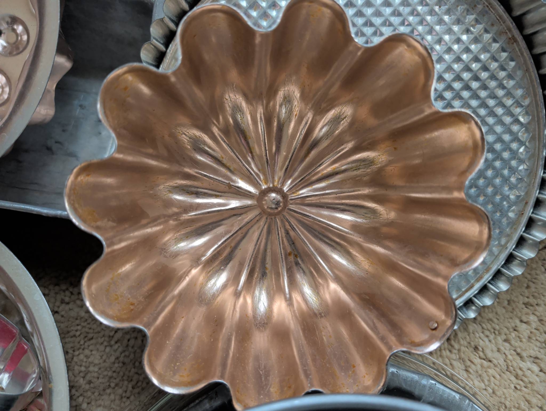A versatile lot featuring an assortment of baking items, kitchen accessories, and a teapot. Includes multiple muffin pans of varying sizes, springform pans, decorative baking molds (copper floral and bundt styles), cookie cutters, and other tools. Also comes with a stainless steel kitchen cannister, pineapple slicer, flour sifter, and a charming stainless steel teapot. Perfect for baking enthusiasts.