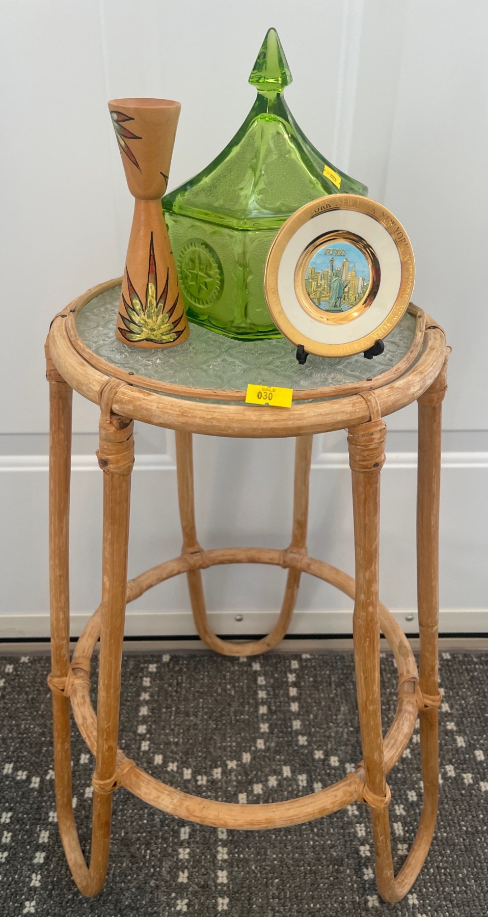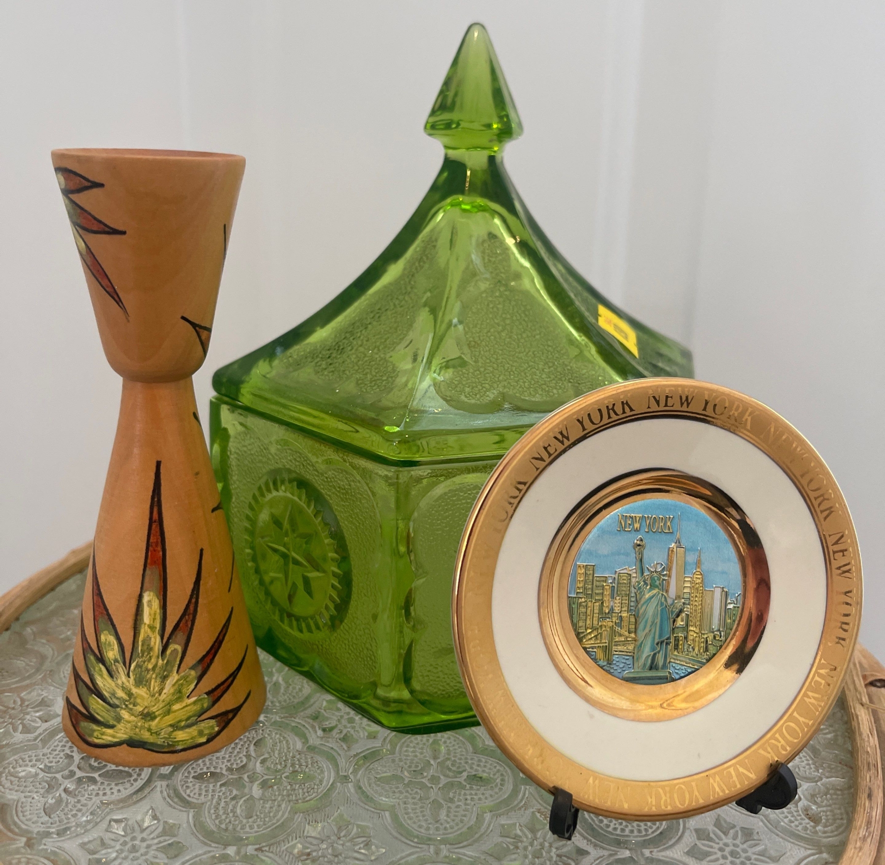 Bamboo Pedastal / Plant Stand w/ Depression Glass Candy Dish Hand Carved Candle Holder & More 18T