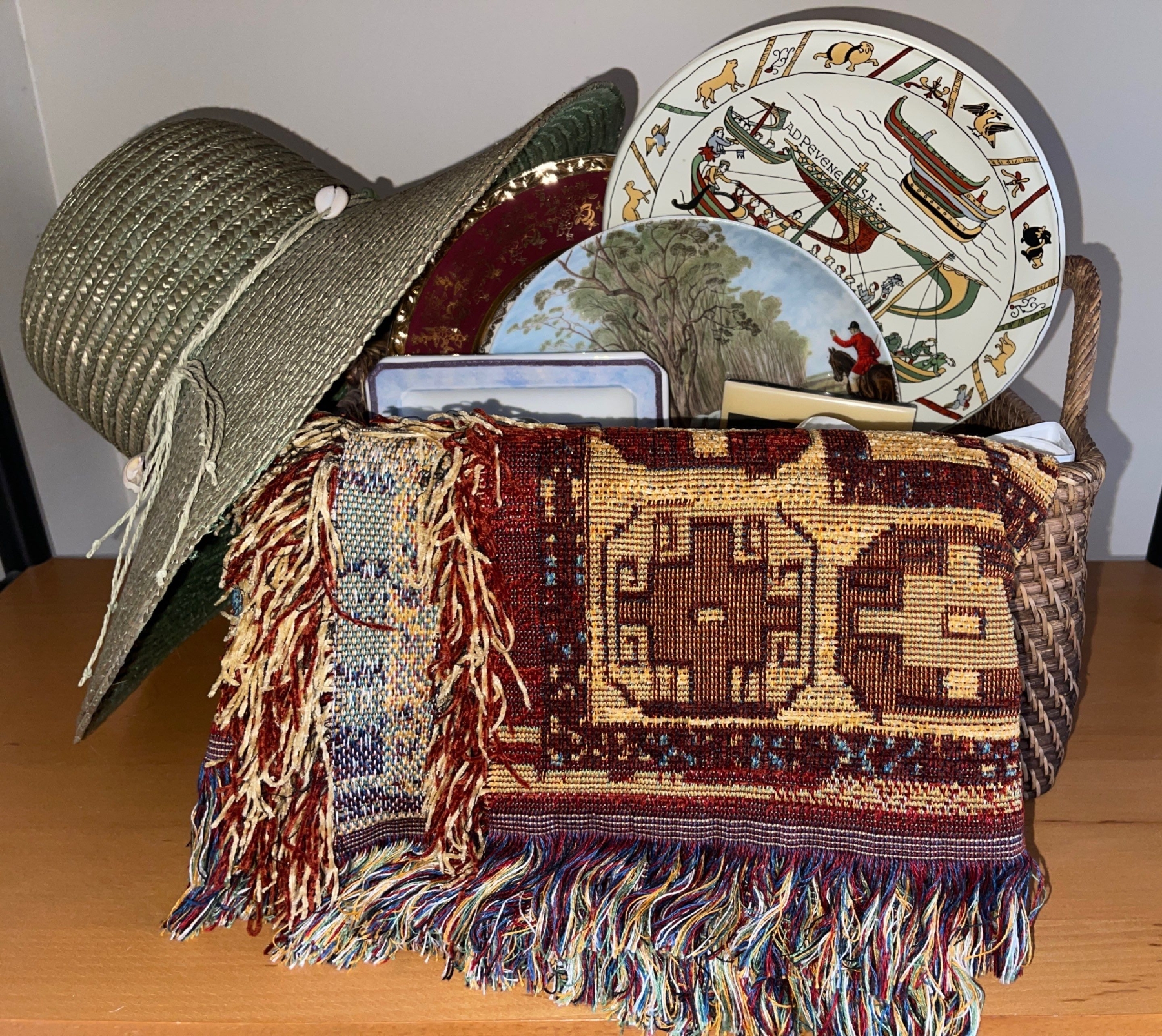 Basket & Handmade Throw Blanket W/Hat and Different Styles Of Coffee Cups