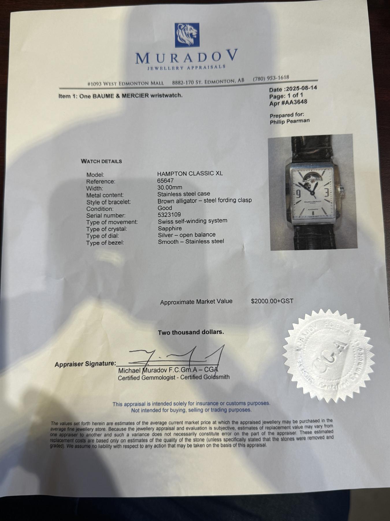 Baume & Mercier Hampton Classic XL 30MM Stainless Steele - Alligator Strap - Swiss Self Winding SN 5323109