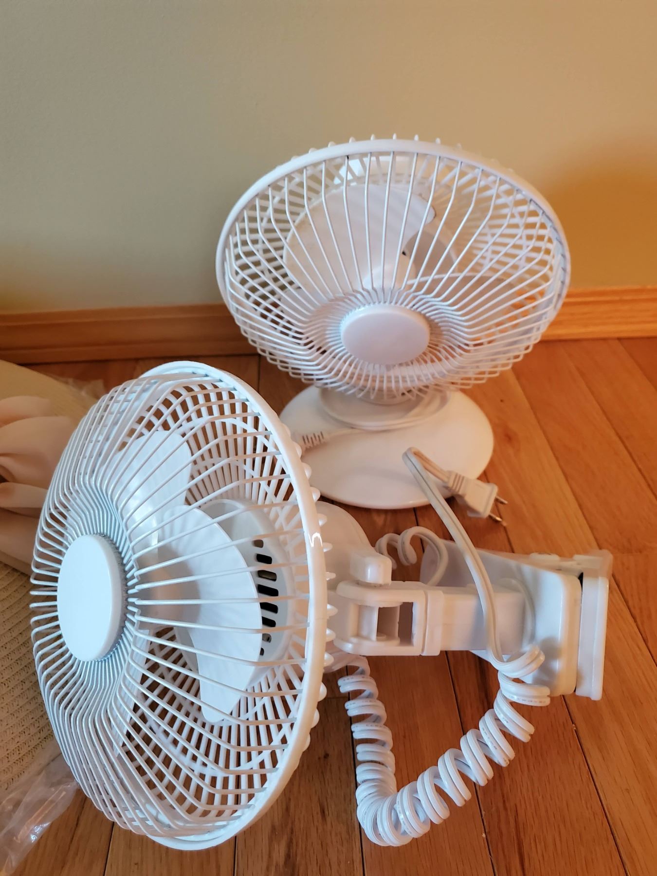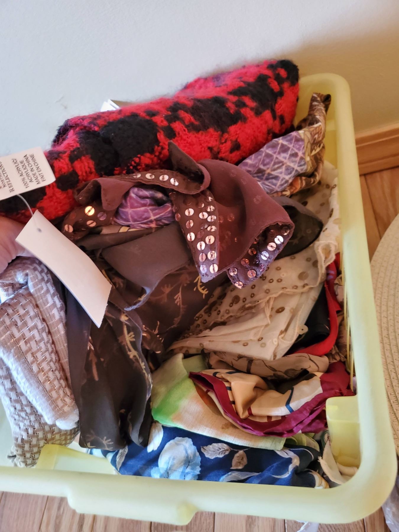 Beach Hats, clothing steamer, misc. scarves. And desk fans