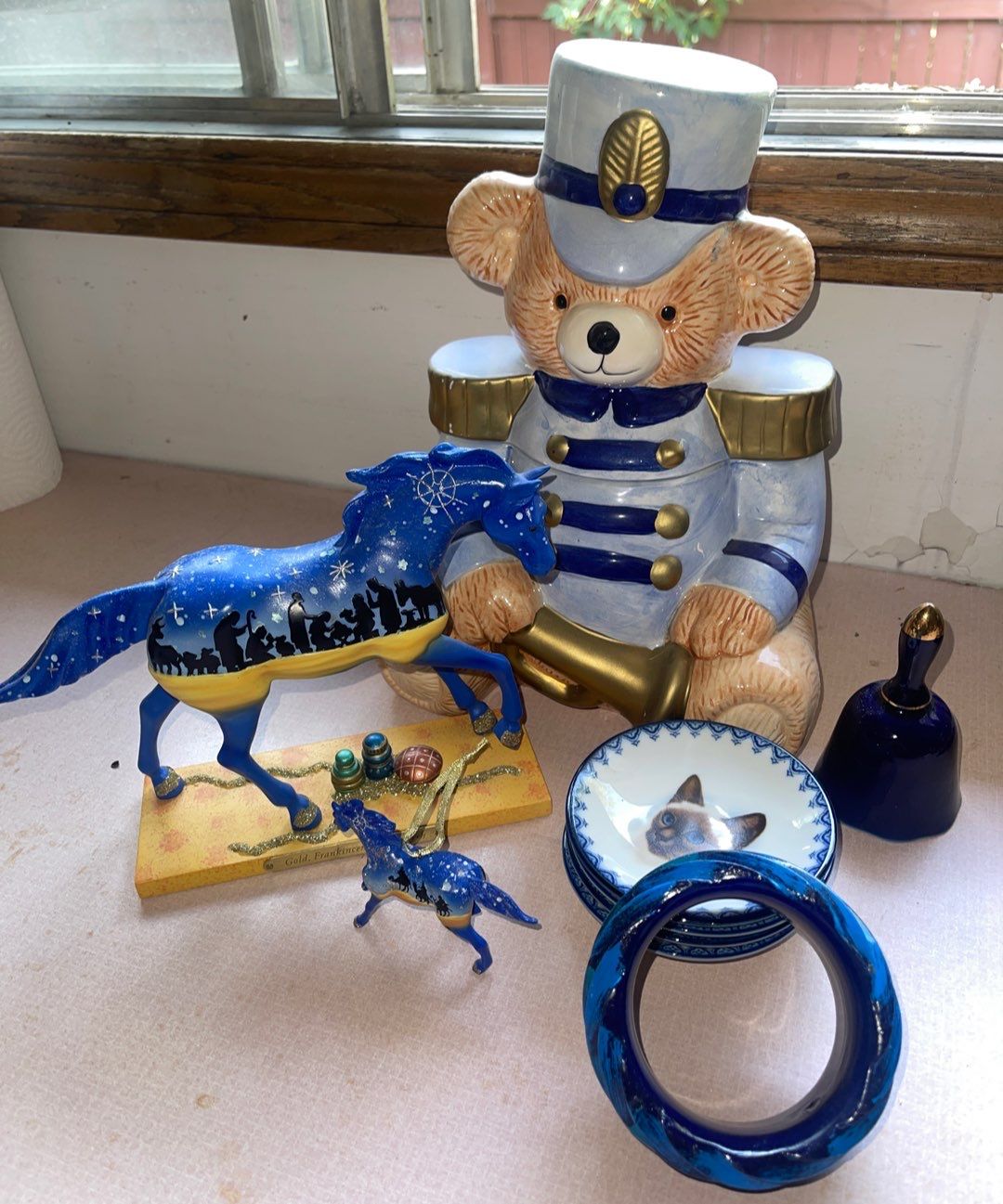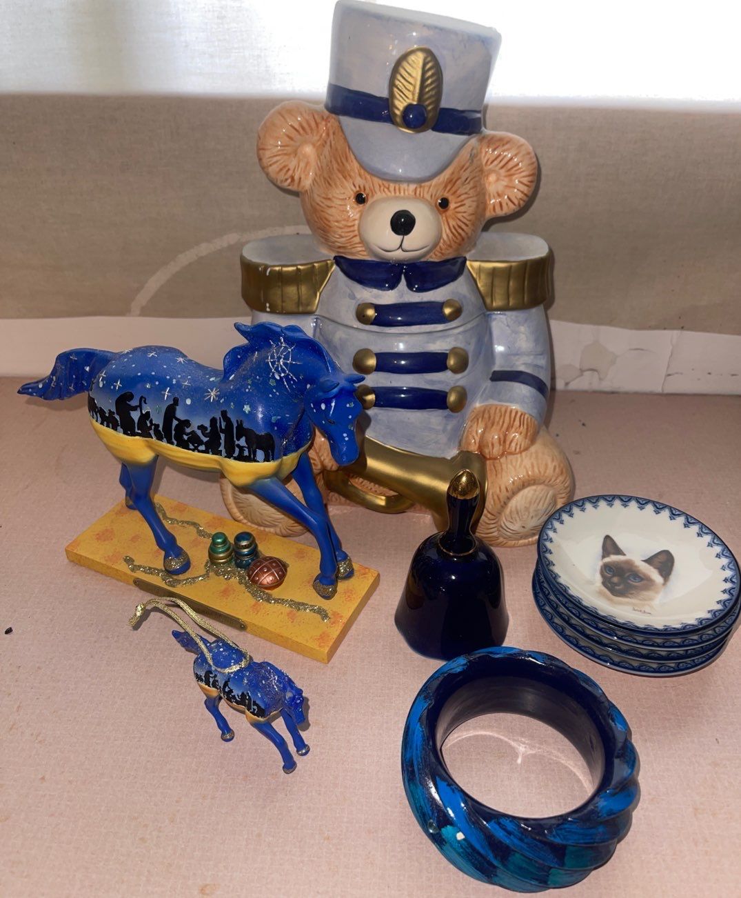 Bear Cookie Jar 13T w/ Horse Figurines Pussy Plates Ceramic Bell & More
