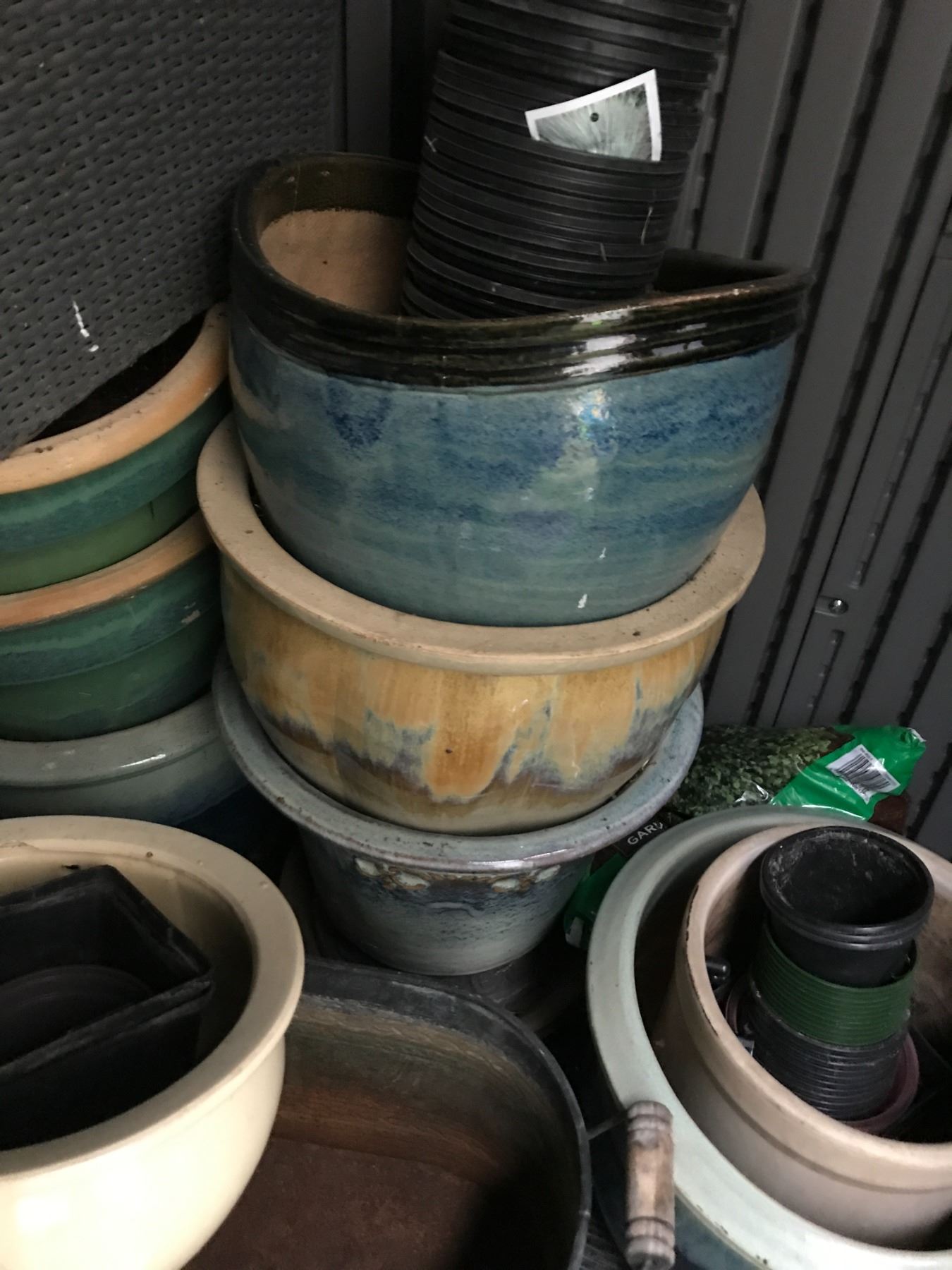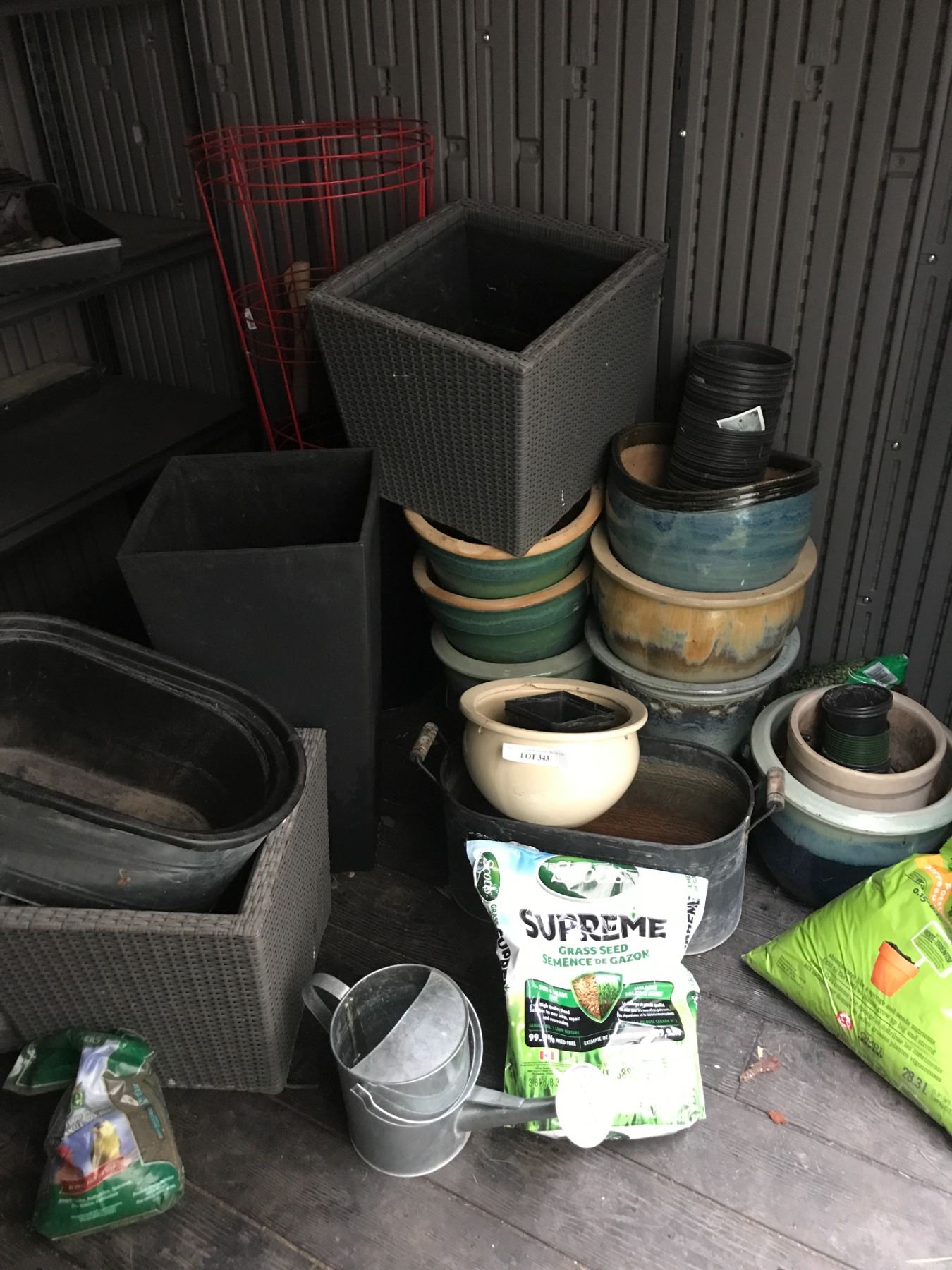 Beautiful Ceramic & Various Outdoor Planters, Metal Bin, Watering Can, and Grass Seed