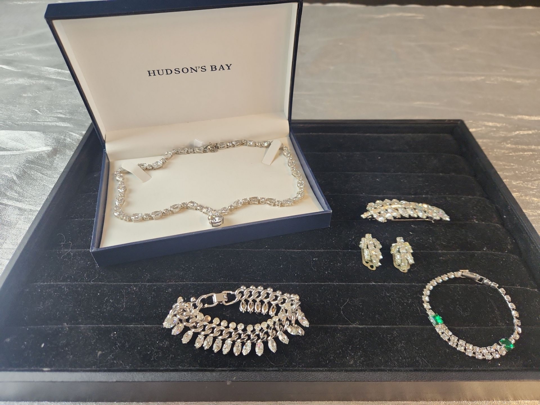 This Jewelry Set Features Various Silver-Tone Pieces Including a Necklace, Bracelet, Earrings, and a Brooch, Likely Showcasing Simulated Diamonds or Crystal