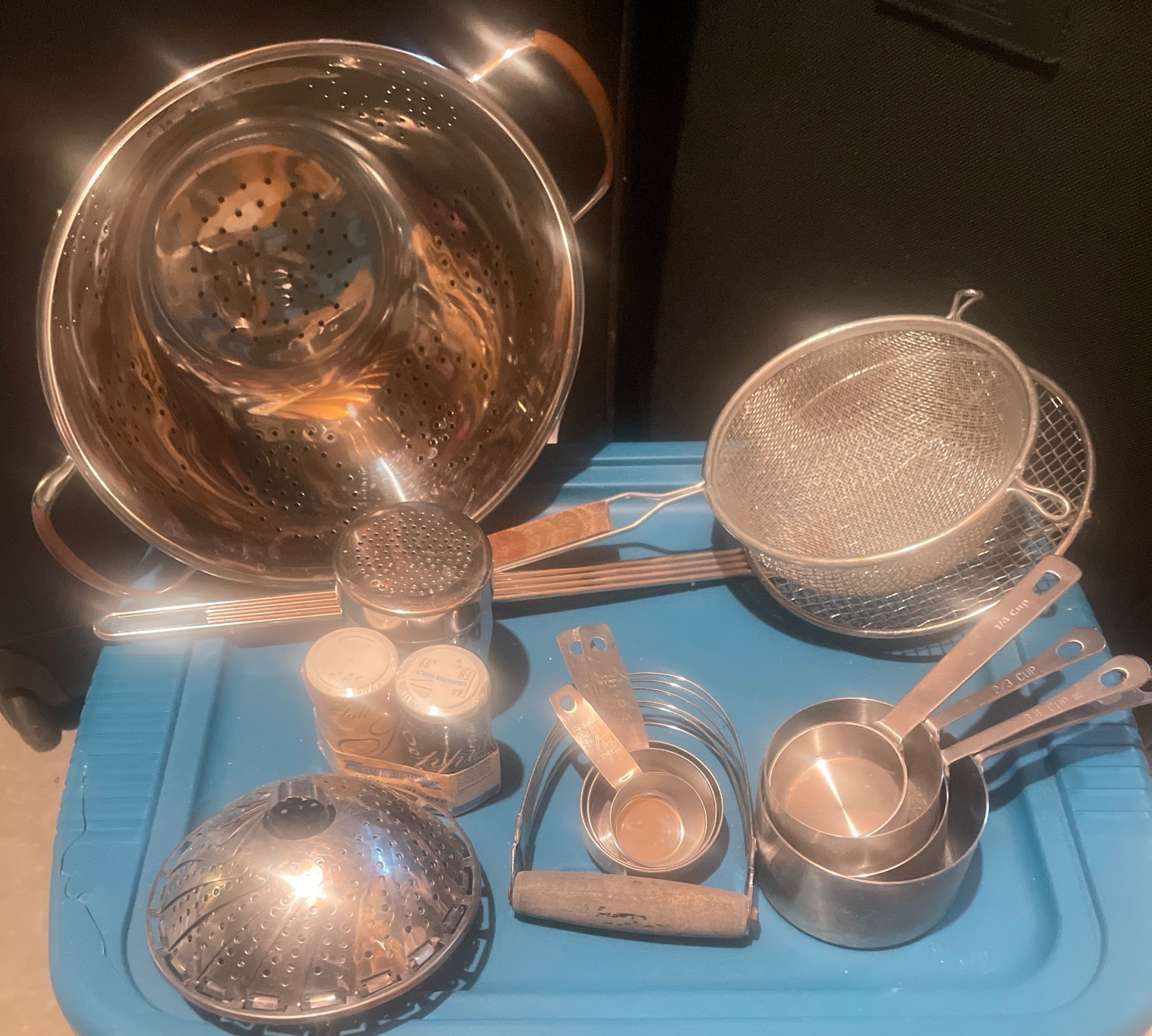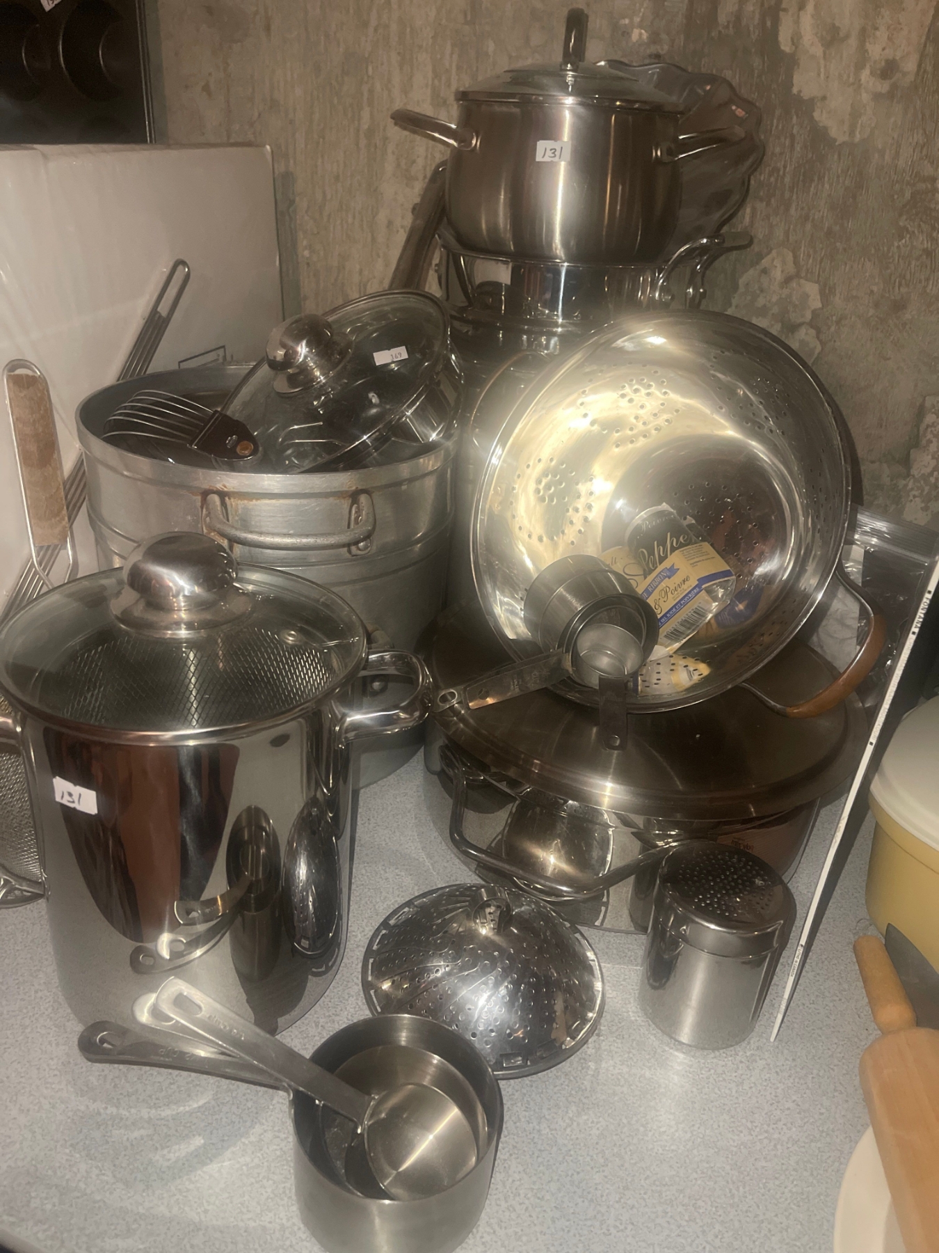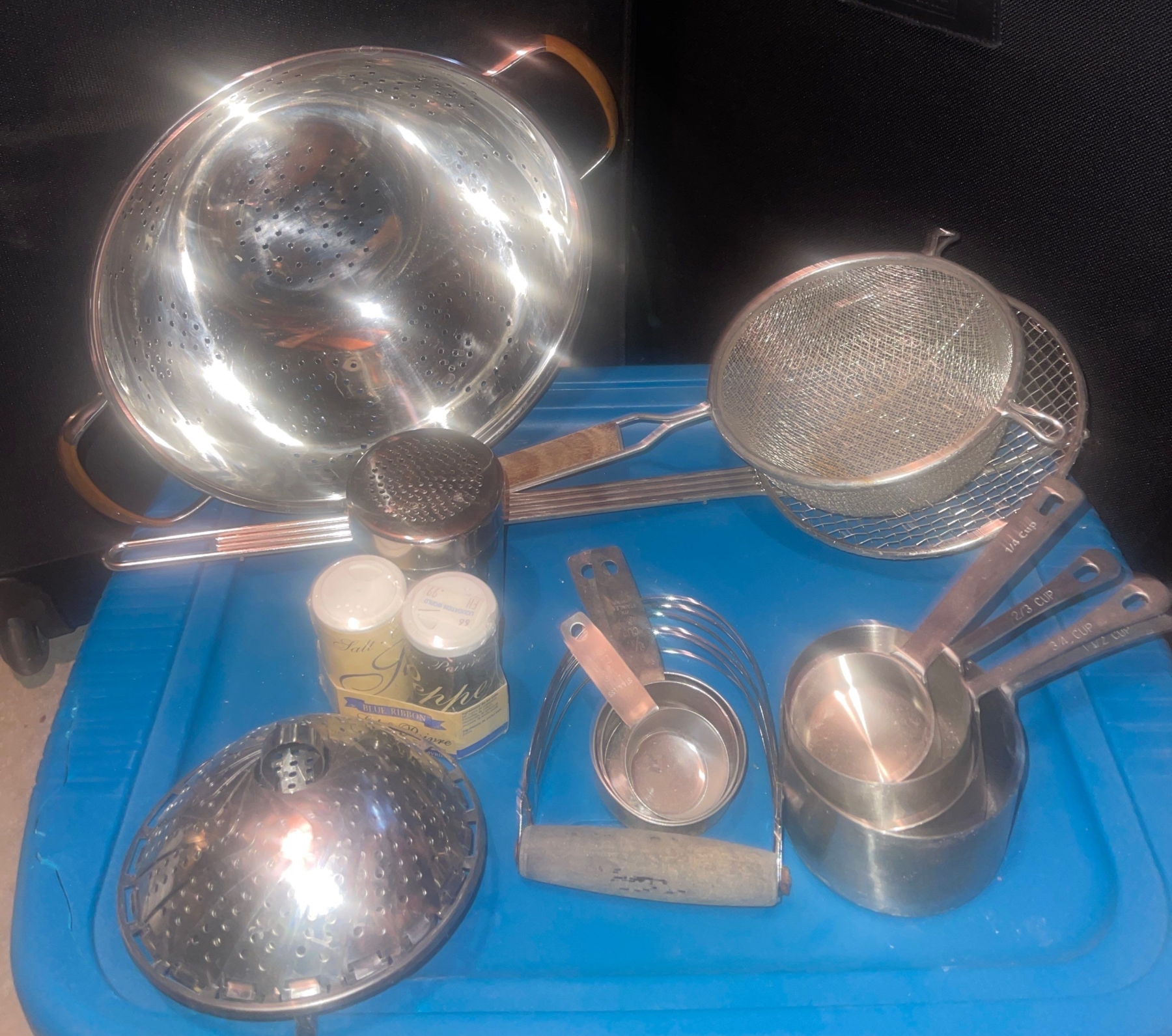 Beautiful Pots & Pans Very Large Some Small, Strainers Measuring Cups & More