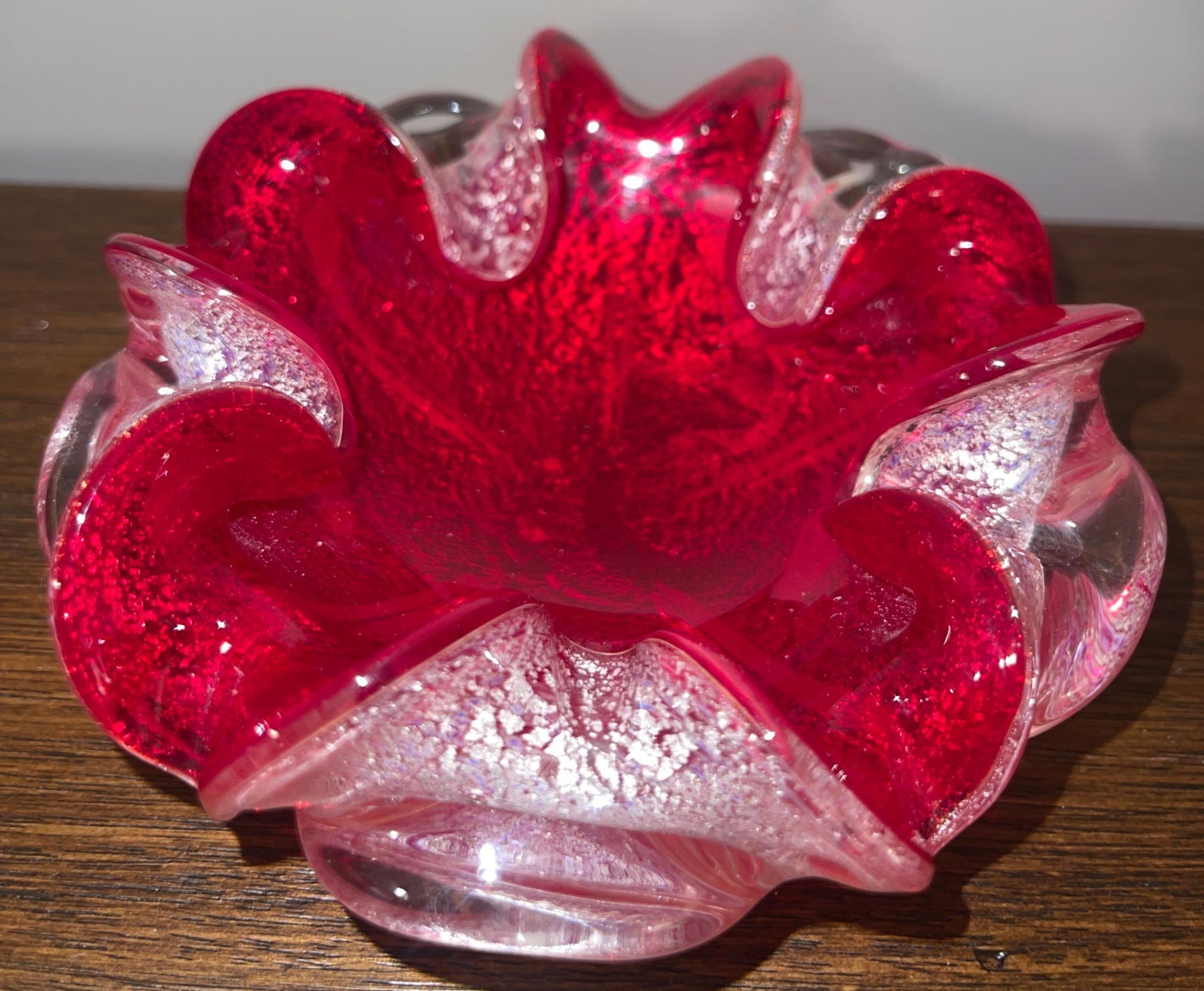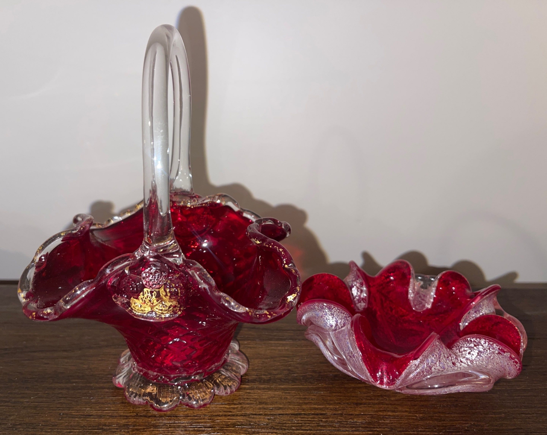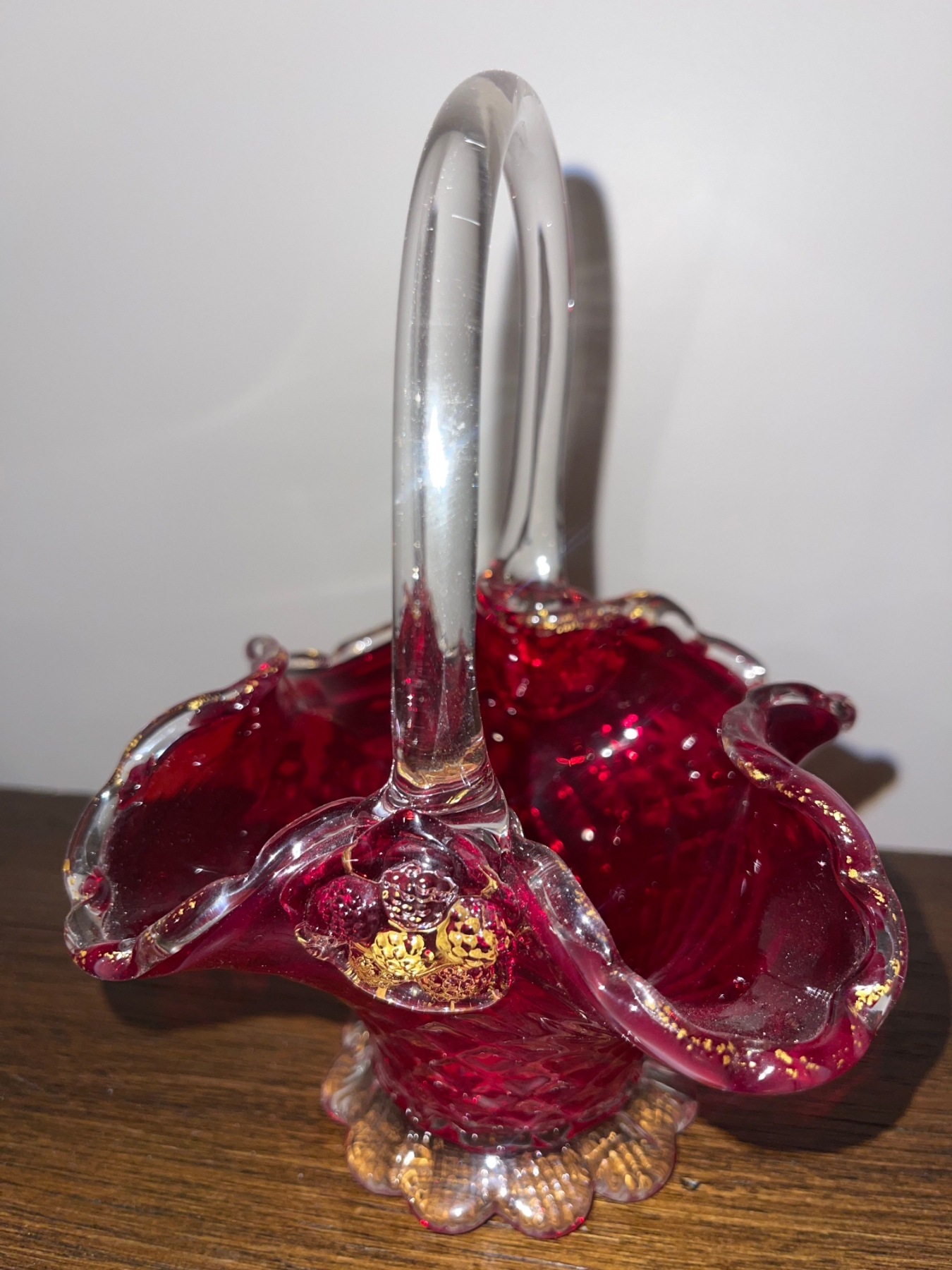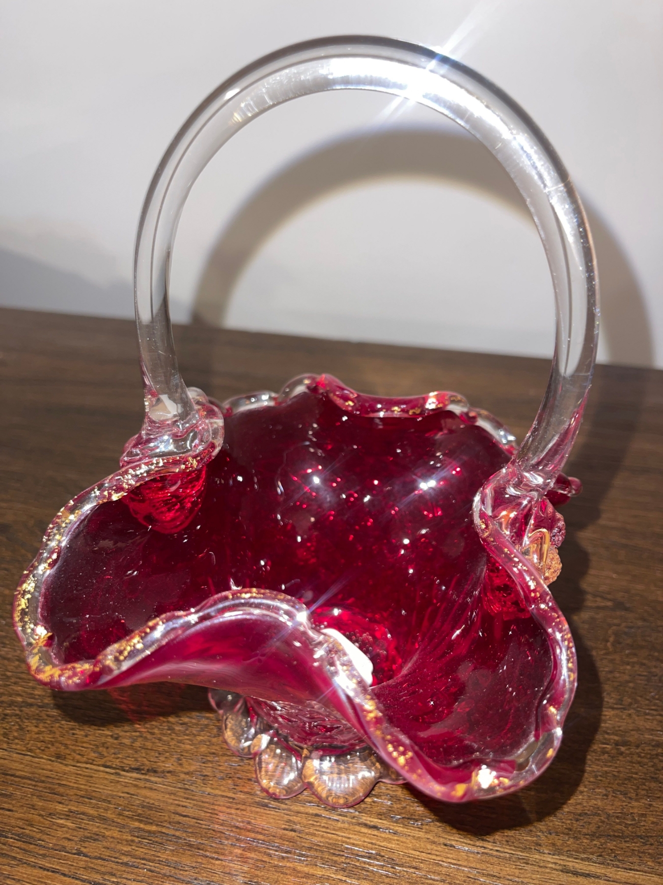 Beautiful Ruby Red Murano Art Glass Basket w/ Candy Dish 7T