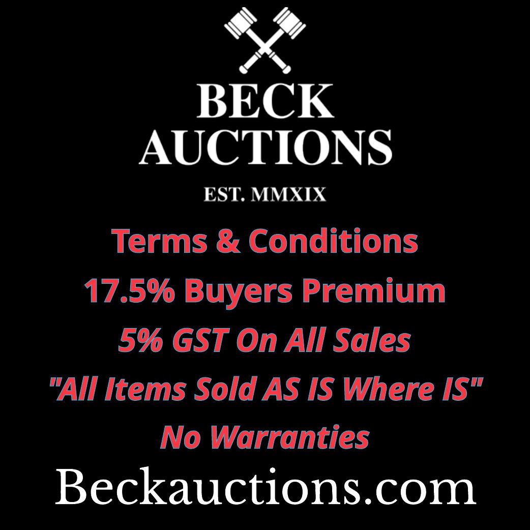 Beck Auctions Inc. has the right to refuse service, remove a sale item, and cancel a sale at any time. We are the friendliest auction house in the west, but if a customer is rude to any staff, you could risk being banned from our auctions. Our goal is to make every auction fun for everyone involved.