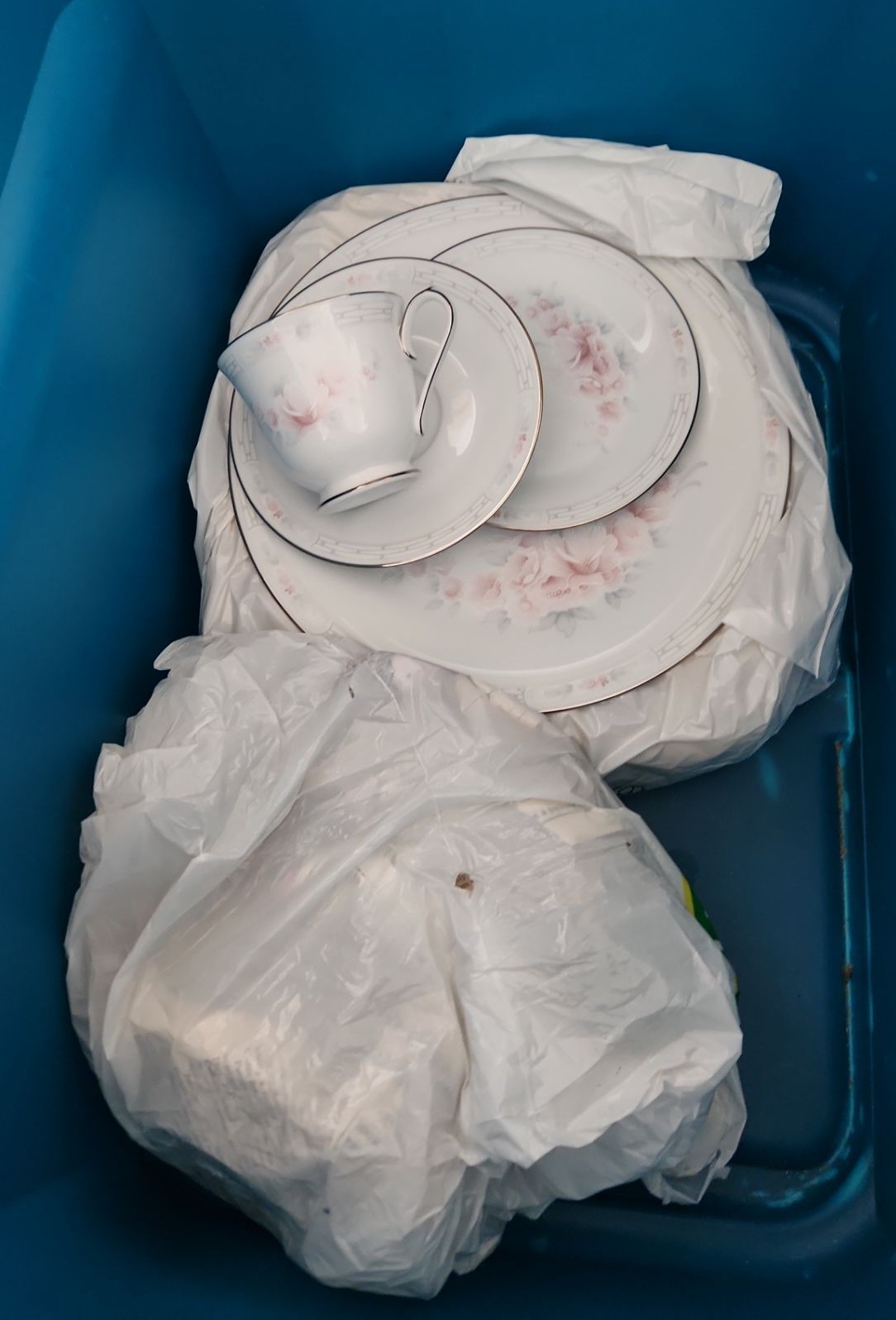 Bin w/ Noritake Japan "Carthage" Pattern Dinnerware- Plates, Cups, Saucers