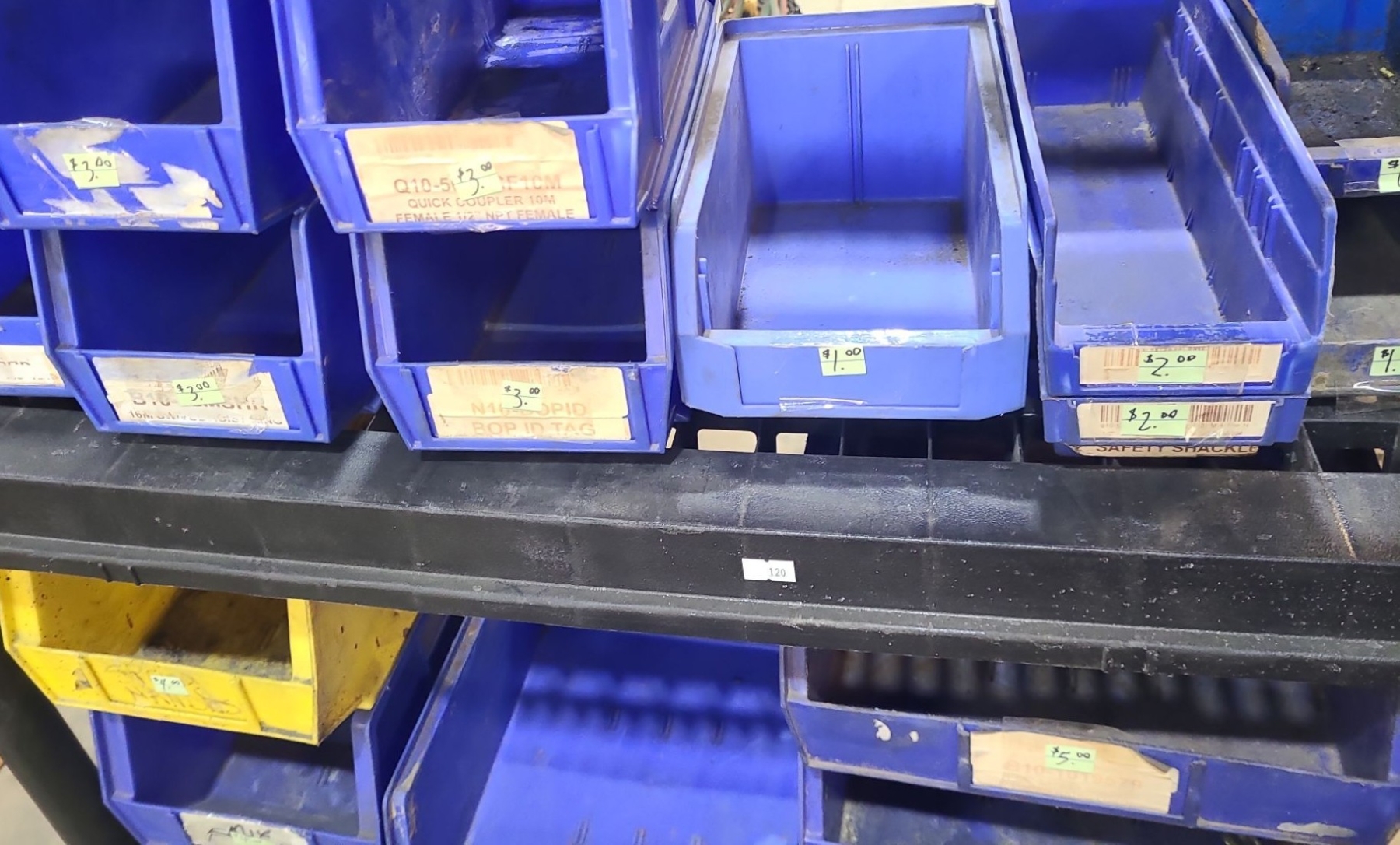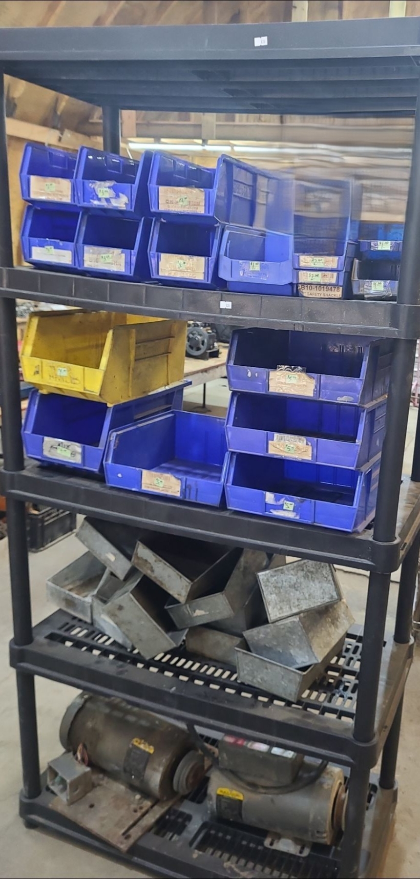 Bins, Metal Trays, Industrial Baldour Motors Stacked Neatly On Shop Shelving Unit& More