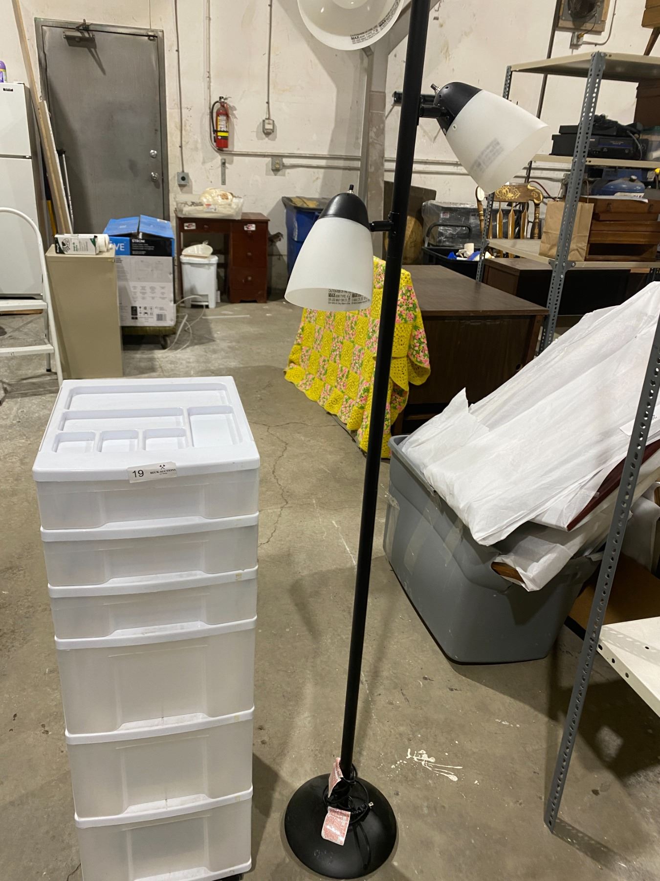 Black 3 Headed Lamp and Plastic Storage Unit; Model Info for Lamp in Pictures.