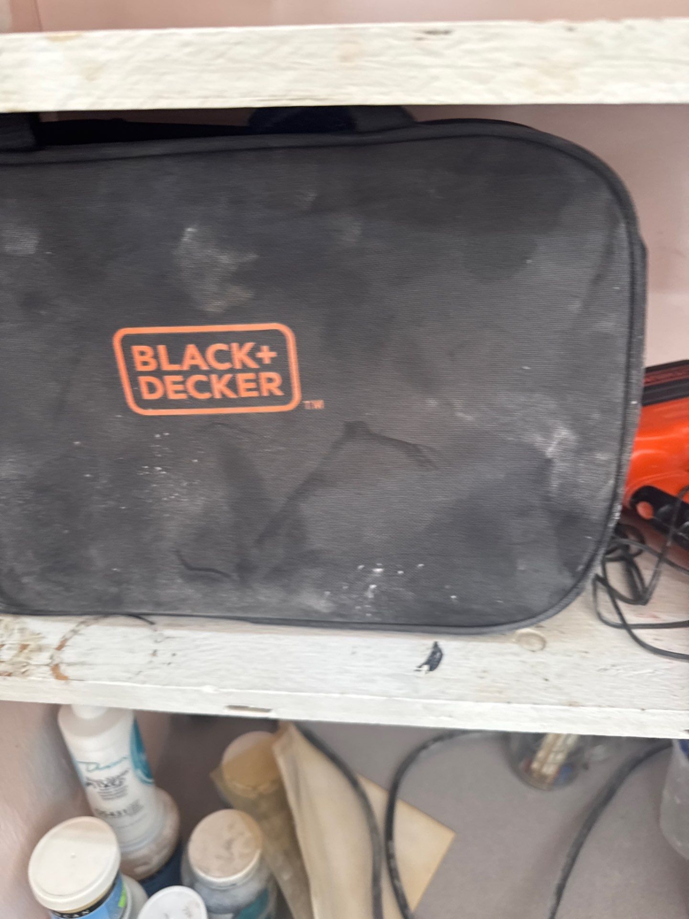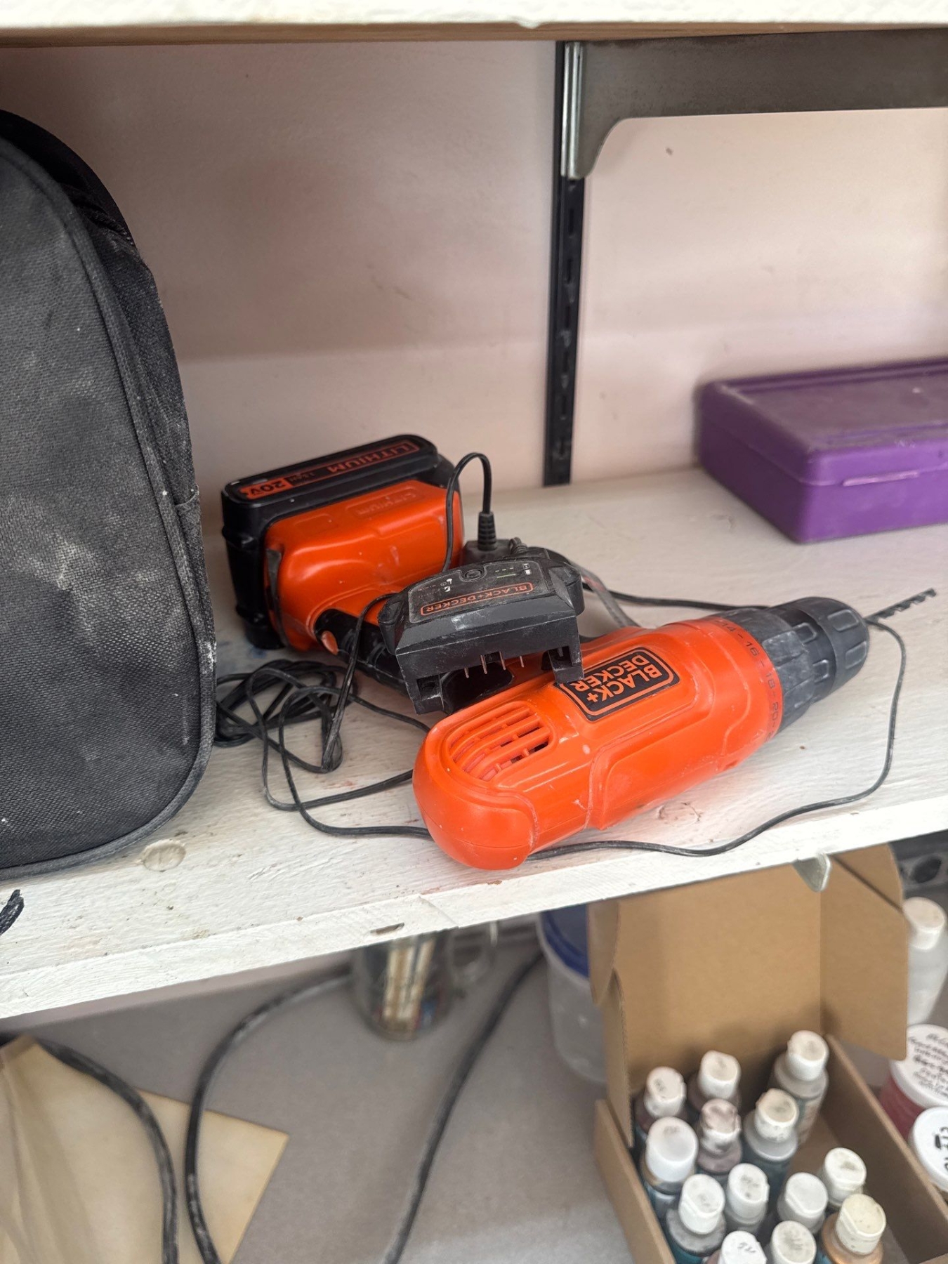 Black & Decker drill 20 V and battery pack with tools and two mercury, diamond cutters and polishers with miscellaneous tools and other items including chairs, and paint brushes