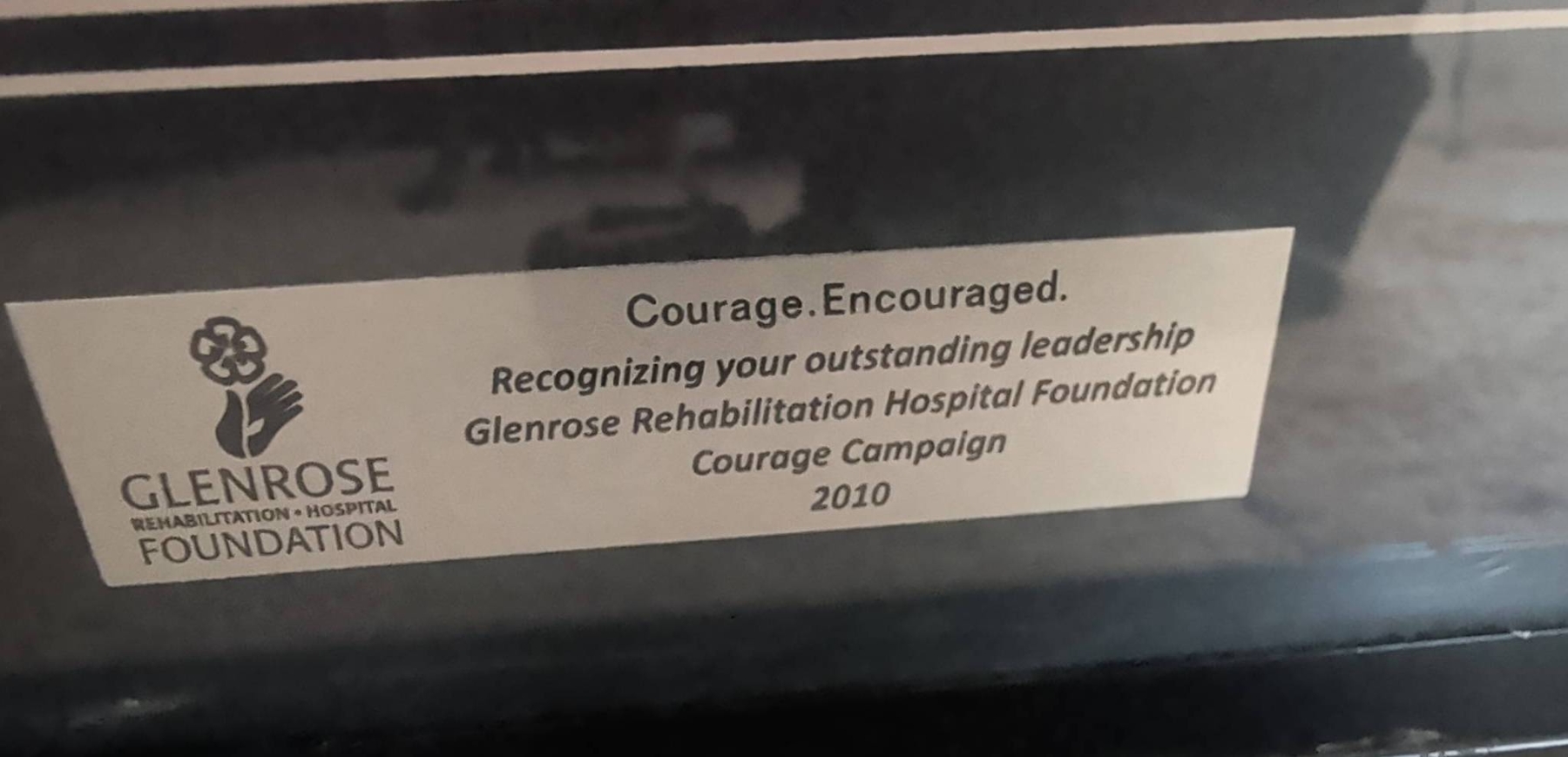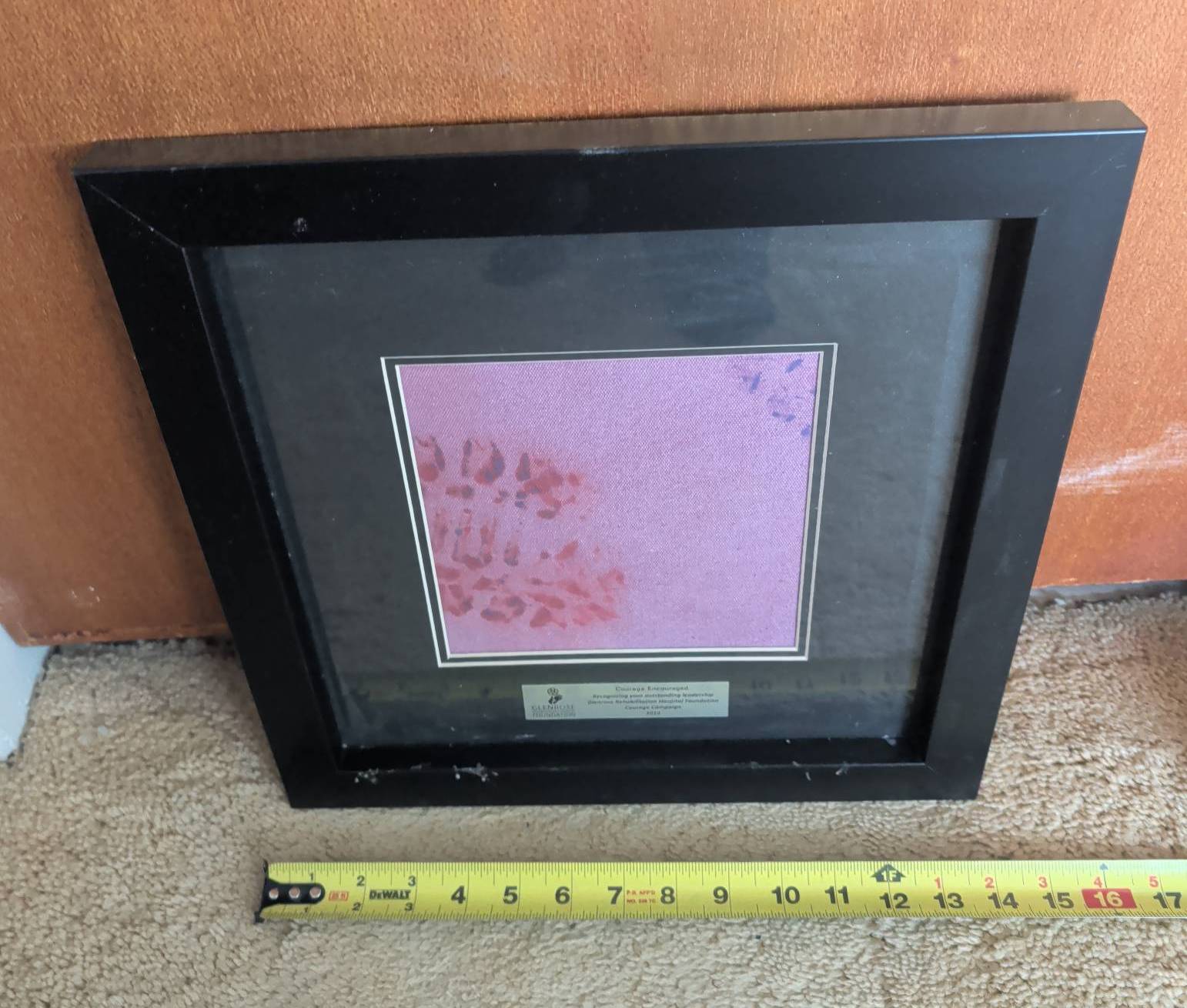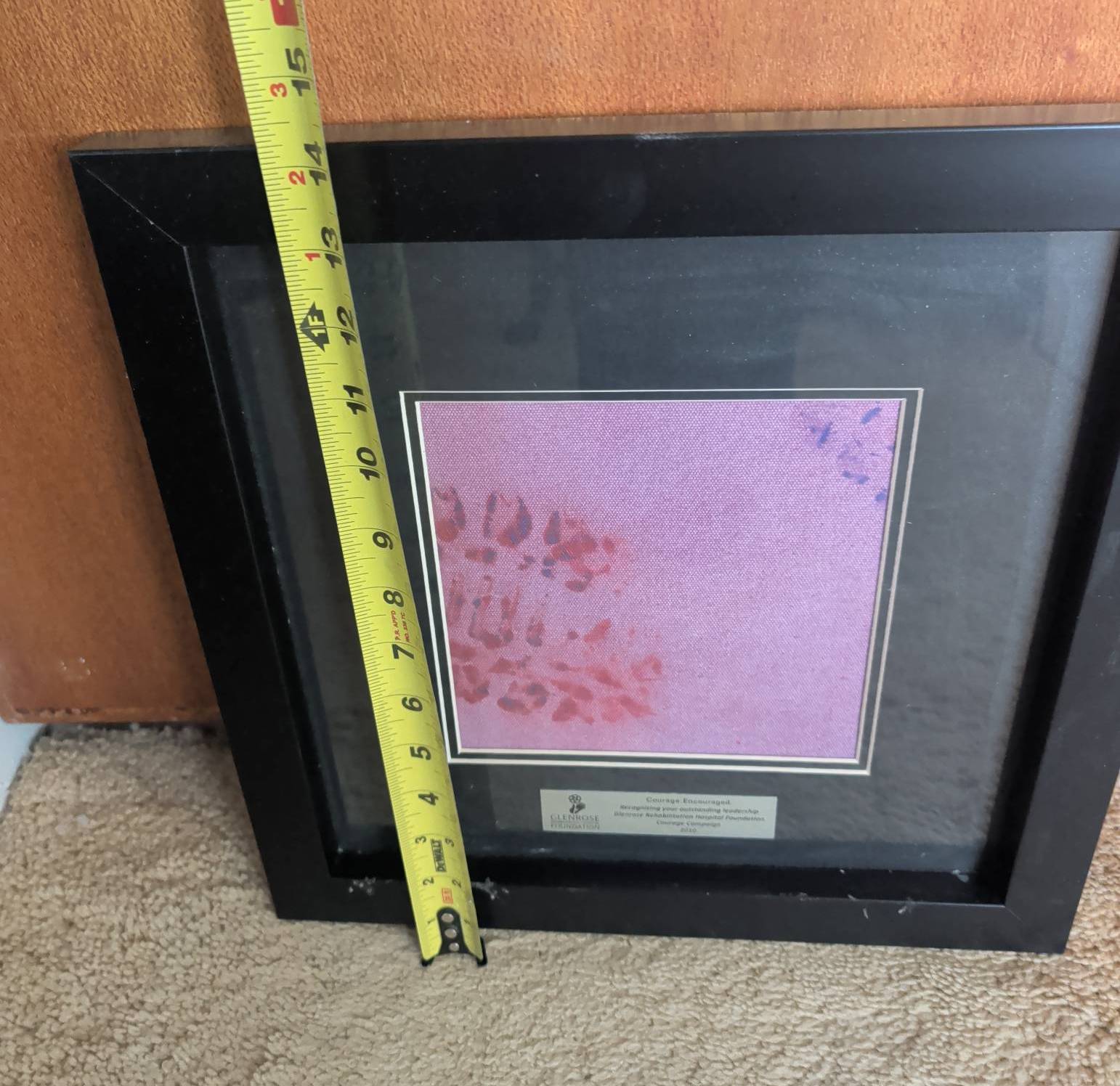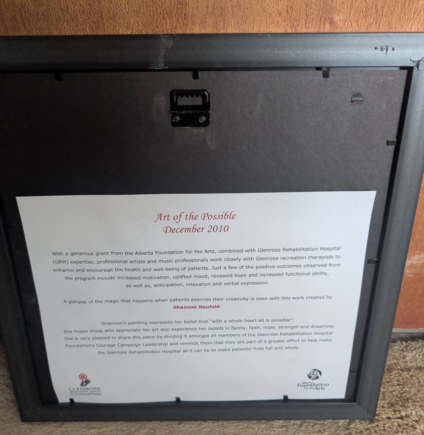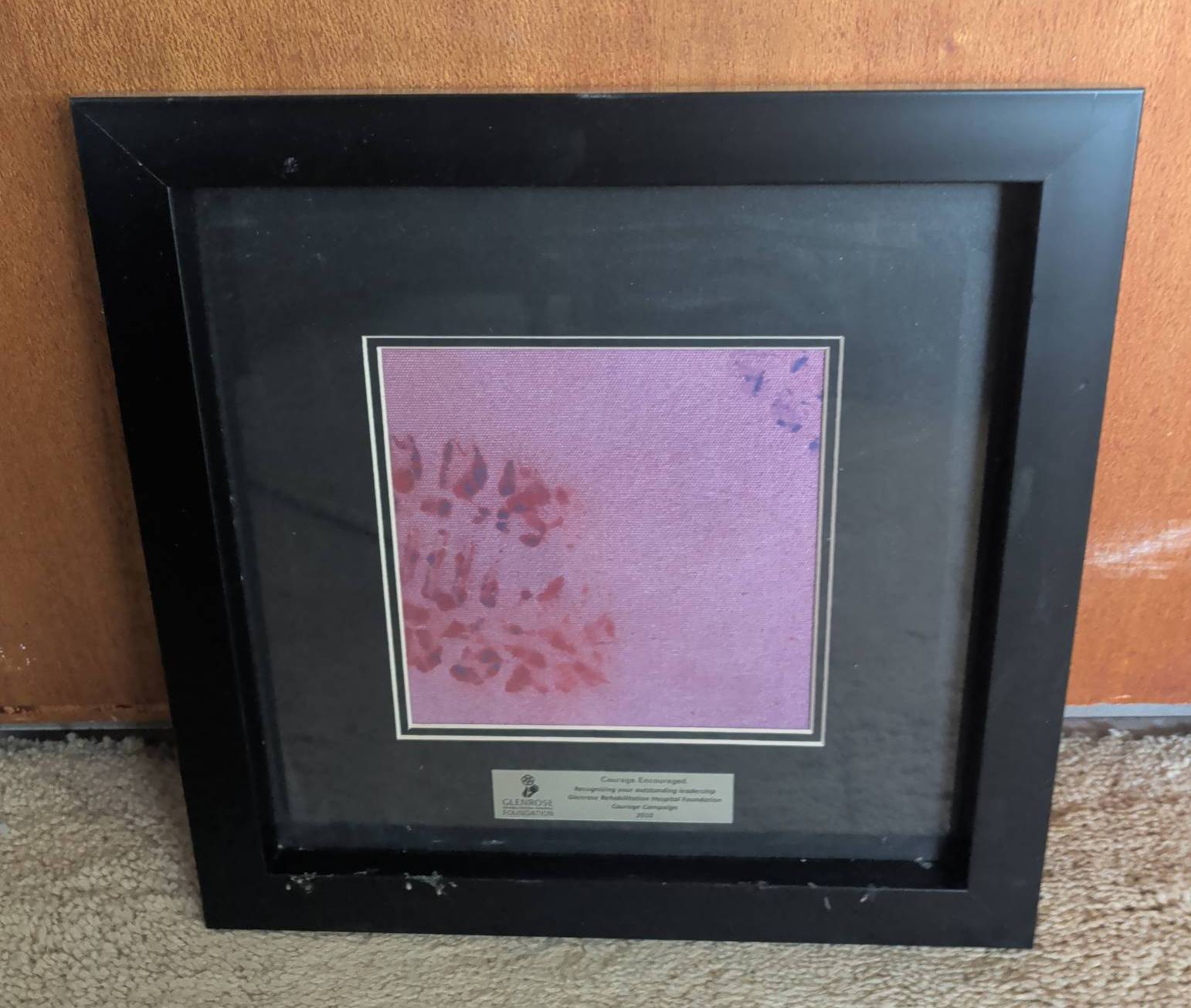 Black-framed art piece measuring approximately 10 inches by 10 inches. The frame contains a purple-toned artwork with floral details and features a plaque recognizing leadership in the Glenrose Rehabilitation Hospital Foundation’s Courage Campaign (2010). The back provides additional information about the piece, titled ‘Art of the Possible,’ created in December 2010. Ready to hang.