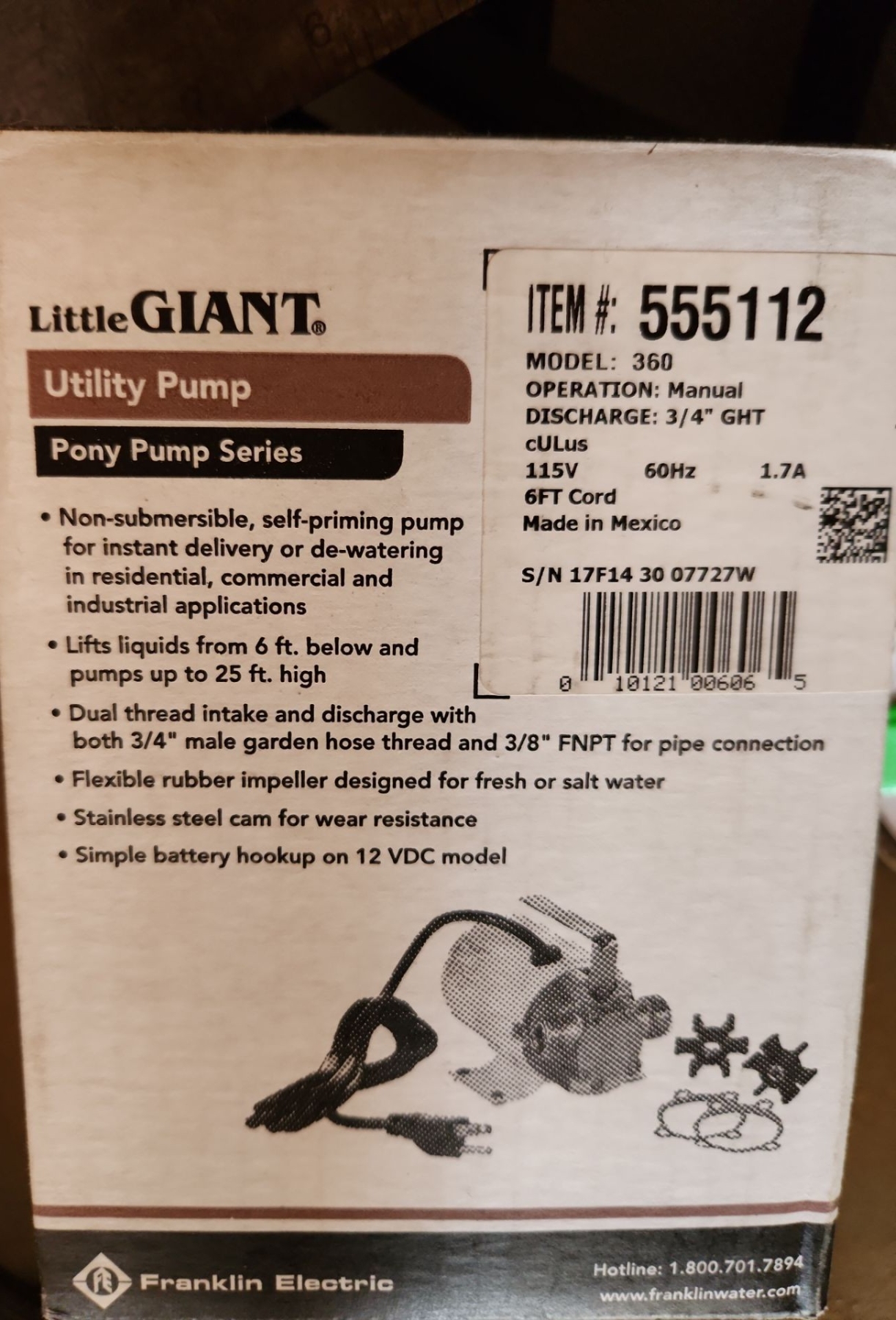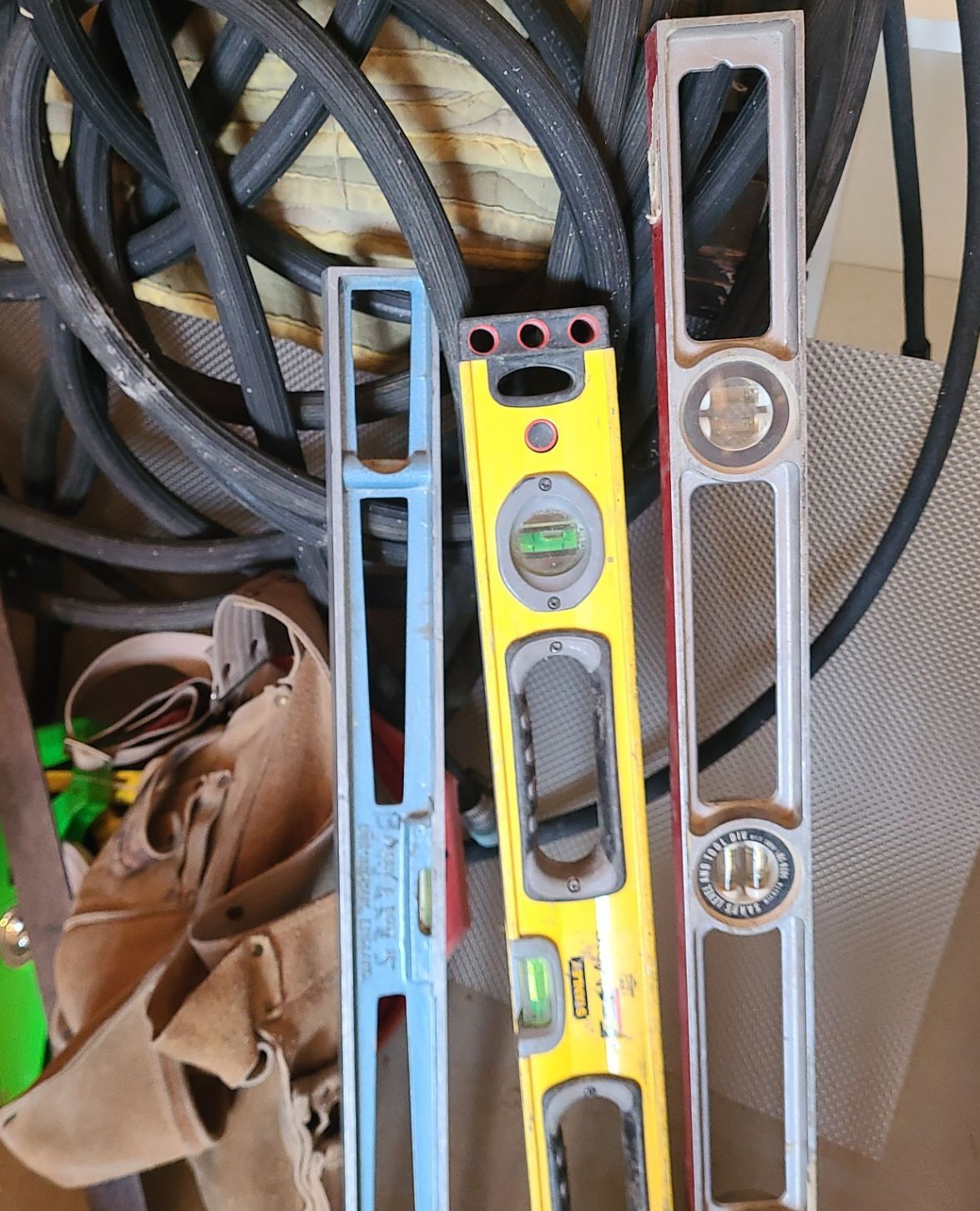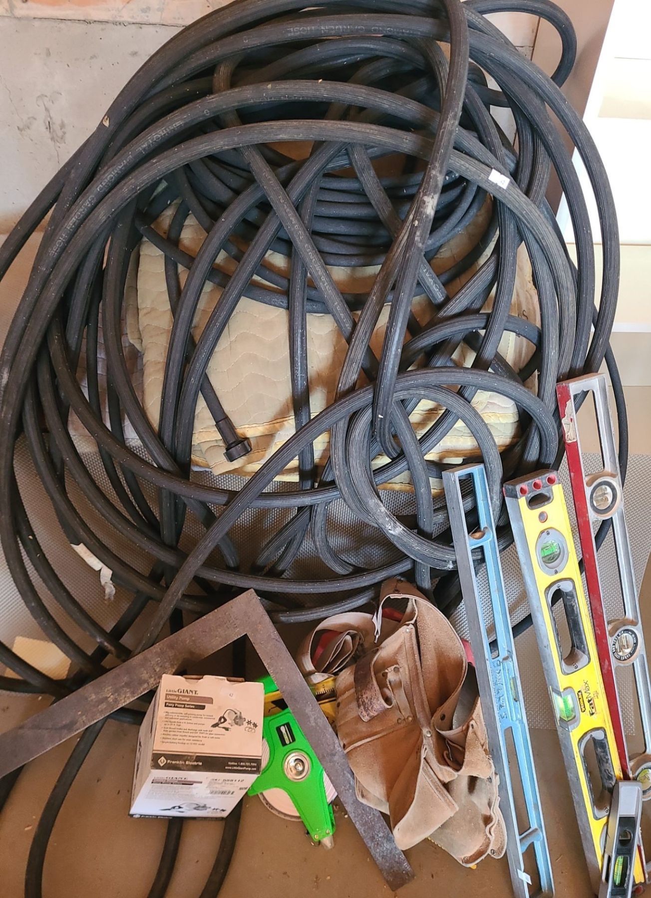 Black Garden Hose, Levels, Toolbelt, Little Giant Utility Pump Model 360, Extension Cord
