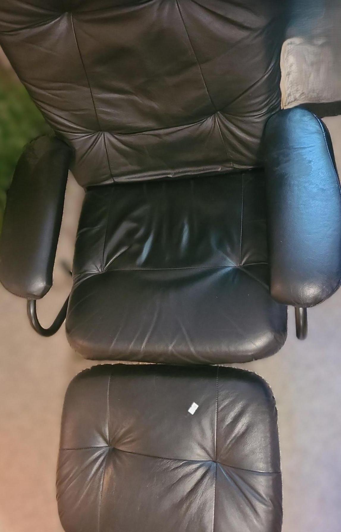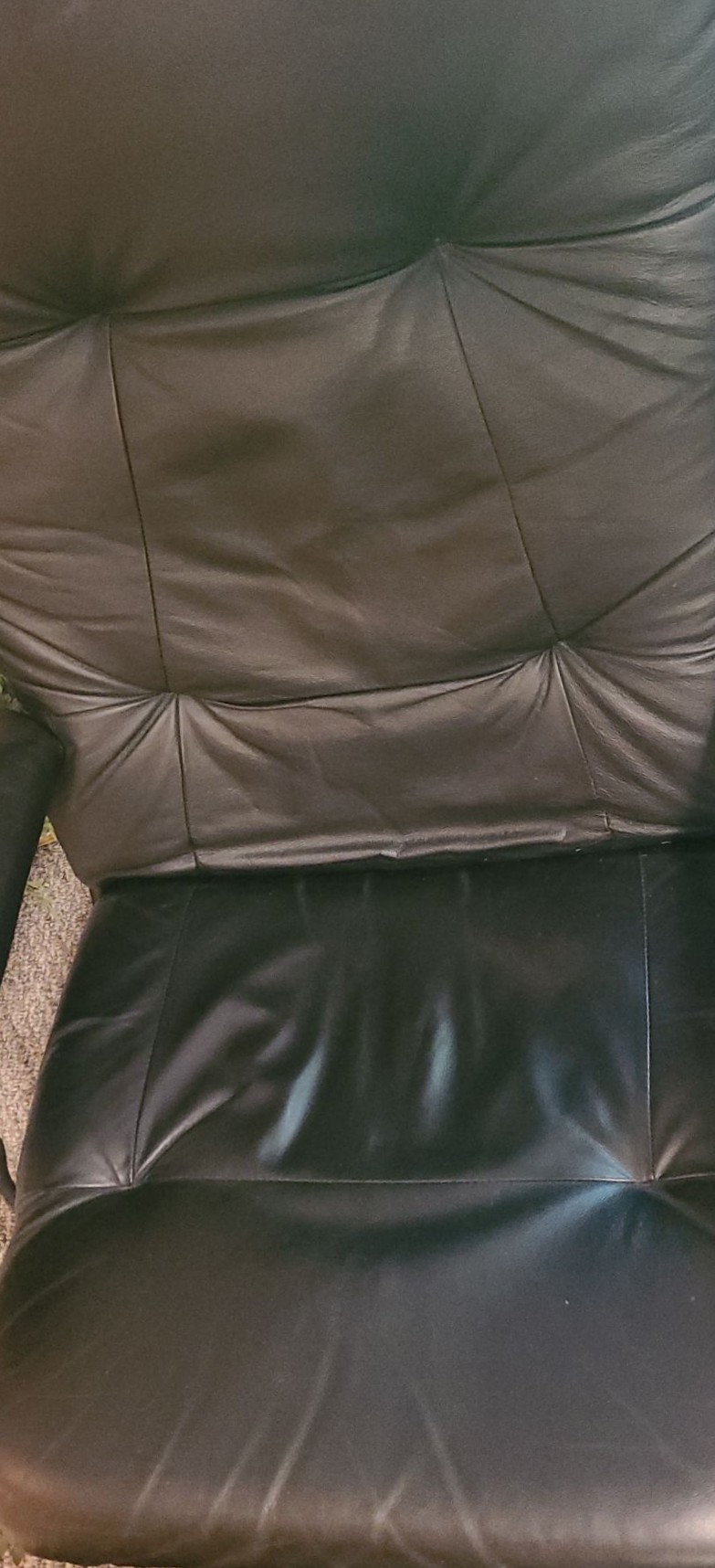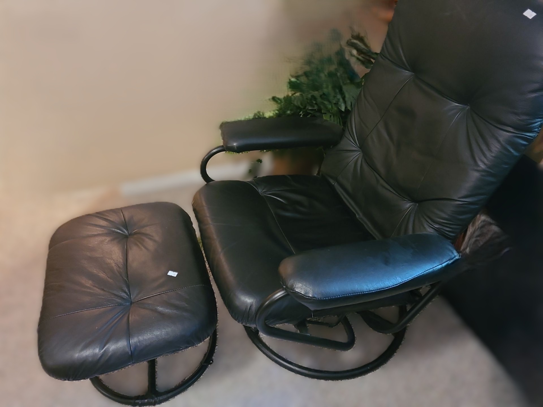 Black Leather Chair 29 W, 23 D, 38 T and Footstool 20 W, 16 D, 14 T