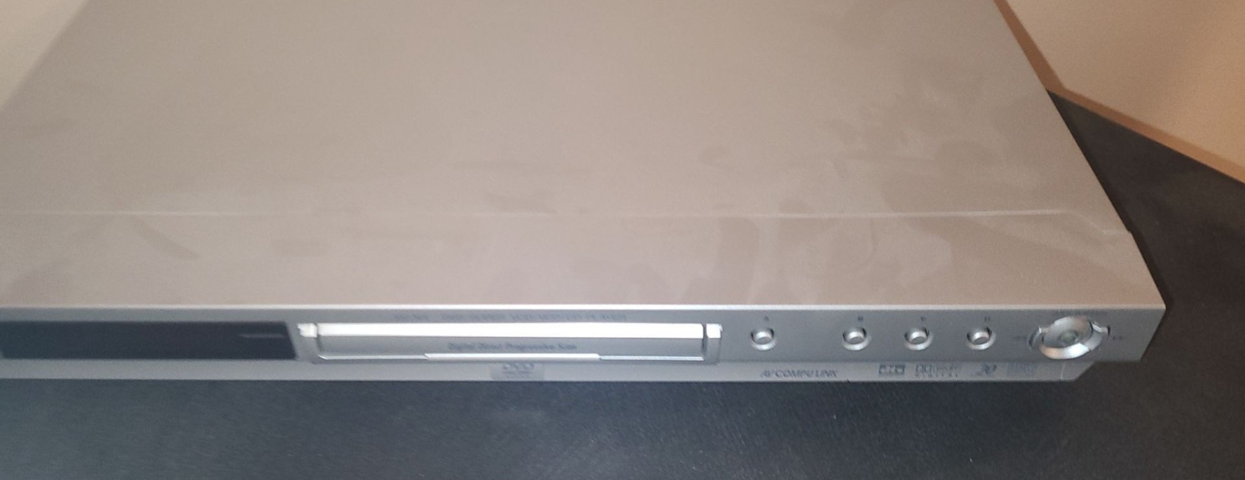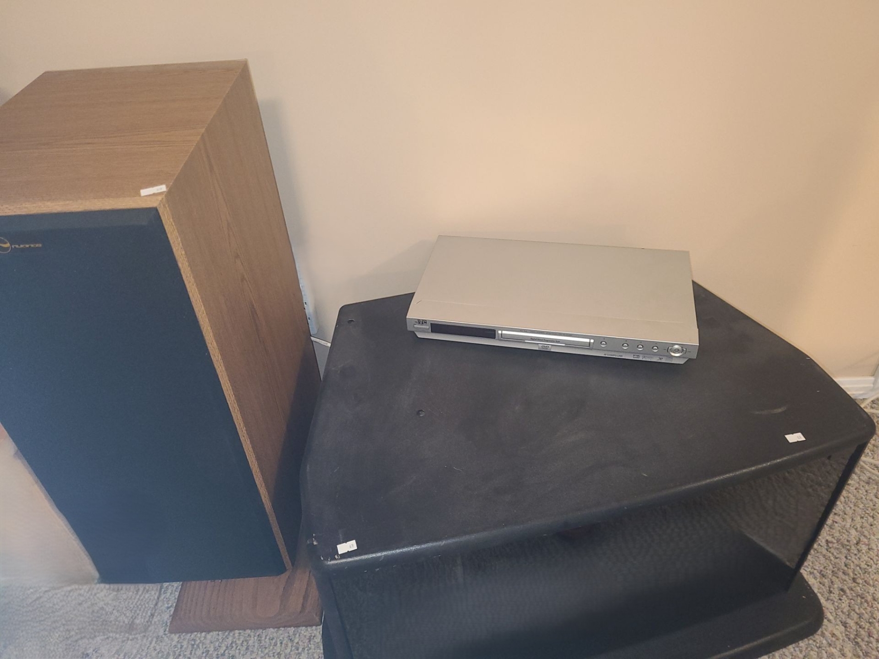 Black MDF TV Stand 30 W, 20 D, 18 T, Two Speakers 11 W, 16 D, 34 T, Compulink DVD Player