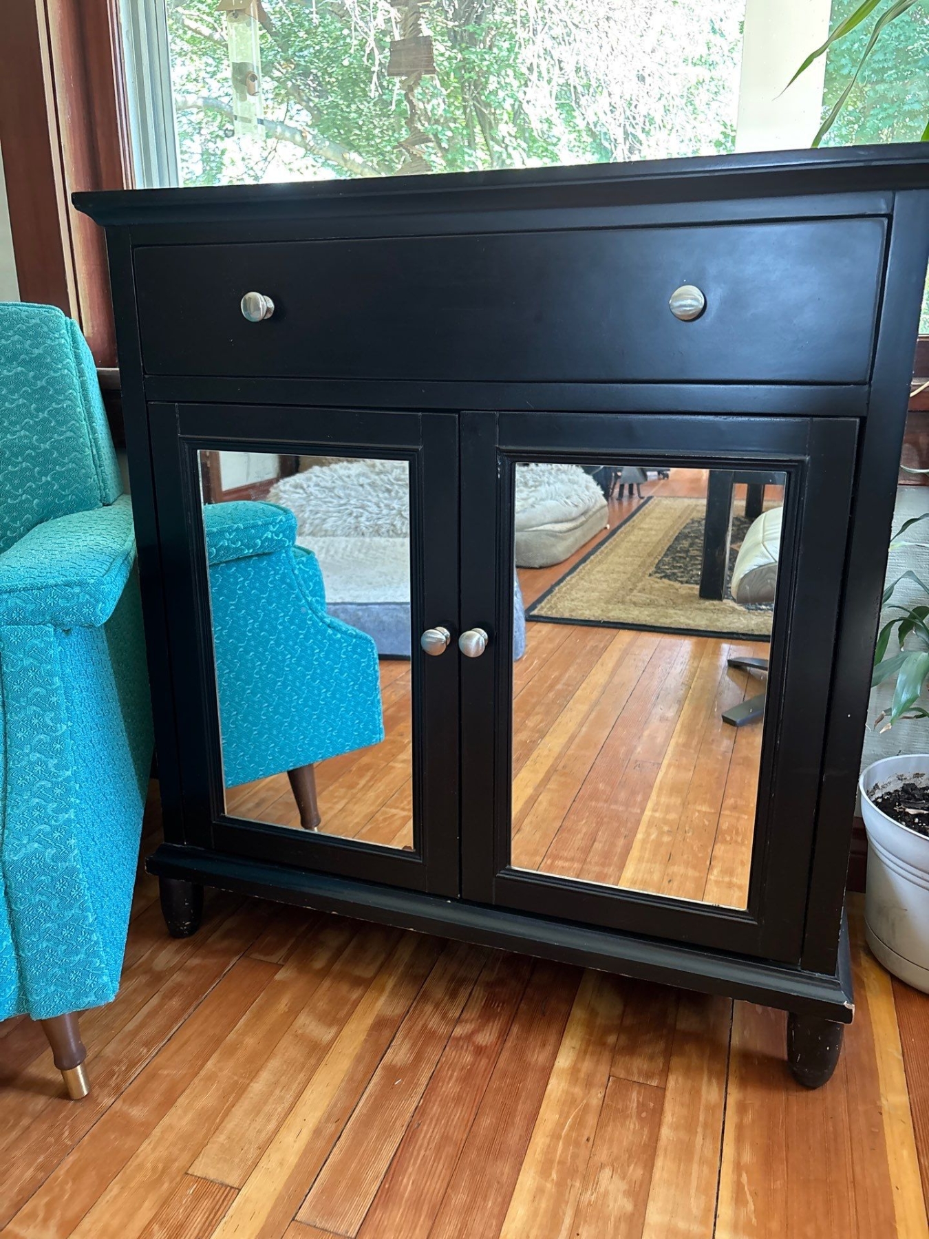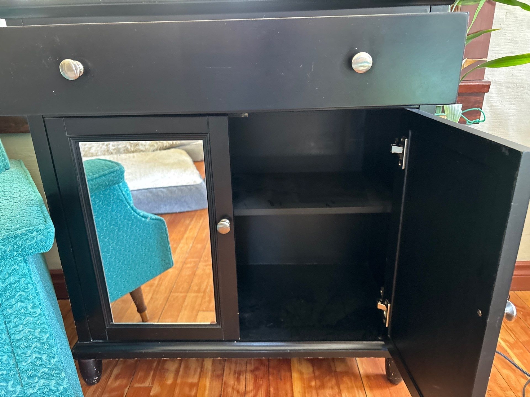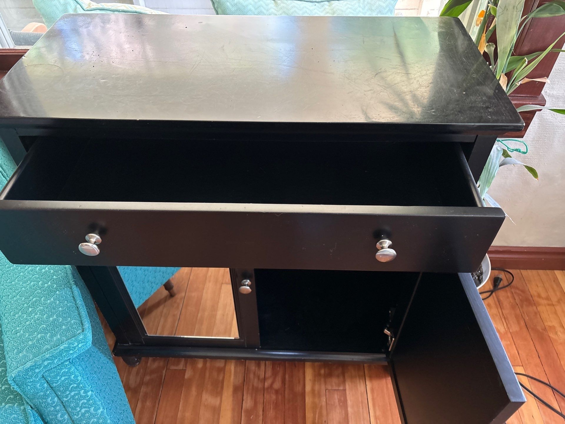 Black Wood hutch With Glass Front Doors & drawers H34" W32" D15"