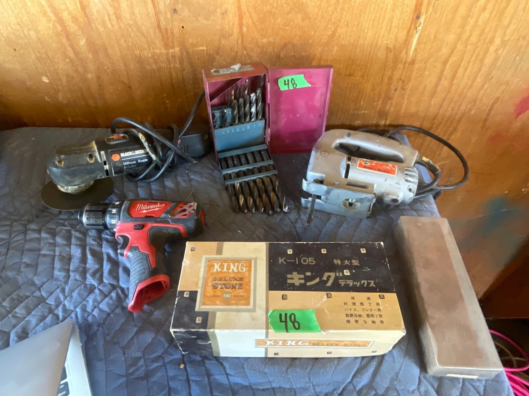Black and Decker Angle Grinder, Miwaukee Drill (NO BATTERY), B&D Jigsaw, King Deluxe Stone x2, Drill Bits.