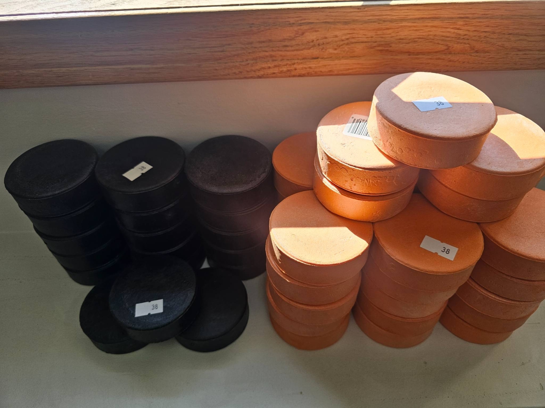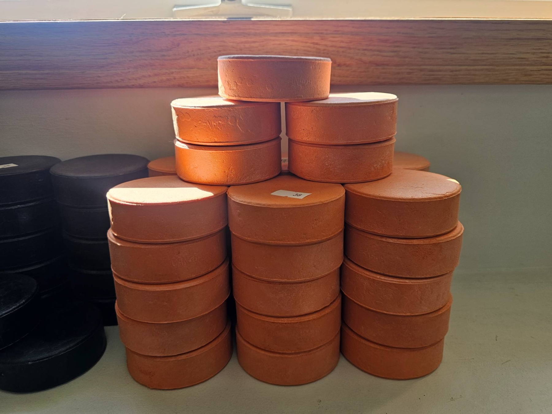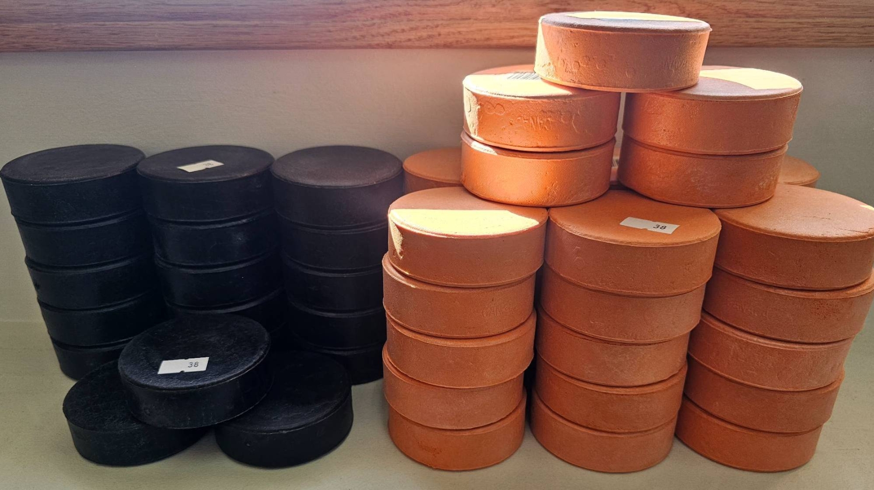 Hockey pucks in two colors: black and orange. The black and orange pucks are standard size and shape, suitable for ice hockey or training purposes. The lot includes multiple stacks of each color, with no visible major wear or damage.