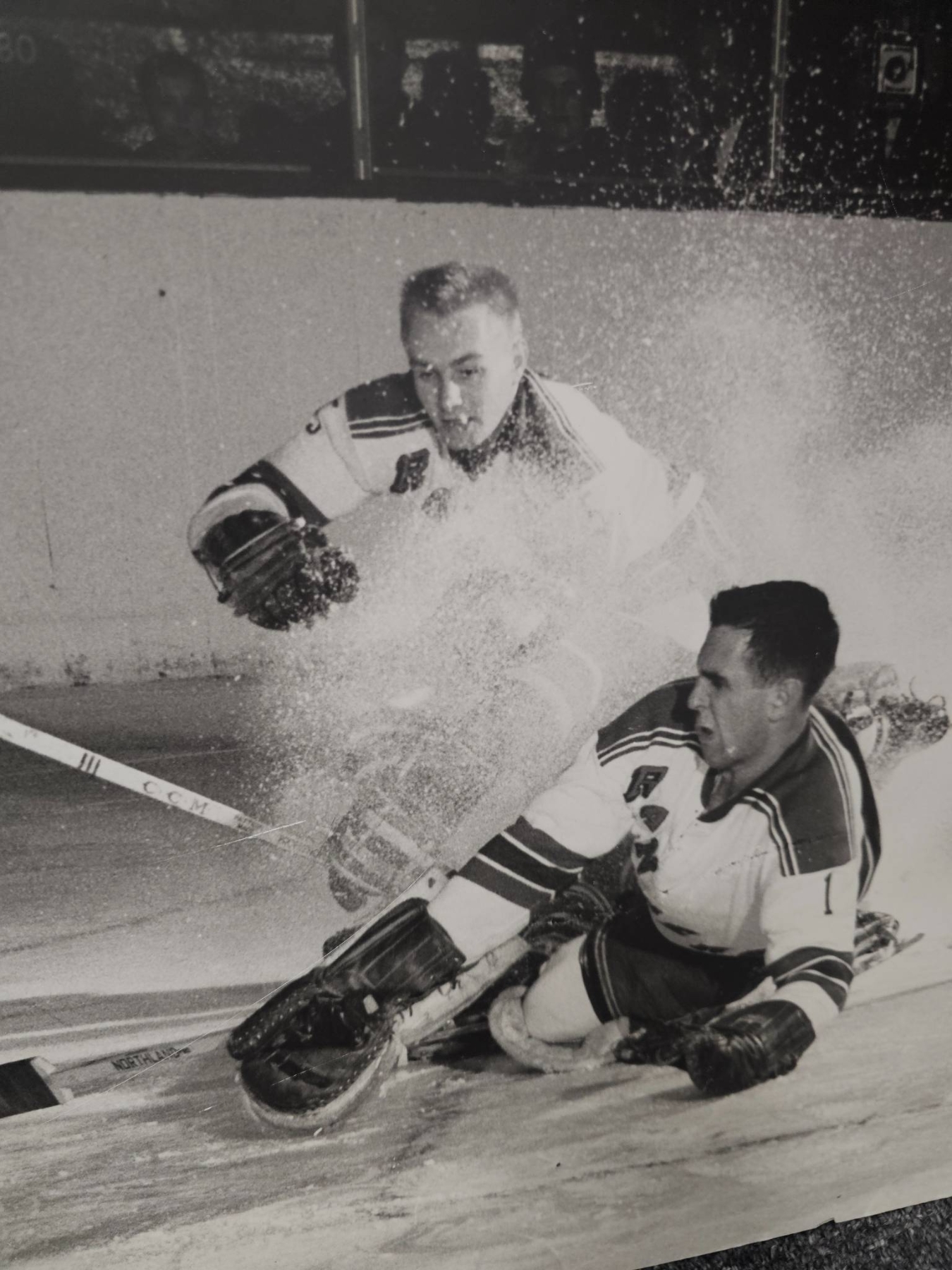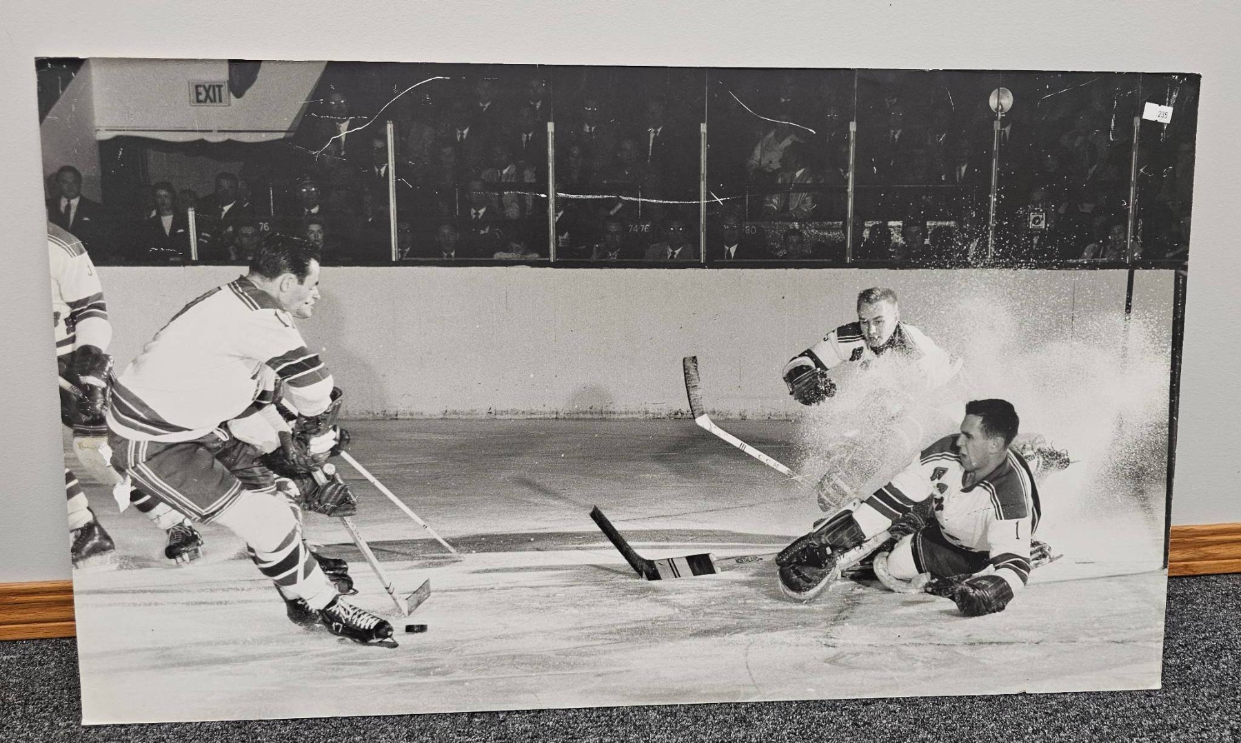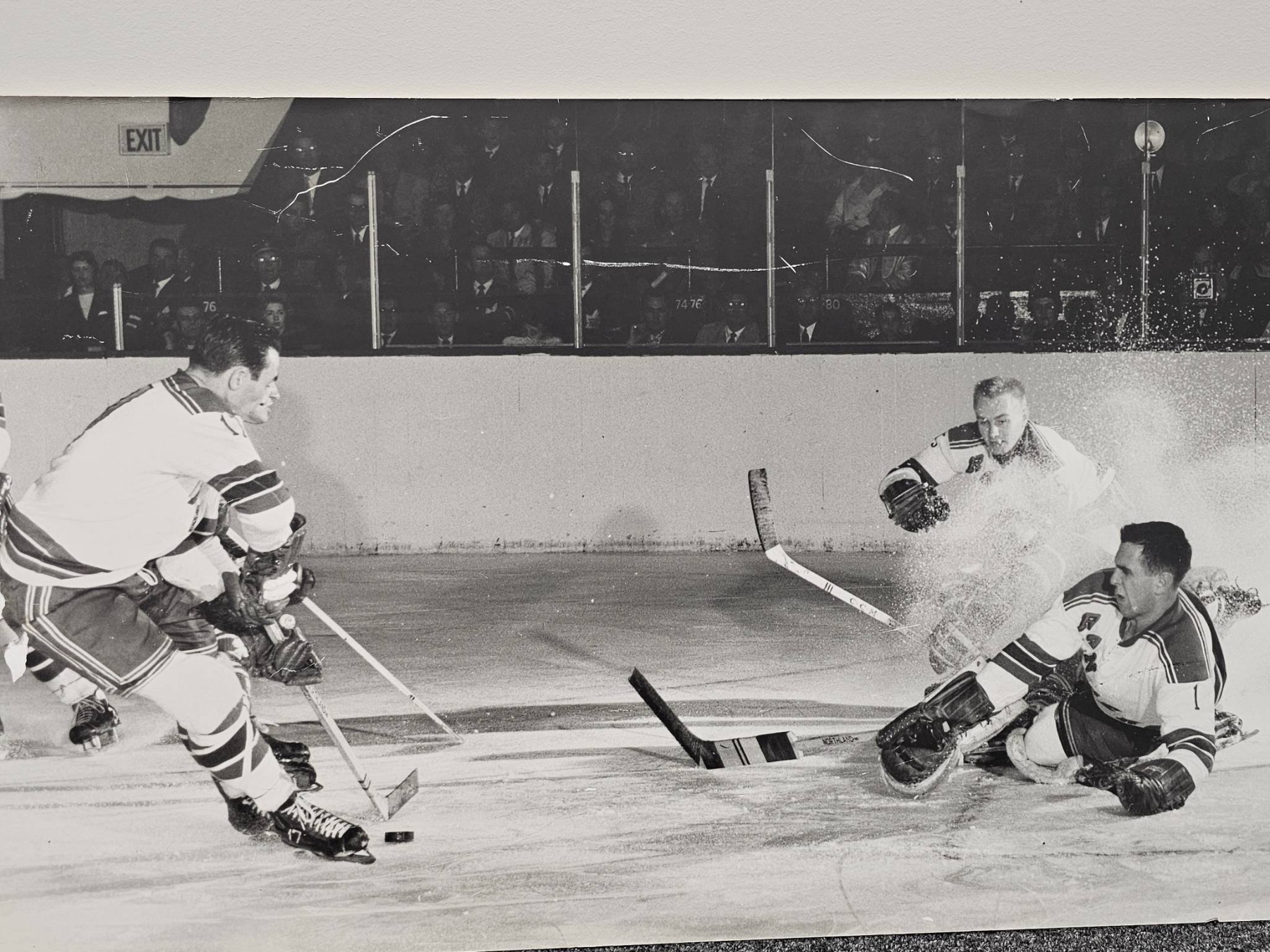 Large black-and-white photograph capturing a dynamic hockey scene with players mid-action on the ice. Measuring 33x19, this piece highlights intensity and motion as players vie for the puck, framed by the rink environment. Great for hockey enthusiasts or those seeking an impactful sports-themed display piece.