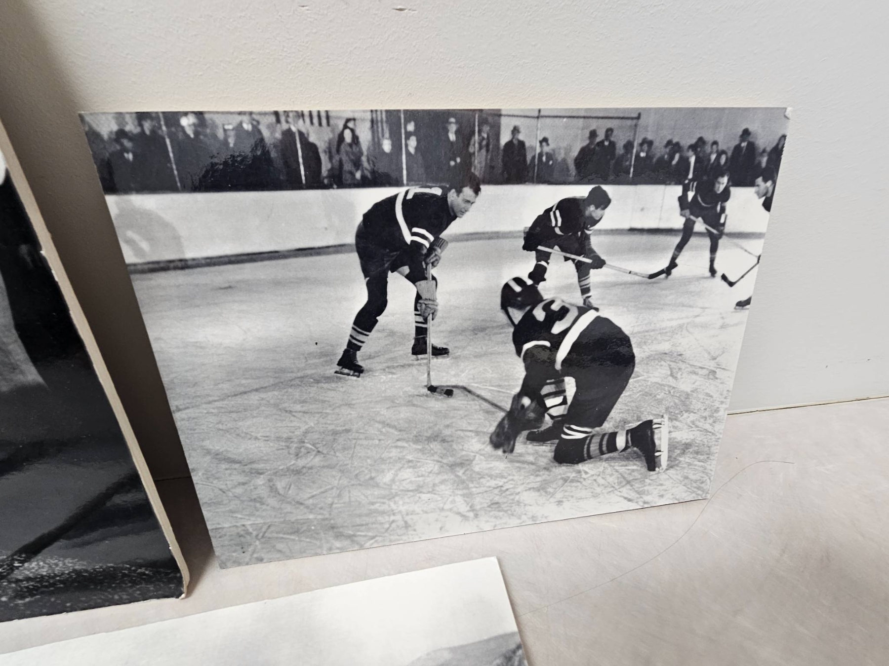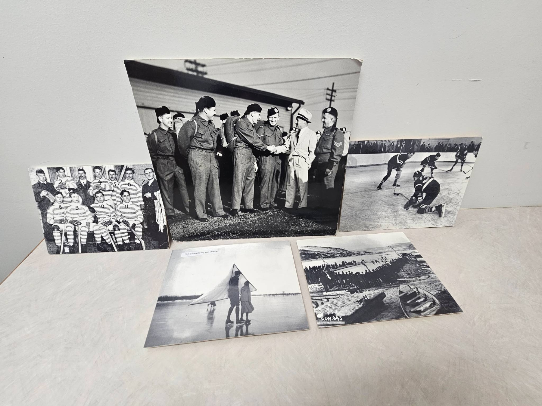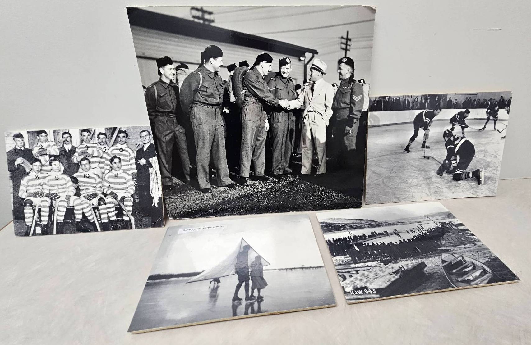 Five black-and-white historical photographs depicting a range of scenes, including ice hockey games, team portraits, and a military gathering. These images highlight both early hockey and wartime camaraderie, capturing moments of shared history and sporting spirit. Suitable for collectors of sports memorabilia or historical photography.