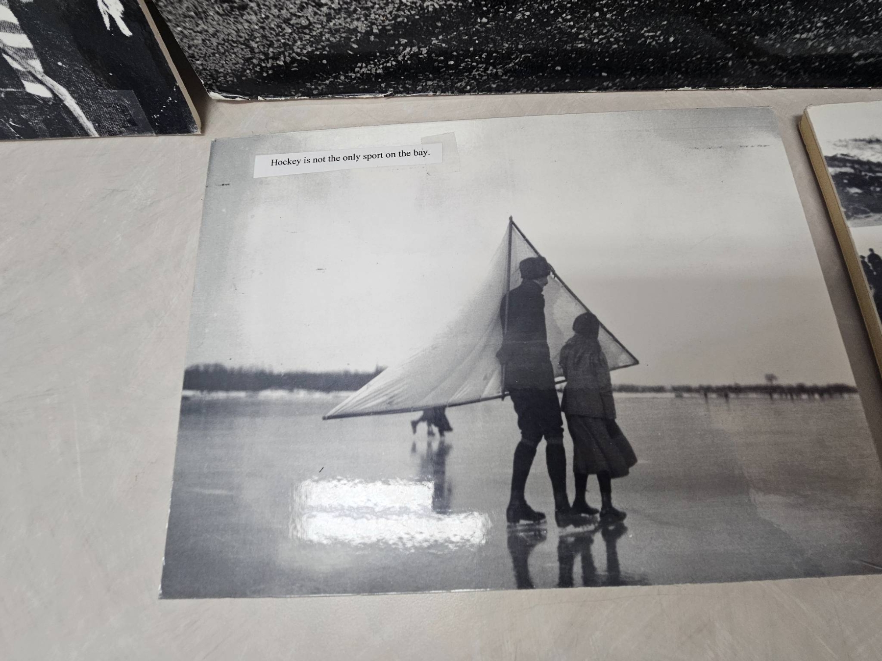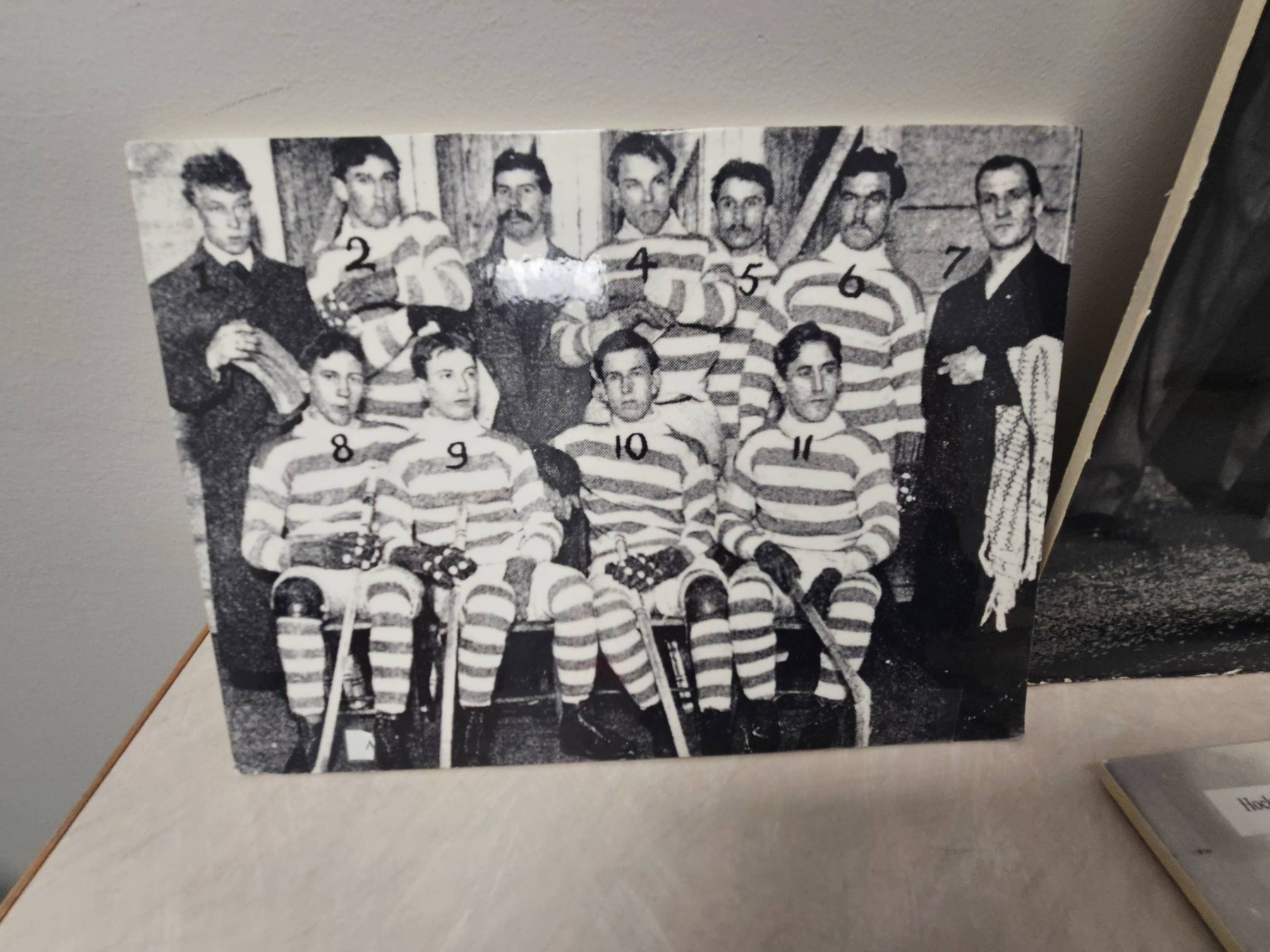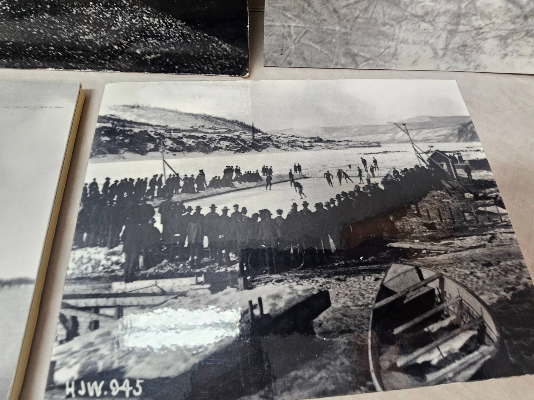 Five black-and-white historical photographs depicting a range of scenes, including ice hockey games, team portraits, and a military gathering. These images highlight both early hockey and wartime camaraderie, capturing moments of shared history and sporting spirit. Suitable for collectors of sports memorabilia or historical photography.