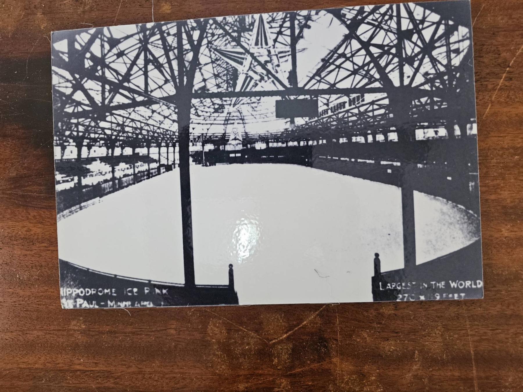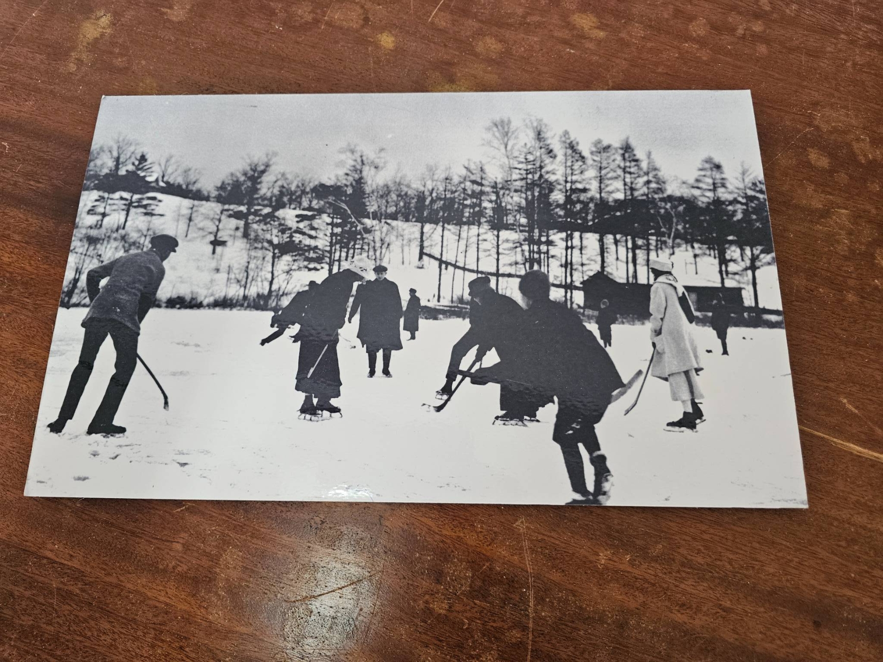 Six black-and-white photographs depicting various historical outdoor scenes, including hockey games, a stadium event, and children with sleds. One image features handwritten text reading 'Opening of the Grenadier, Rosedale Park, Toronto.' Mounted on cardstock backing. Condition is consistent with age, showing some light wear and discoloration. Suitable for historical collectors or enthusiasts.