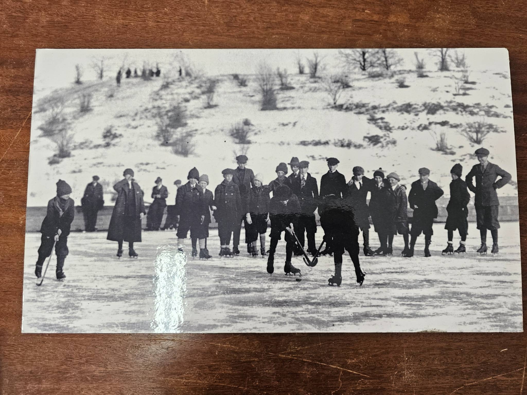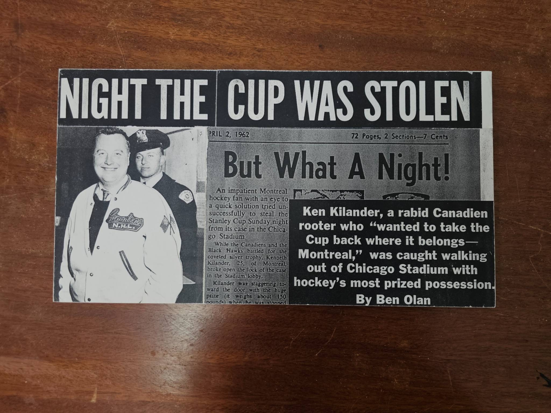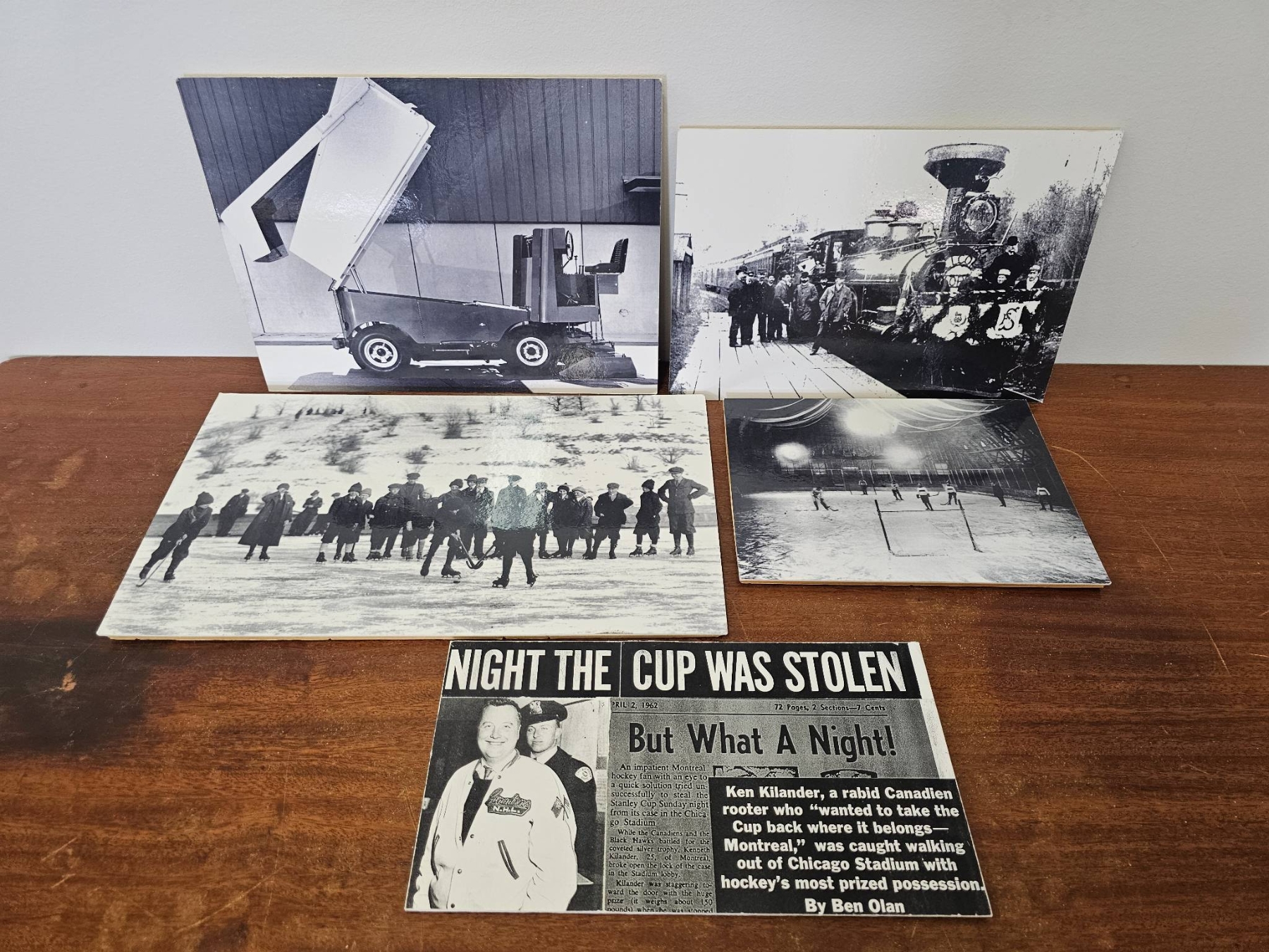 Collection includes four black-and-white photographs and a newspaper clipping titled 'Night the Cup Was Stolen.' Images depict scenes such as individuals near a vintage train, outdoor activity in snow, a hockey game, and a vehicle. The newspaper clipping references Ken McKenzie and a notable hockey-related event. Mounted and captioned on reverse. Items appear to have historical and sports significance.