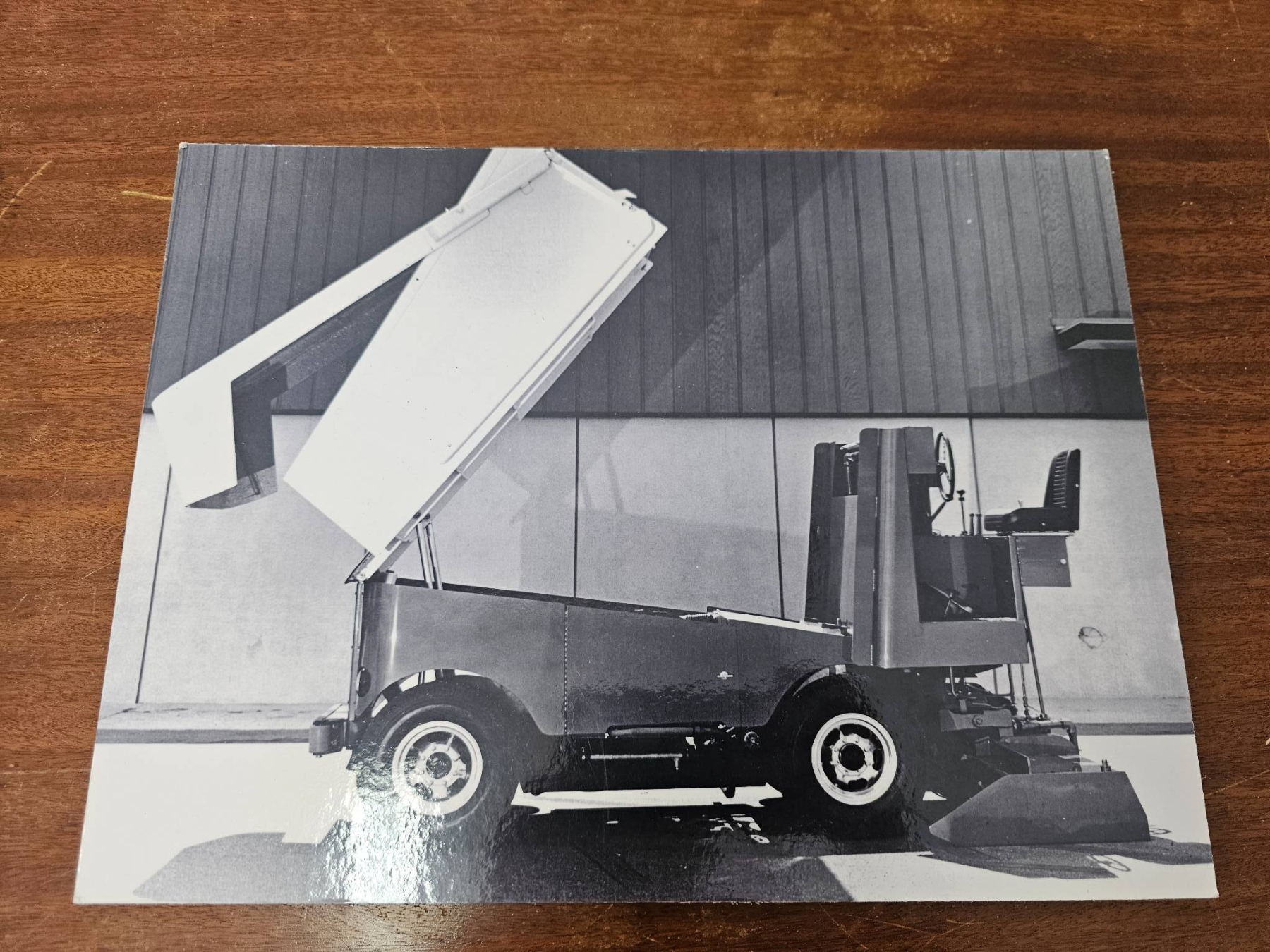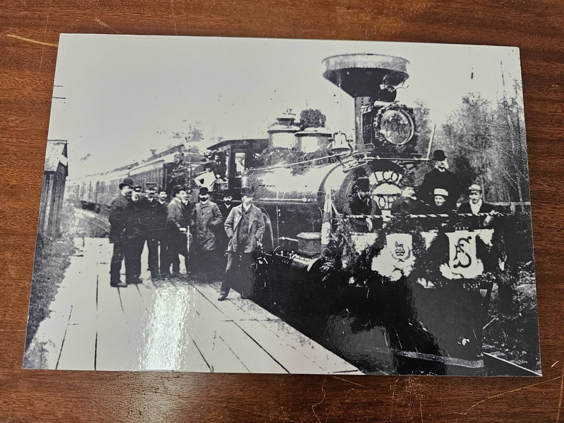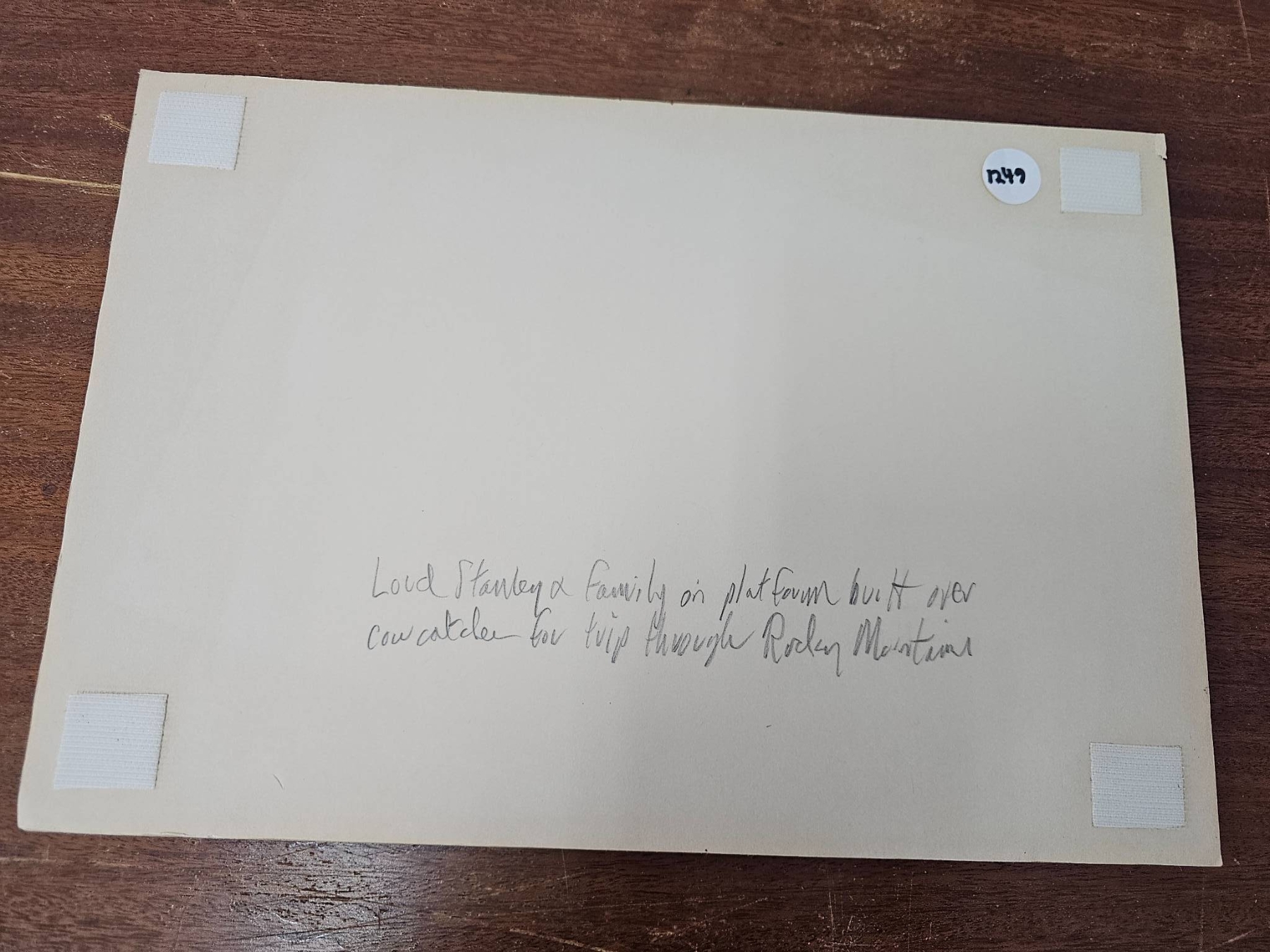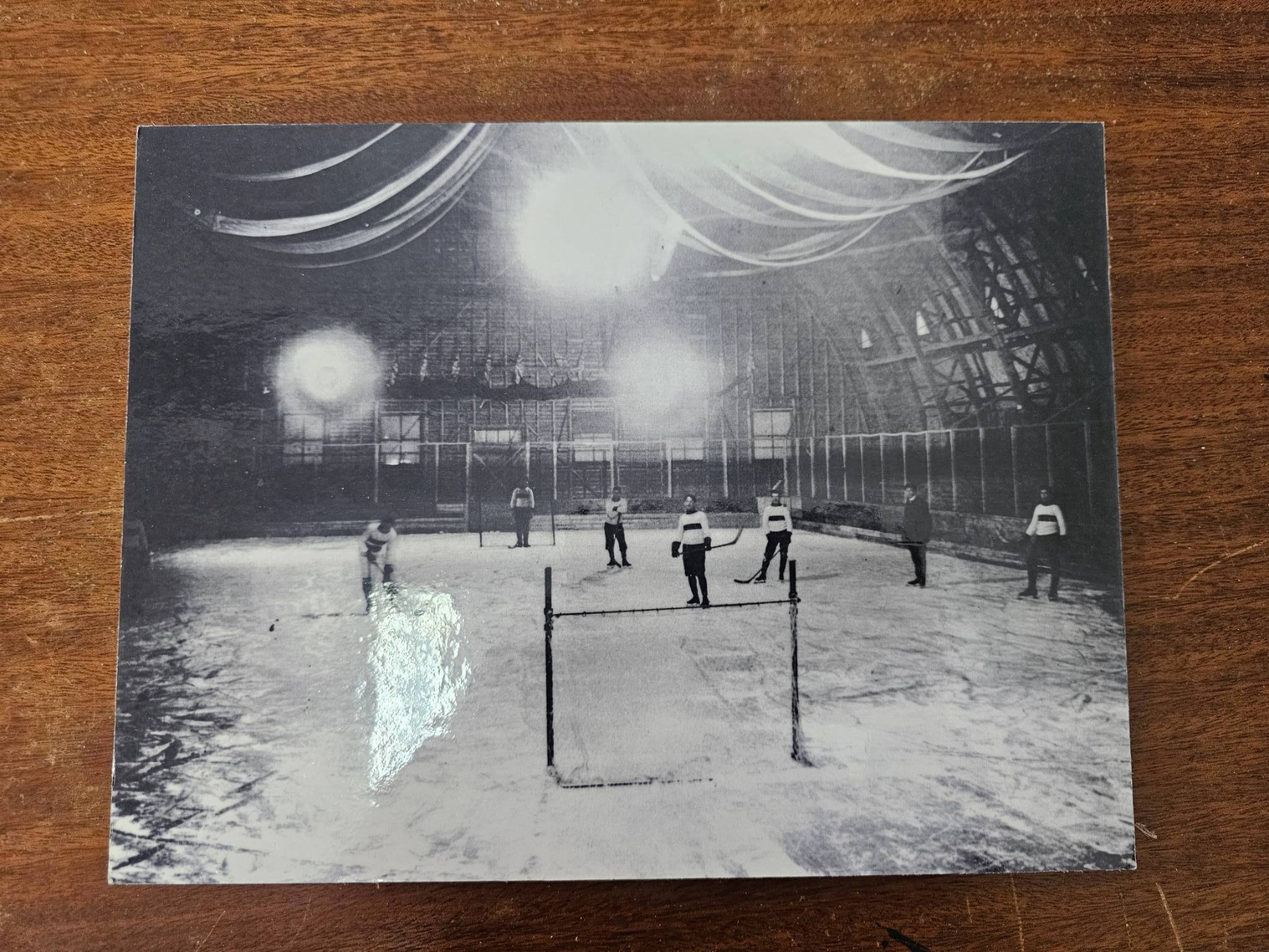 Collection includes four black-and-white photographs and a newspaper clipping titled 'Night the Cup Was Stolen.' Images depict scenes such as individuals near a vintage train, outdoor activity in snow, a hockey game, and a vehicle. The newspaper clipping references Ken McKenzie and a notable hockey-related event. Mounted and captioned on reverse. Items appear to have historical and sports significance.