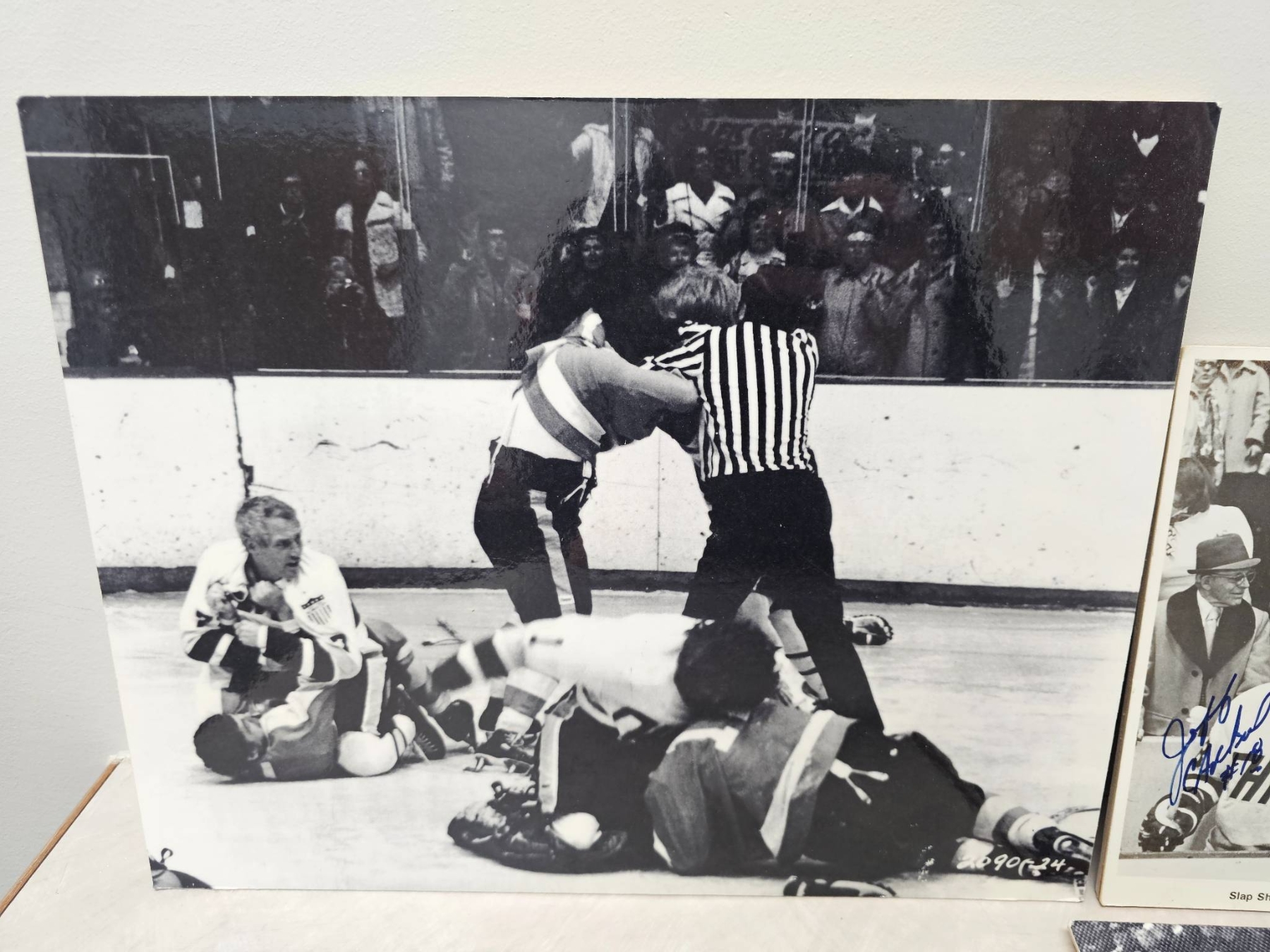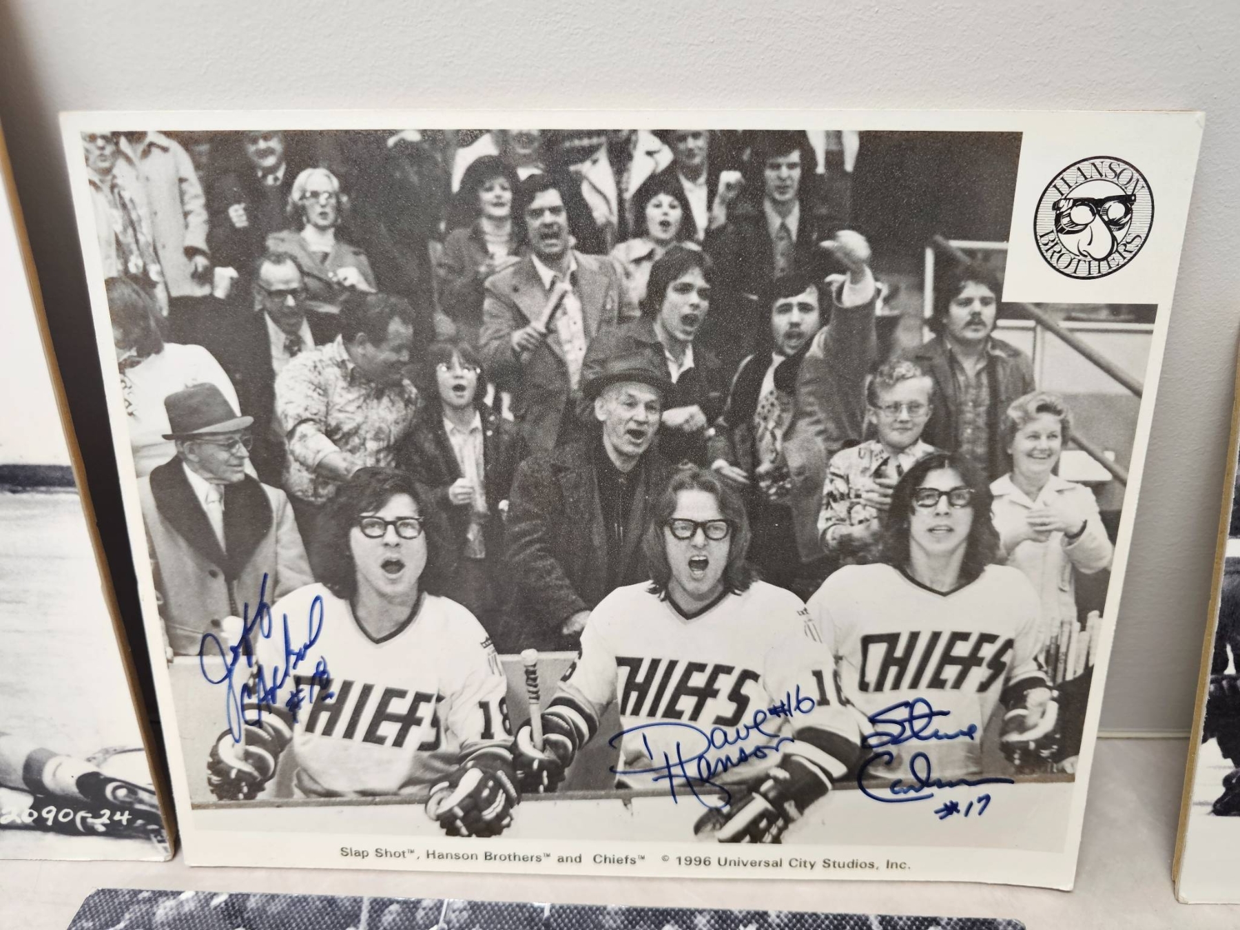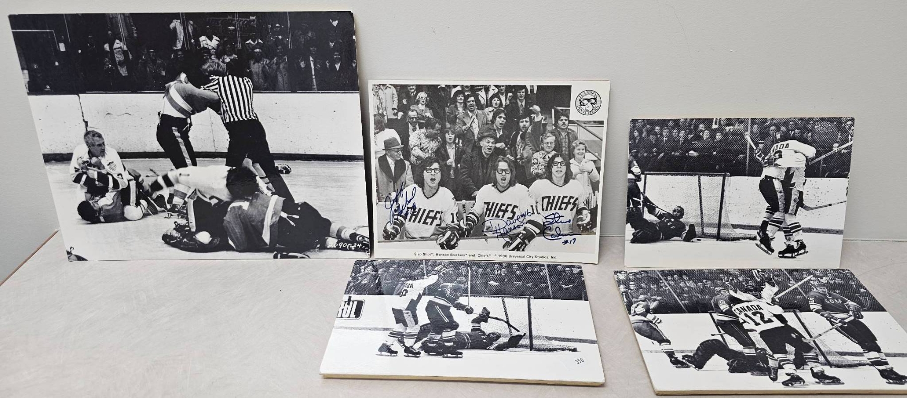 Black-and-white hockey-themed prints featuring dynamic game scenes, with one prominently showcasing the Hanson Brothers from the 1977 film "Slap Shot," signed with autographs. Prints include both candid moments and action shots; the signed print adds unique collector's value. Suitable for enthusiasts of hockey history or classic sports films.