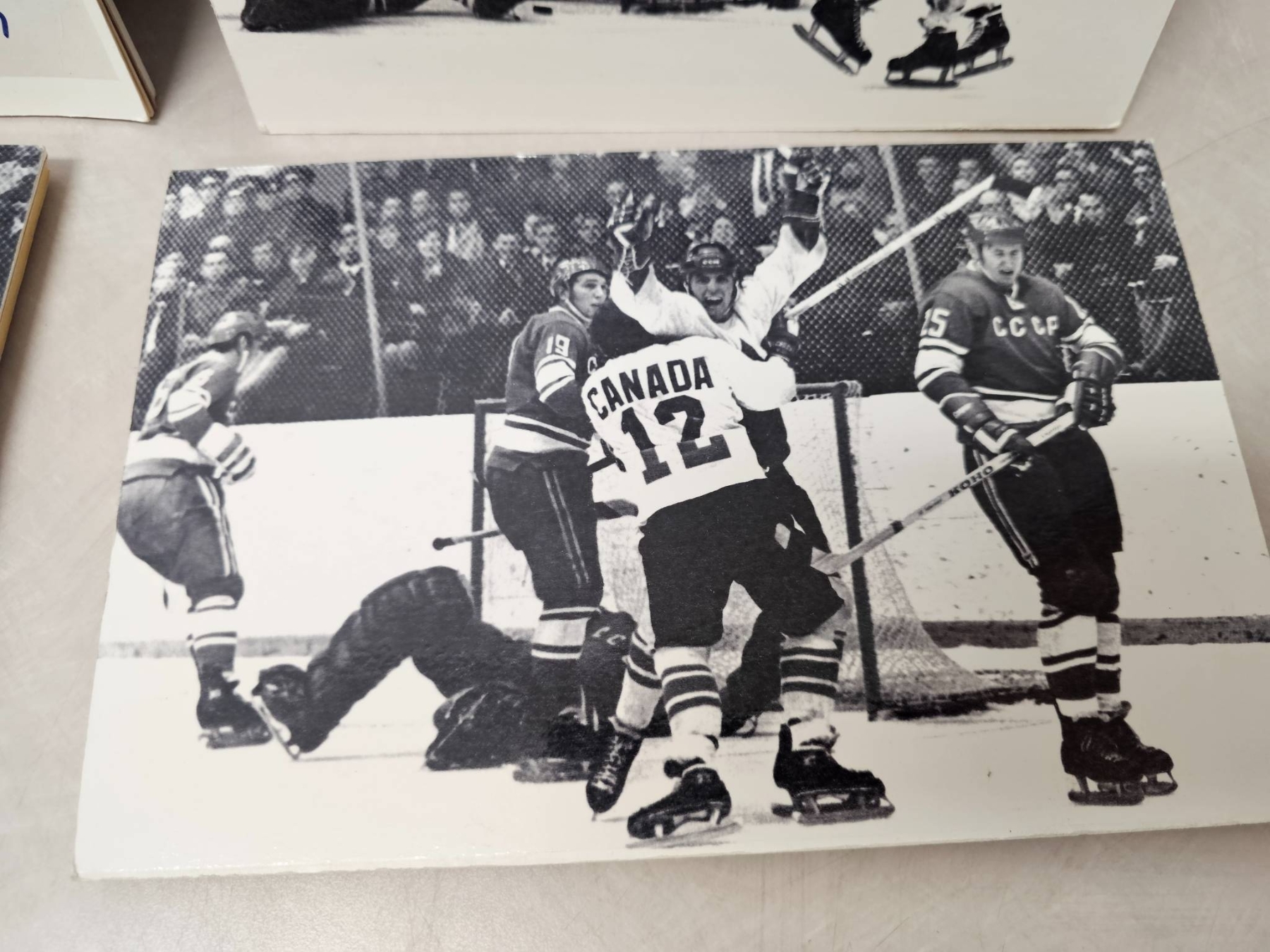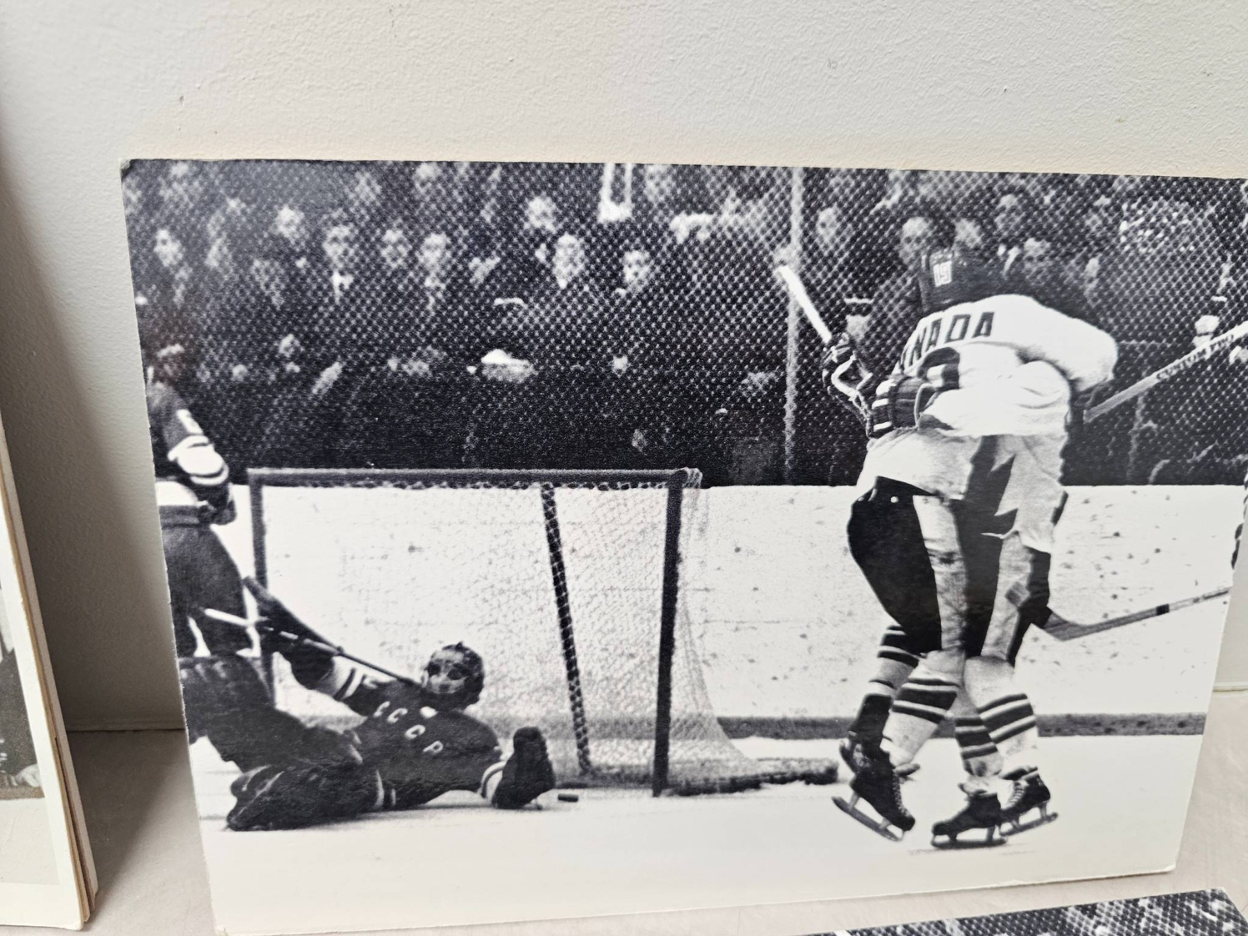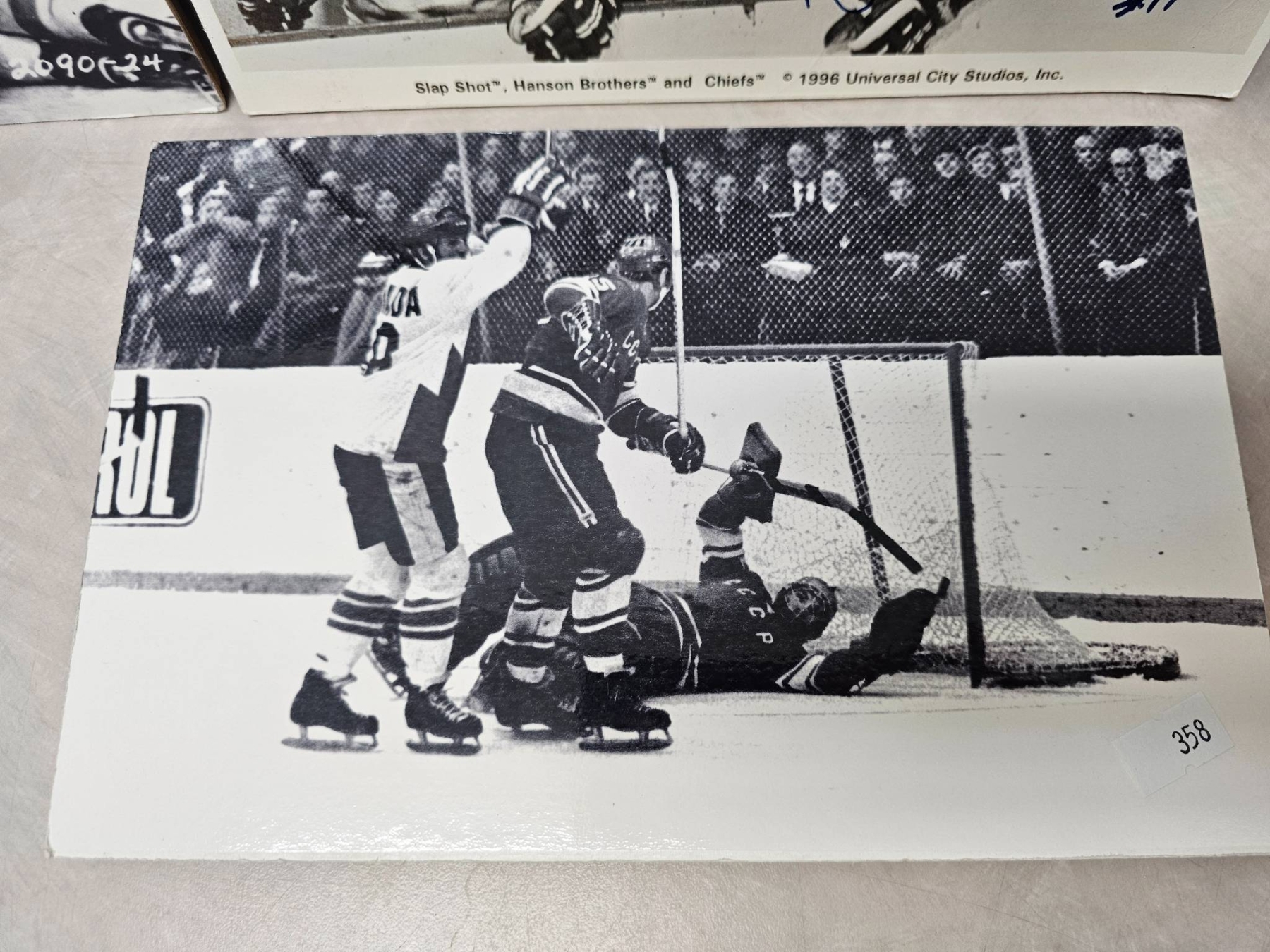 Black-and-white hockey-themed prints featuring dynamic game scenes, with one prominently showcasing the Hanson Brothers from the 1977 film "Slap Shot," signed with autographs. Prints include both candid moments and action shots; the signed print adds unique collector's value. Suitable for enthusiasts of hockey history or classic sports films.